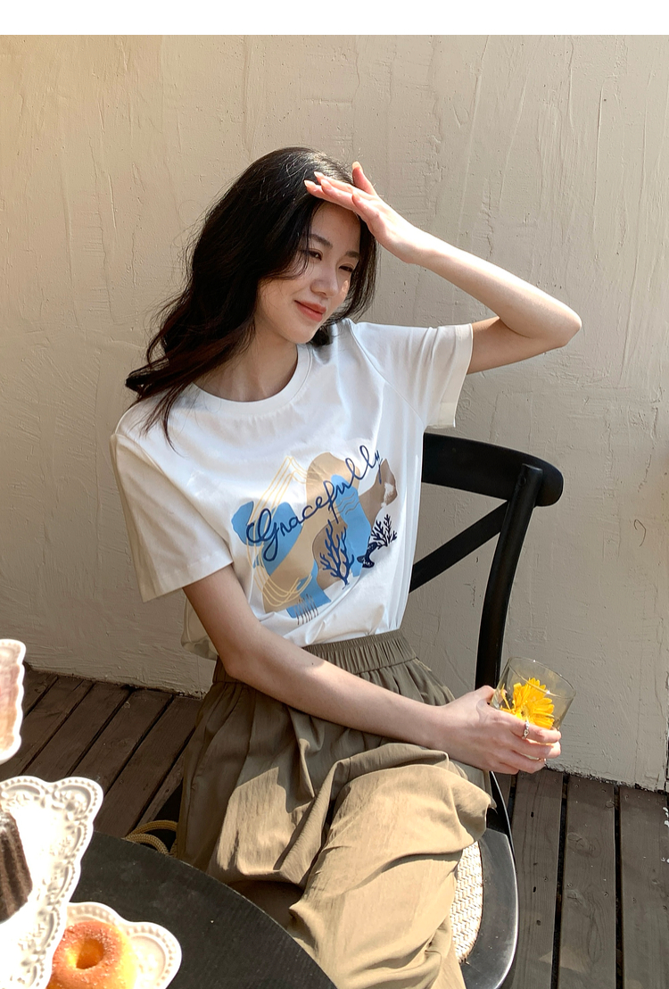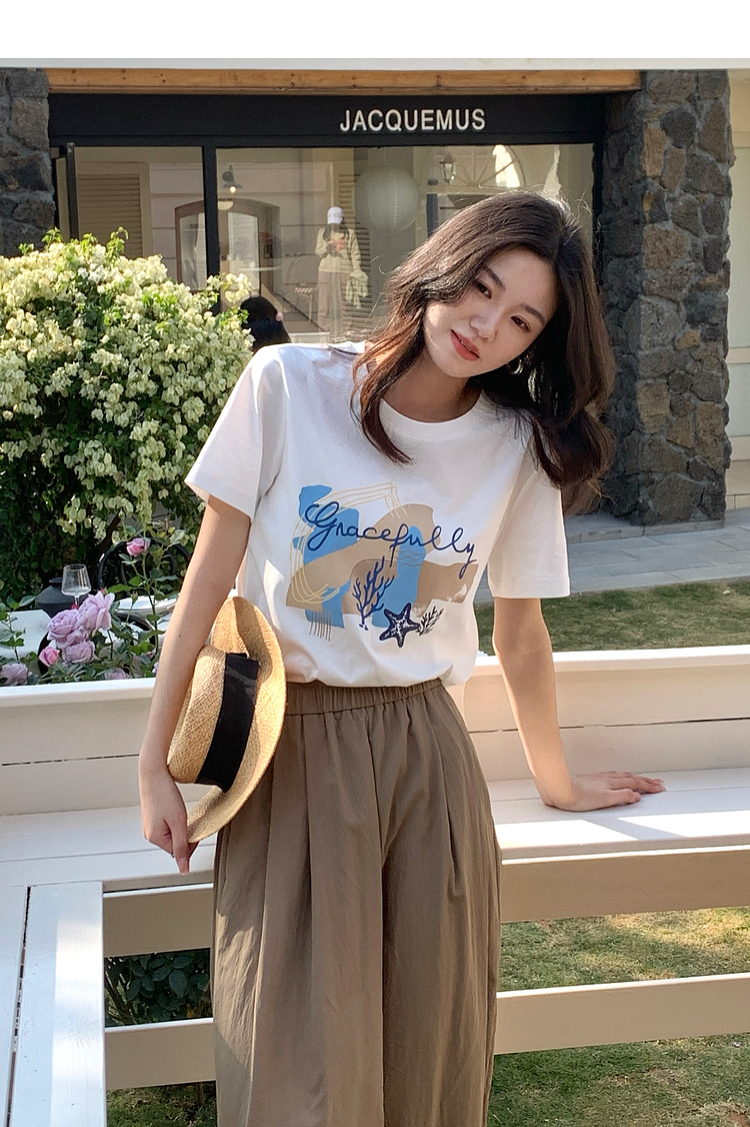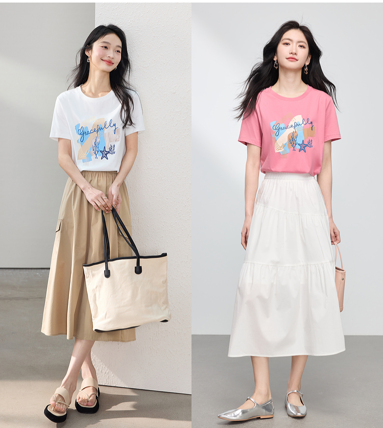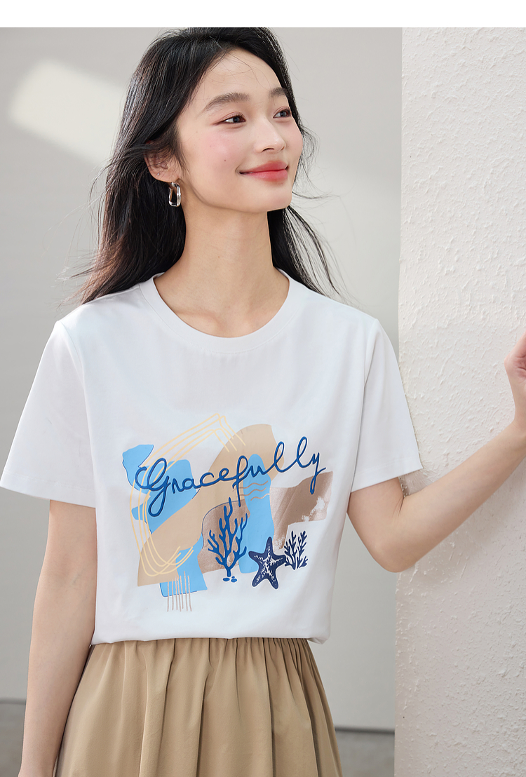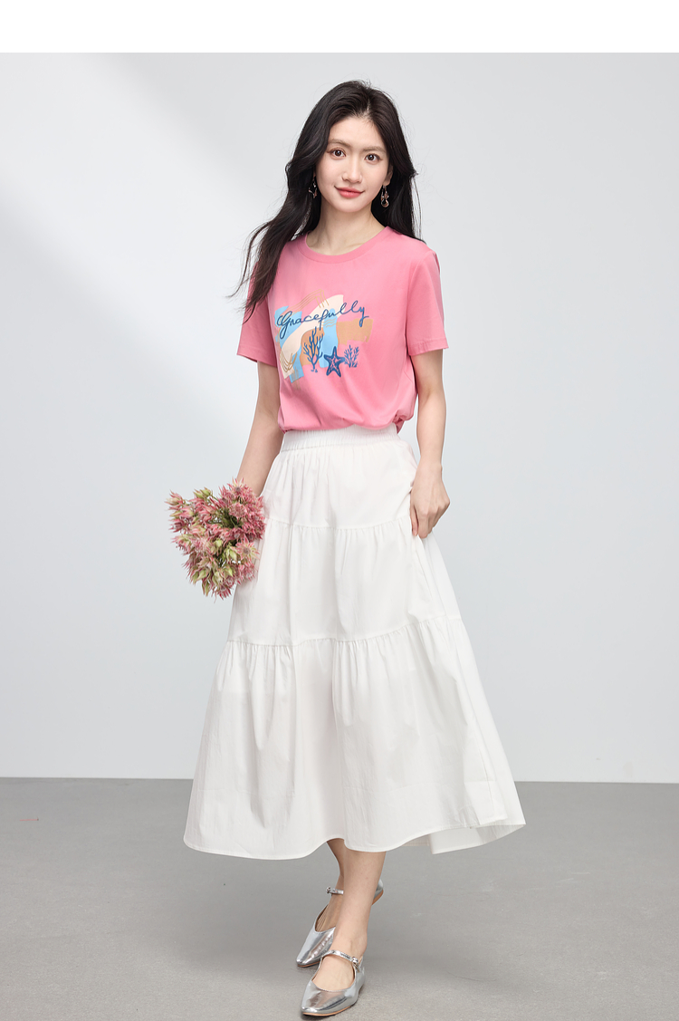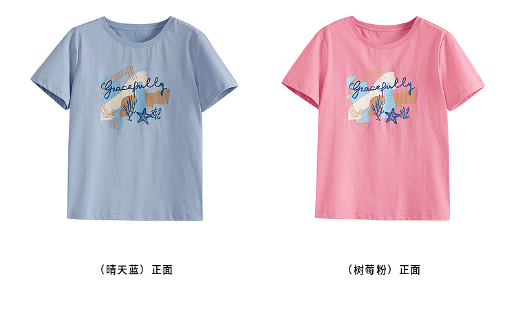 【专属特价】熙世界休闲印花体恤上衣女2025夏季新款时尚流行粉色短袖T恤正肩