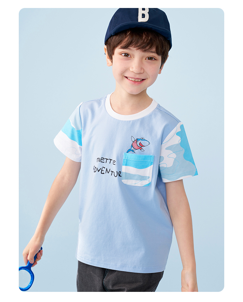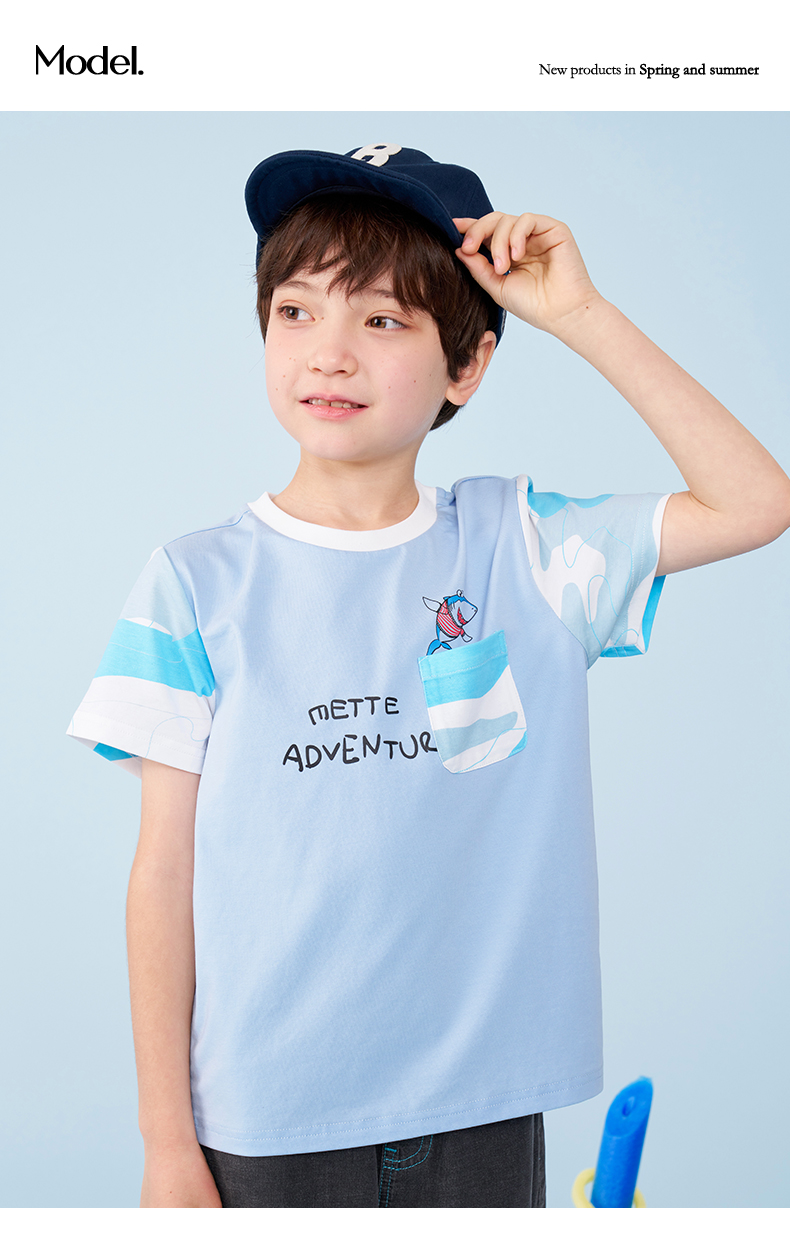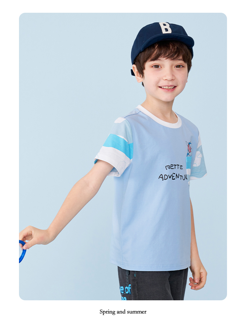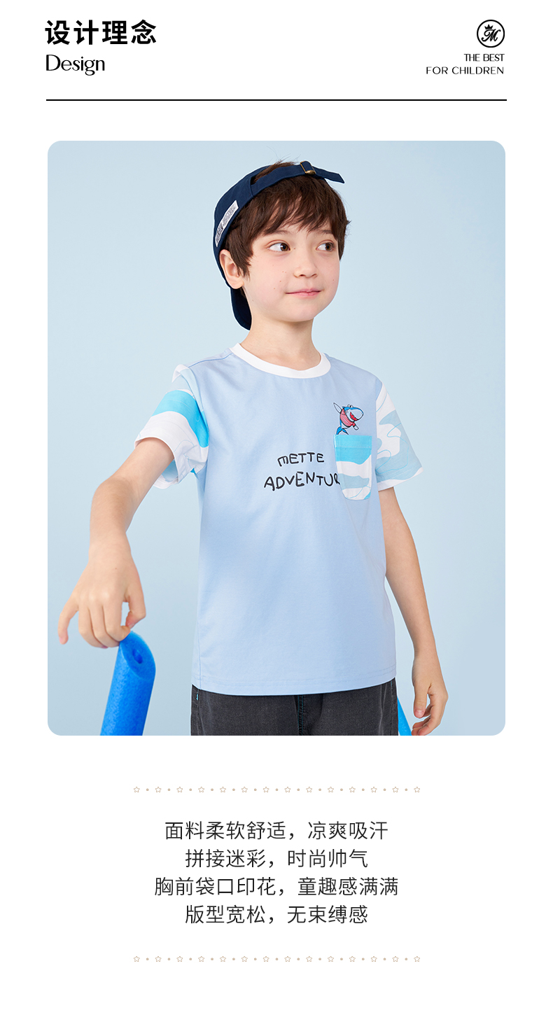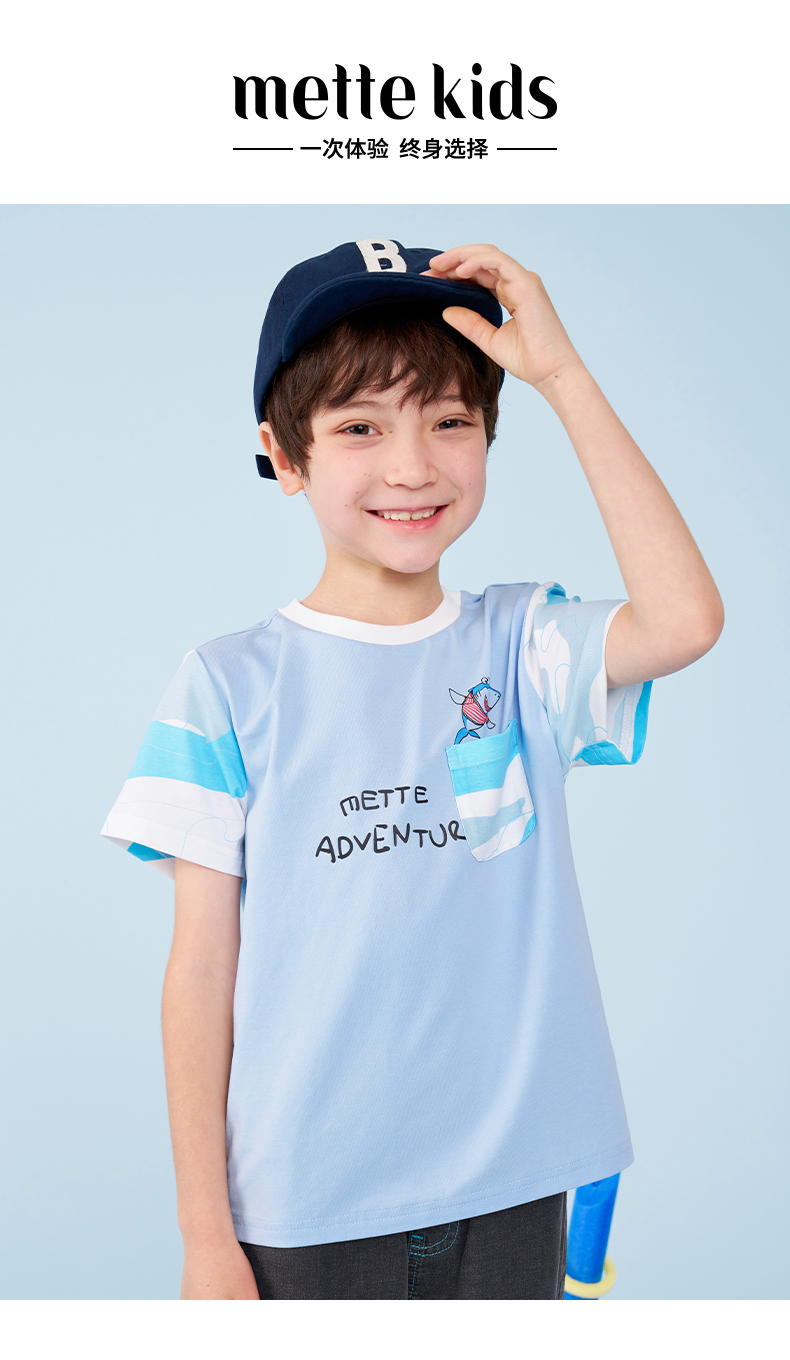 mettekids男童短袖t恤夏季休闲宽松蓝色童装男孩圆领洋气薄上衣