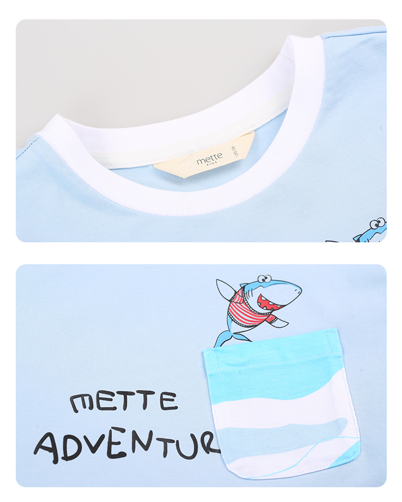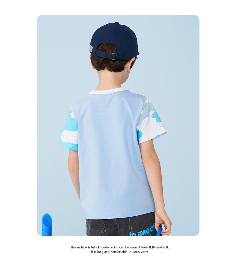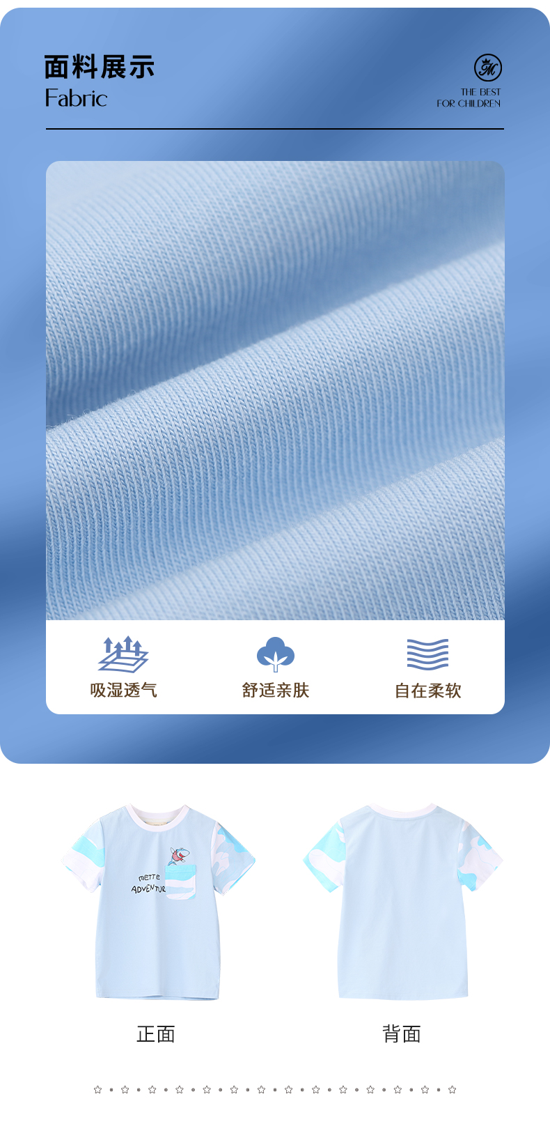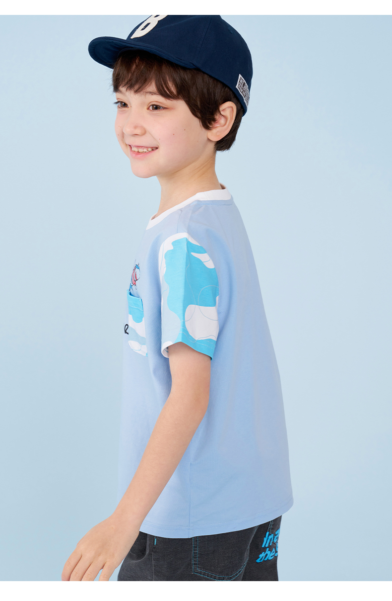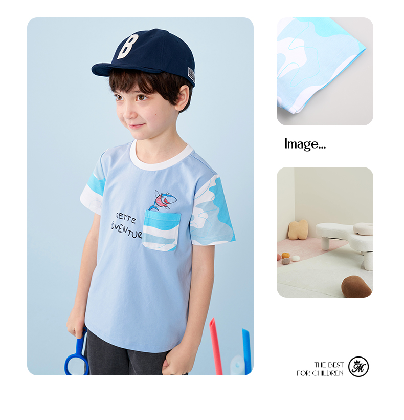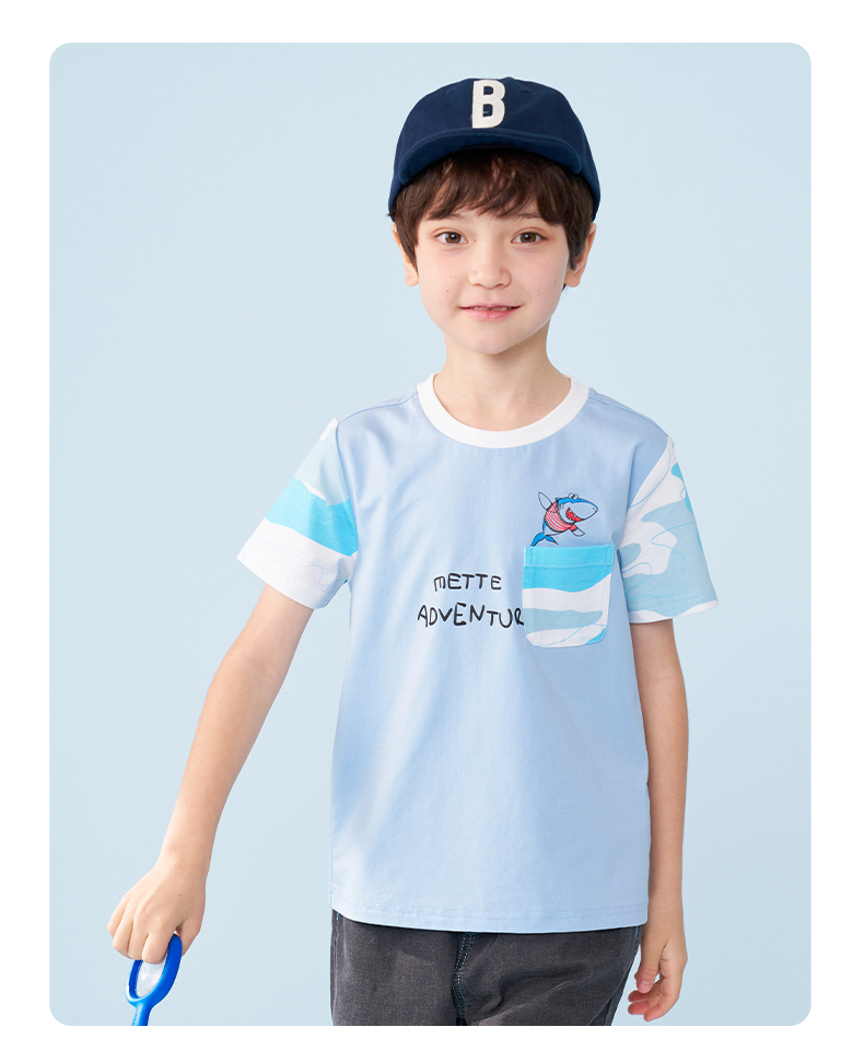 mettekids男童短袖t恤夏季休闲宽松蓝色童装男孩圆领洋气薄上衣
