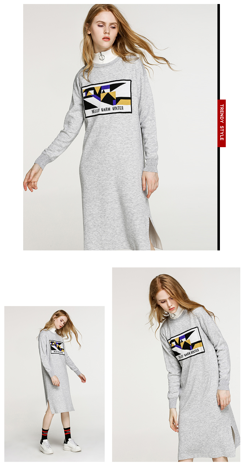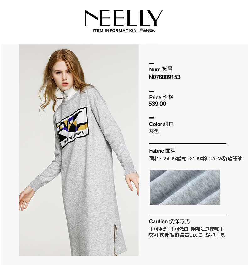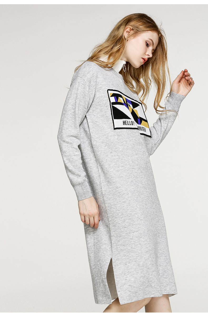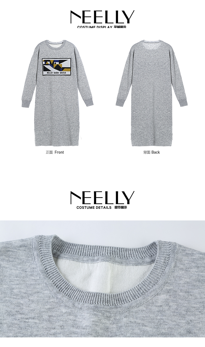 NEELLY/纳俪冬季新款中长款套头通勤开叉几何拼接针织连衣裙