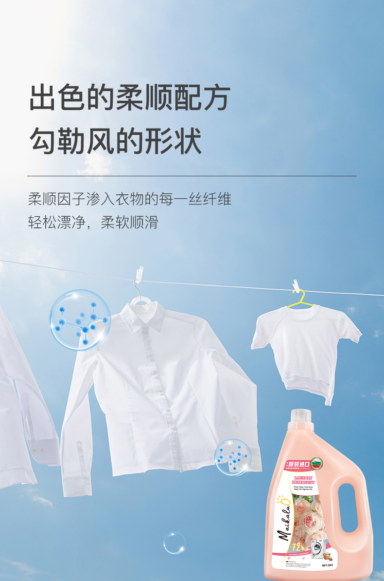 无磷配方,不添加荧光剂、漂白剂等有害化学成分,柔顺因子渗入衣物的每一丝纤维,让衣物柔软顺滑;