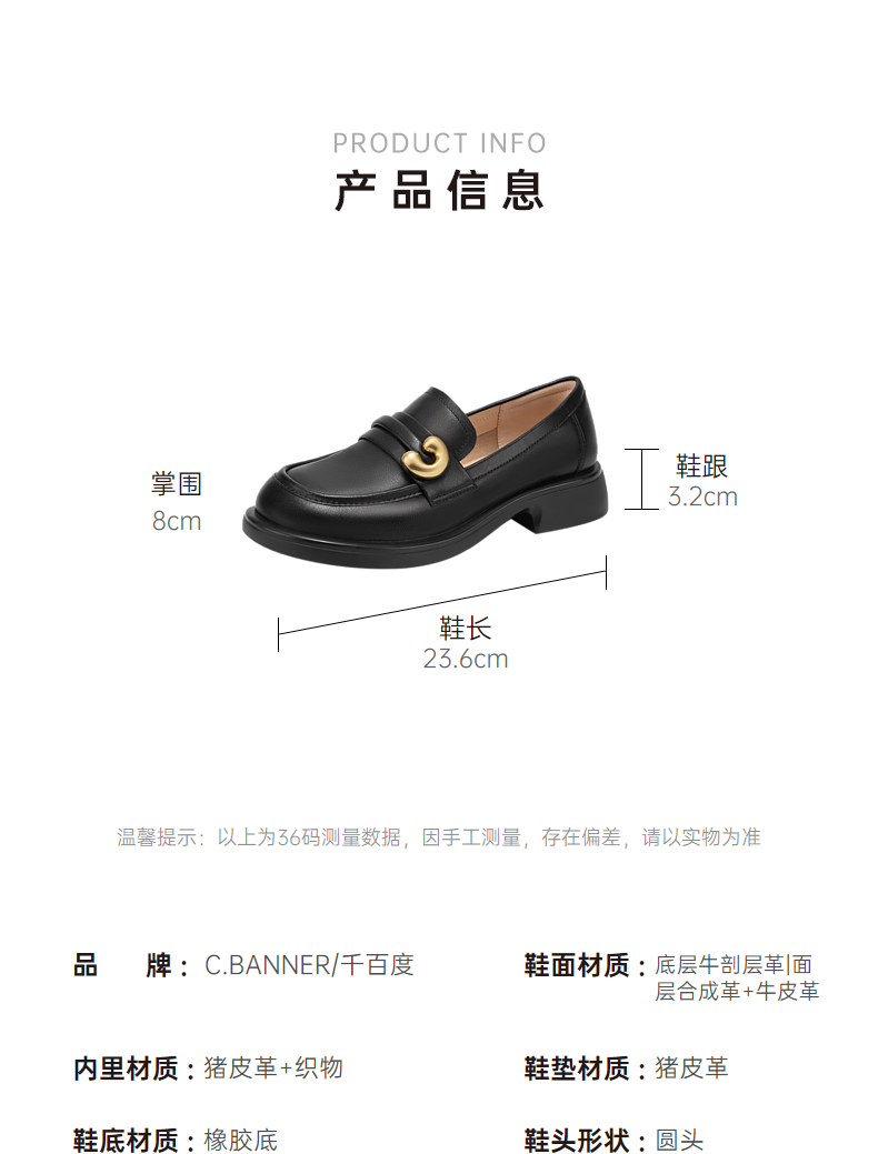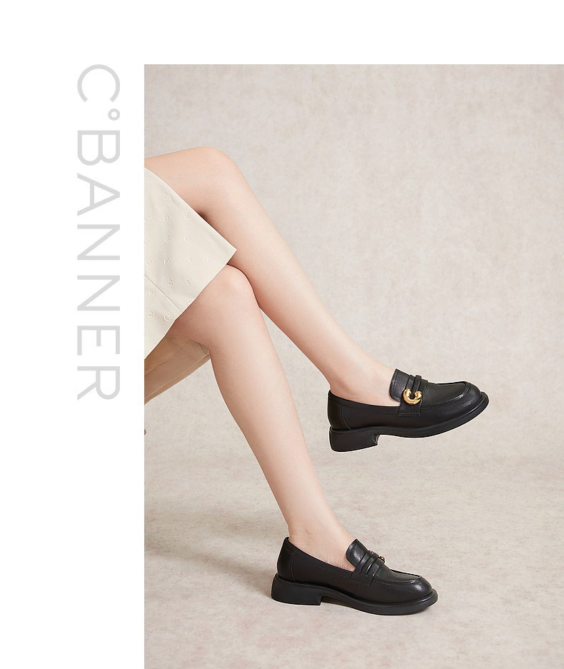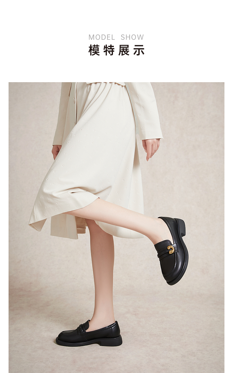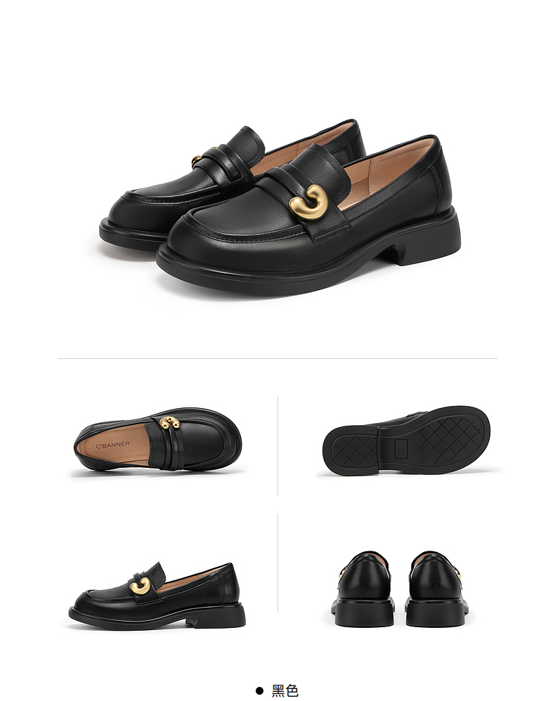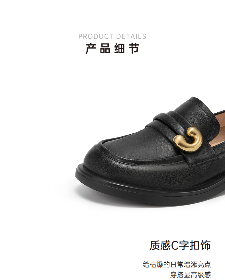 千百度通勤乐福鞋春季黑色小皮鞋中跟一脚蹬真皮正装单鞋A24132908