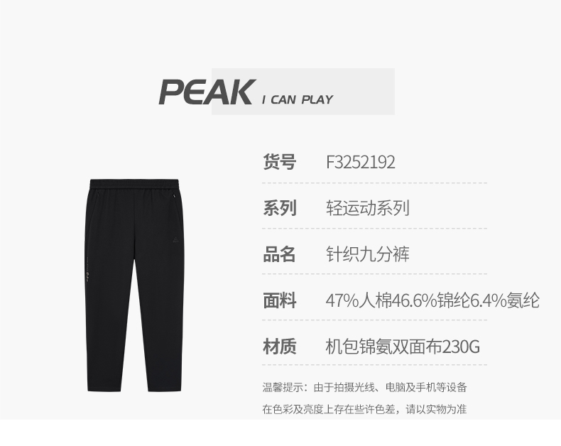 匹克2025年新款轻运动系列女款针织九分裤F3252192