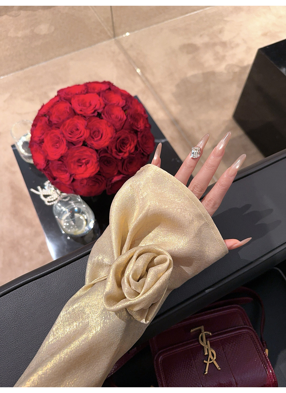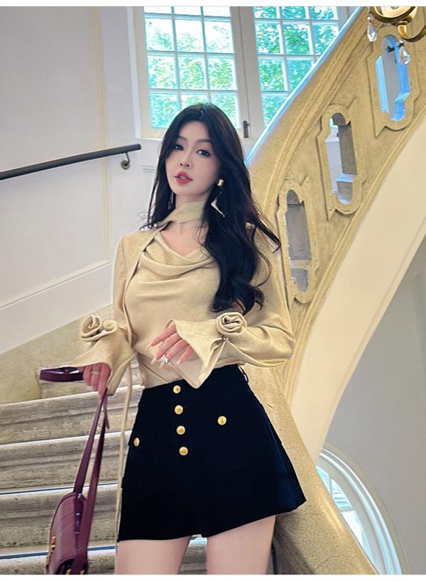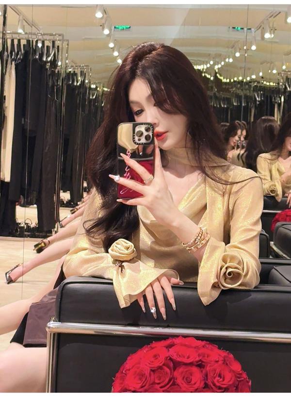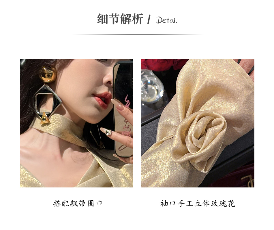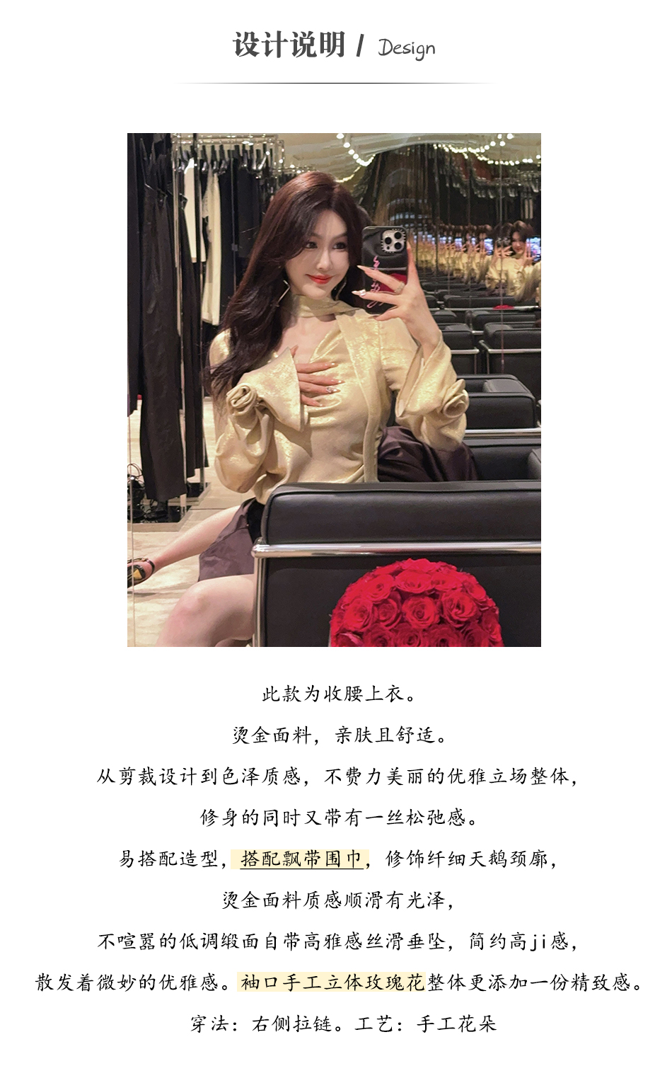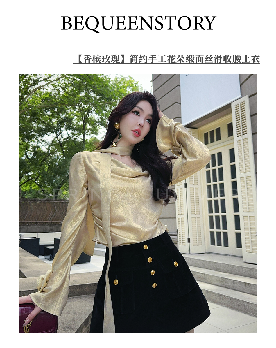 BeQueenStory【香槟玫瑰】时尚简约高级感手工花朵缎面丝滑收腰上衣
