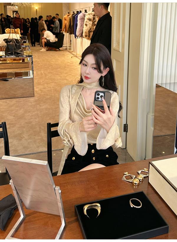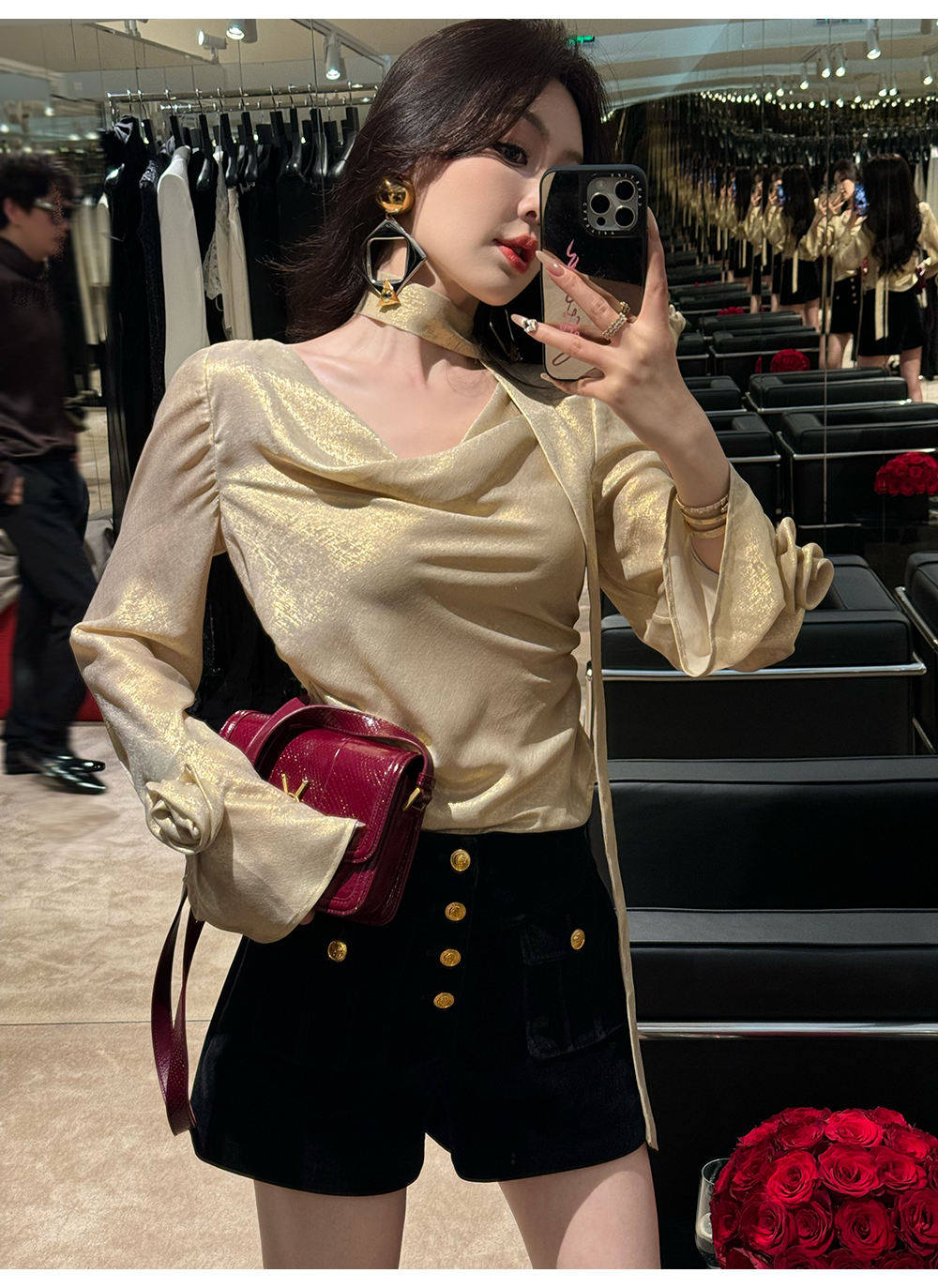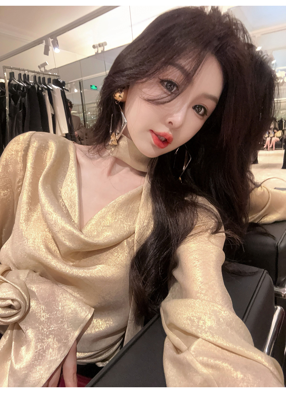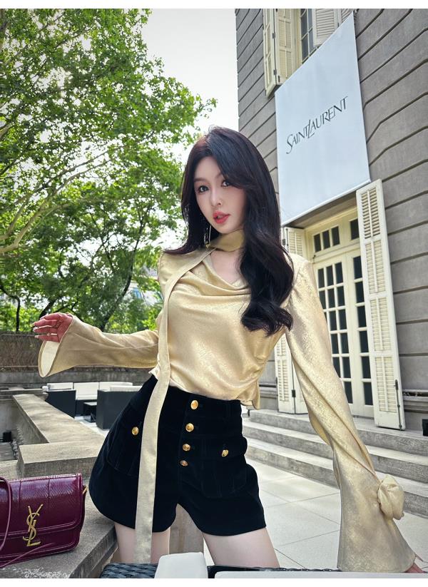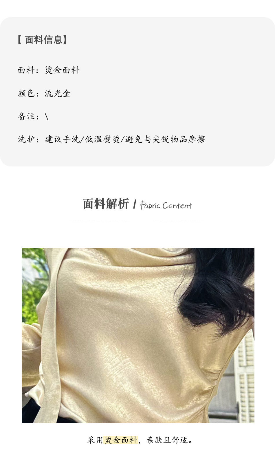 BeQueenStory【香槟玫瑰】时尚简约高级感手工花朵缎面丝滑收腰上衣