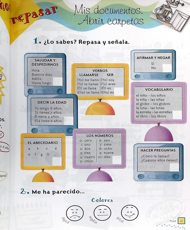 每个单元的结构是由三个内容演示课和四个复习和评估页组成的。每一节演示课都占了相关内容的两页。每个单元的后四页由以下固定部分组成: 学生用书: - De Paseo por.... 介绍了马德里的不同地方,并提出了与世界上其他城市有关的活动。- 而现在... 我们的项目:提出了一个任务,以实践在主题部分所学到的一切。- 阅读角:按章节排列的漫画。- 我的文件。打开的文件夹:回顾部分,介绍了所学内容的摘要。活动笔记本: - 漫步在... - 青蛙的飞跃:对主题板块的内容进行正确造句的练习 - 让我们回顾一下。