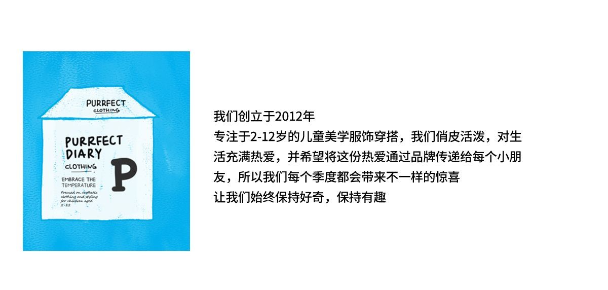 - Purrfect-Diary专注于贴近自然随性的穿着概念,轻奢平价的童装文化传播,在产品设计上更加注重婴童穿着的舒适性、安全性、更出众的国际化品牌,将欧美的育婴文化在中国进行深入的传播与推广。
