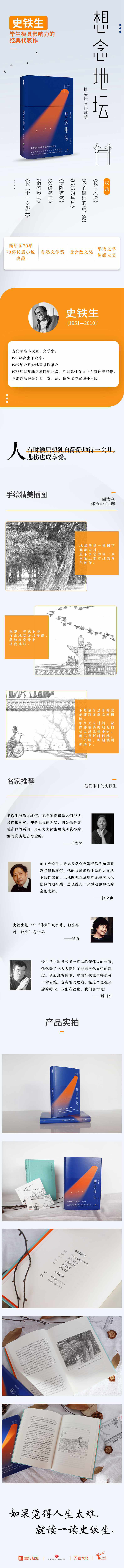 《想念地坛》共分散文与随笔、中短篇小说、长篇小说三辑,收录了当代著名文学家史铁生写作生涯中各个时期不同种类的经典作品,既收入了《我与地坛》《我二十一岁那年》《病隙碎笔》等经典散文随笔名篇,又收入了《我的遥远的清平湾》《命若琴弦》《奶奶的星星》等经典中短篇小说代表作。这些作品,以作者的亲身经历为蓝本,字里行间透露着温情,用凝练质朴的语言,表达了深沉的情感,传递了理性的哲思,他对生与死、困境与信仰、理想与现实的关注,成为穿透迷雾的一束光,照亮了无数迷惘前行的人。