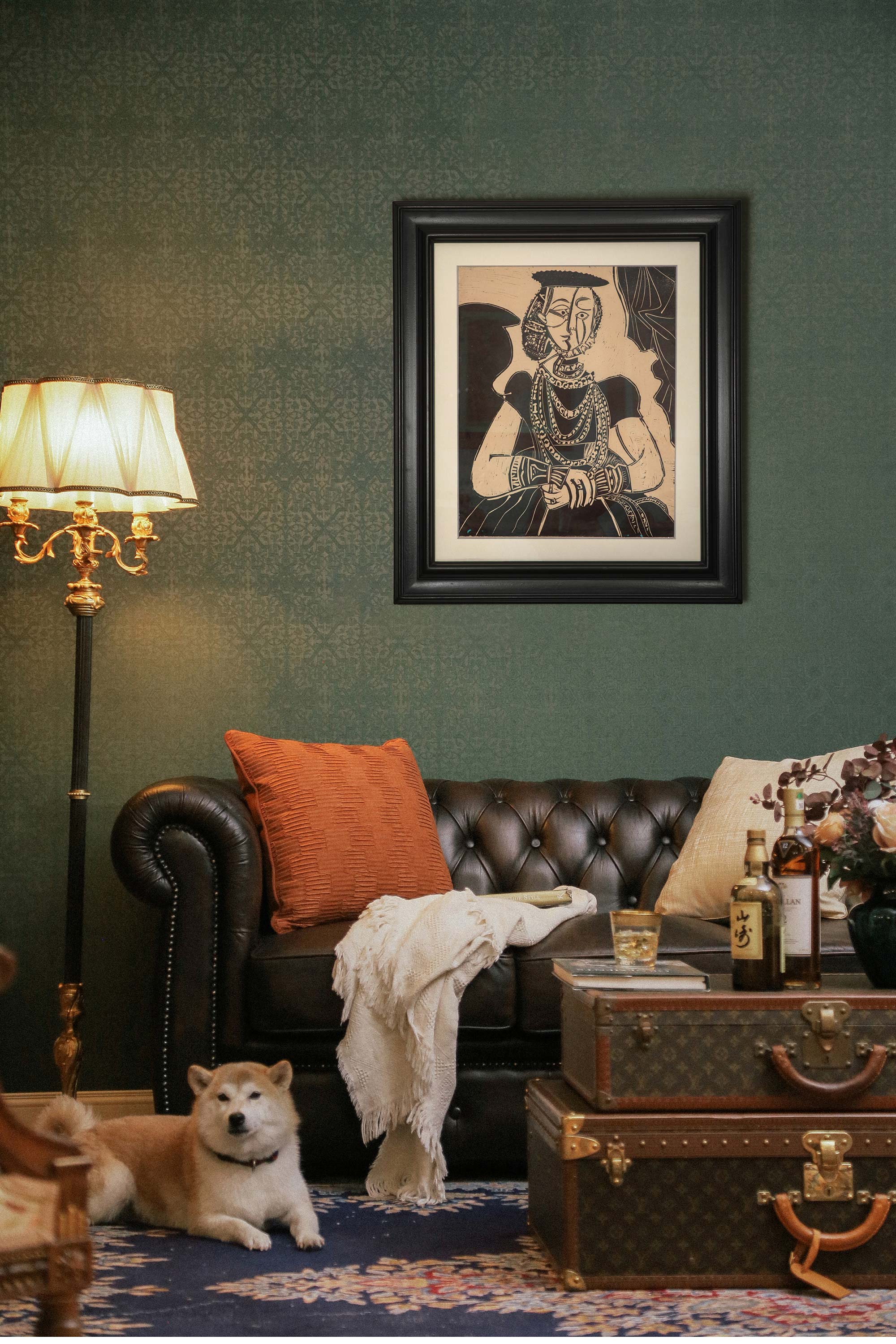独角鹿西洋古董 1958年西班牙艺术画家创作出品限量麻胶版画《年轻女子肖像·追随克拉纳赫》