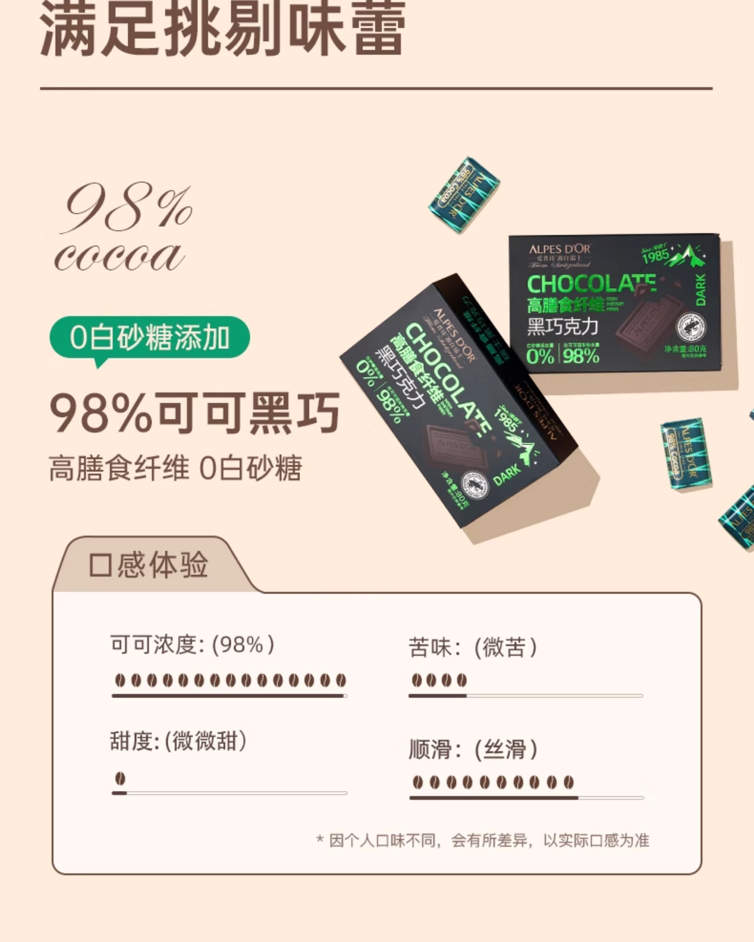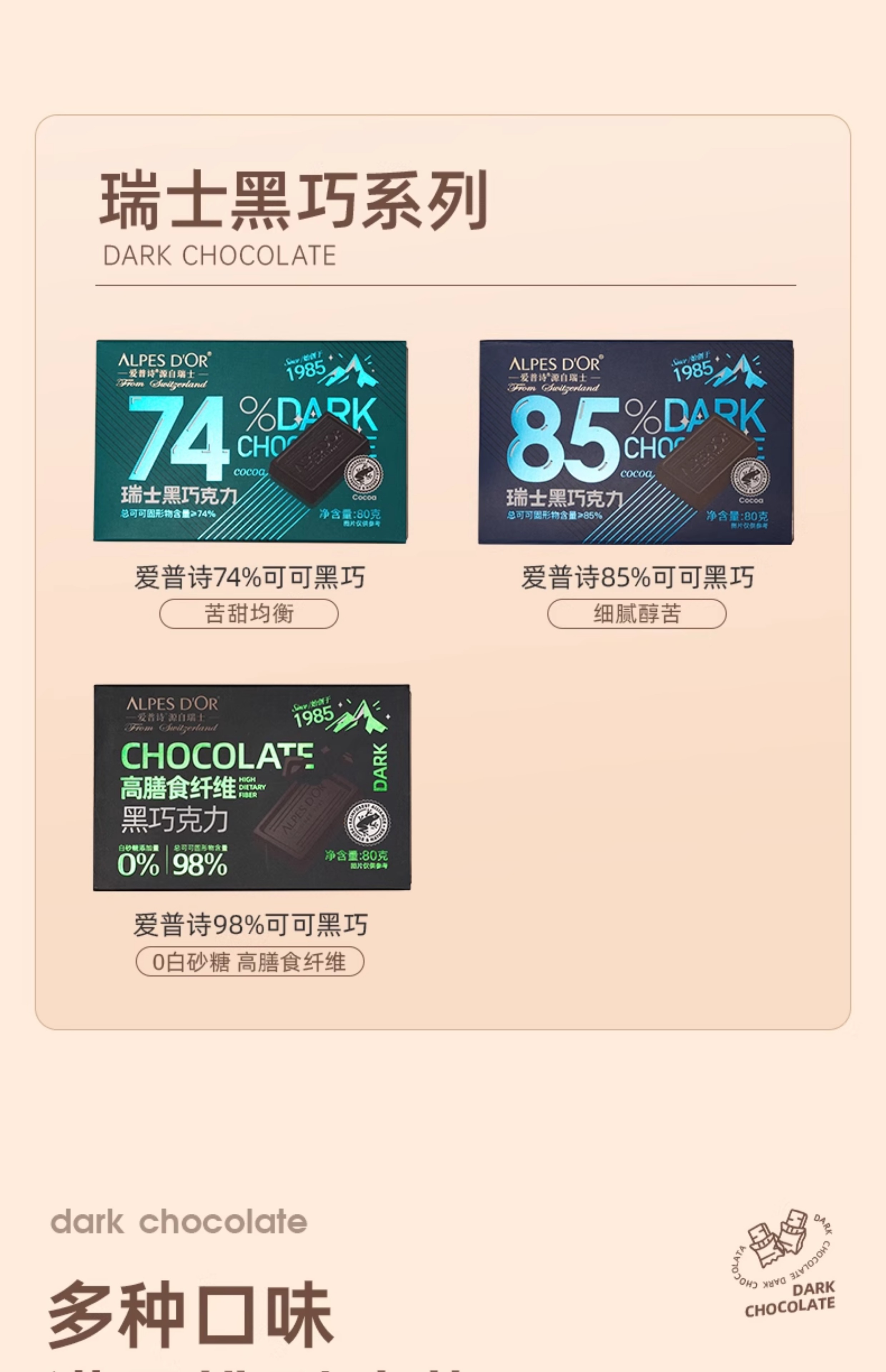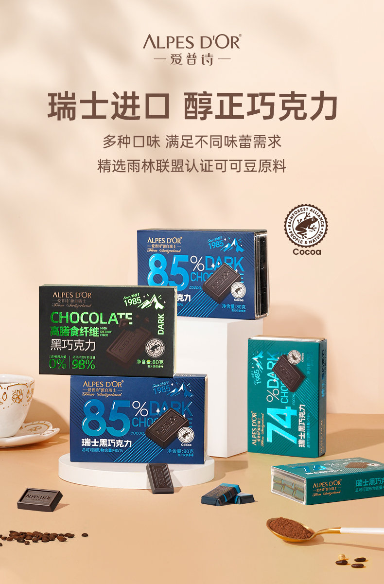 【中欧班列精选】瑞士爱普诗巧克力 原装进口Alpes d'Or爱普诗98%的高膳食纤维黑巧塑料透明盒80g/盒