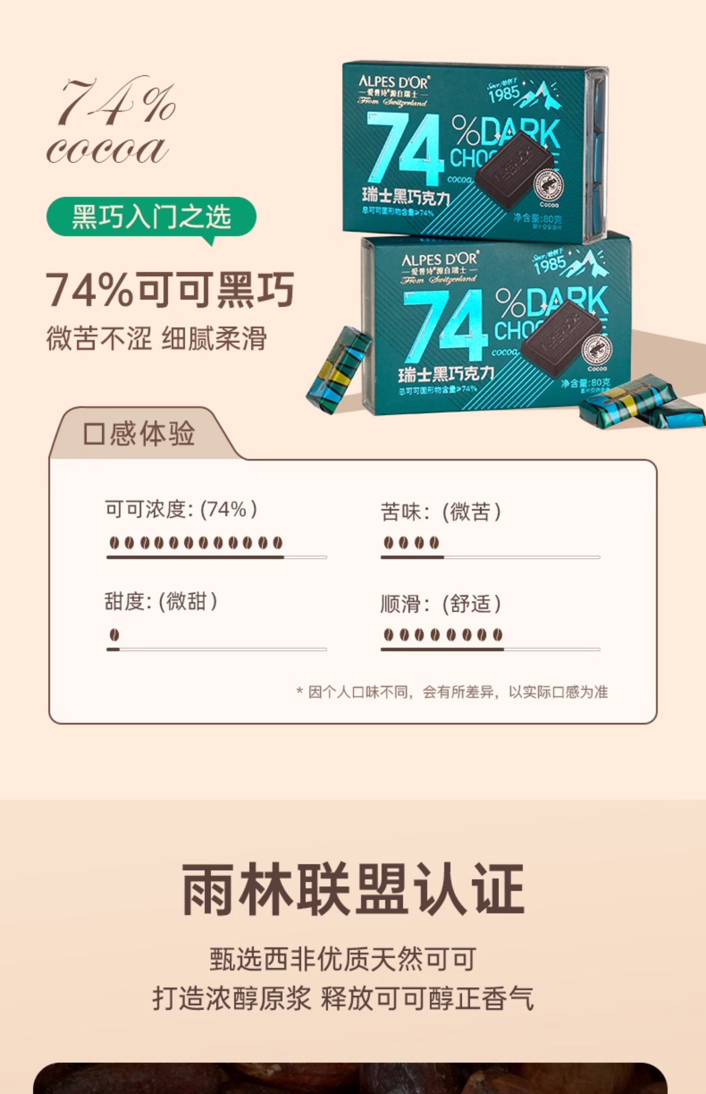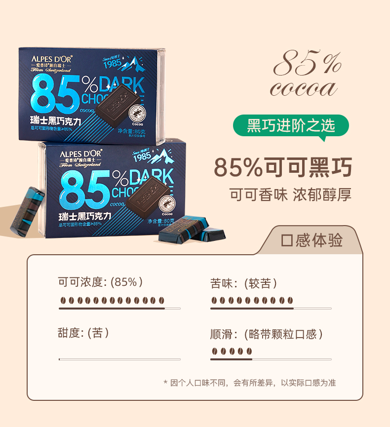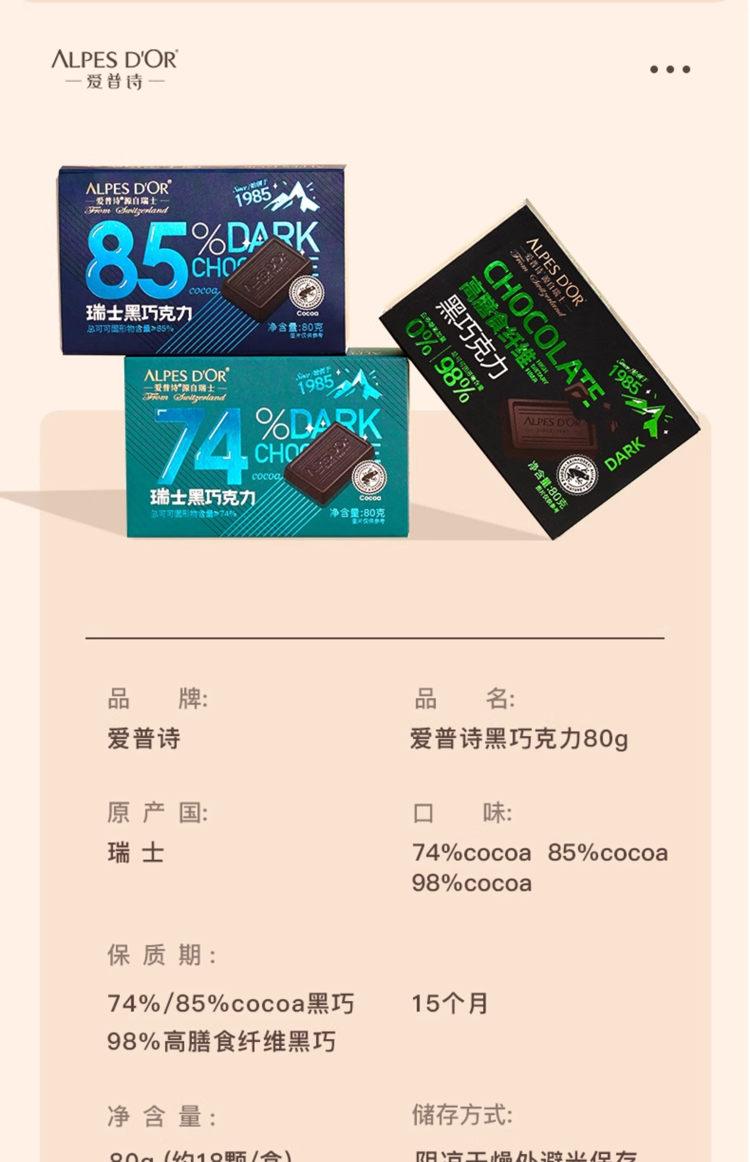 【中欧班列精选】瑞士爱普诗巧克力 原装进口Alpes d'Or爱普诗98%的高膳食纤维黑巧塑料透明盒80g/盒