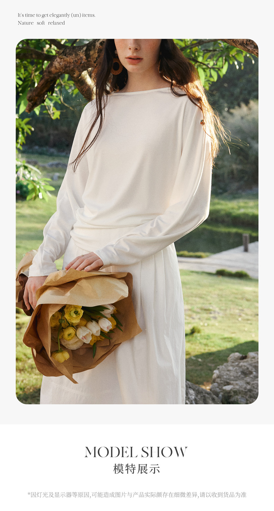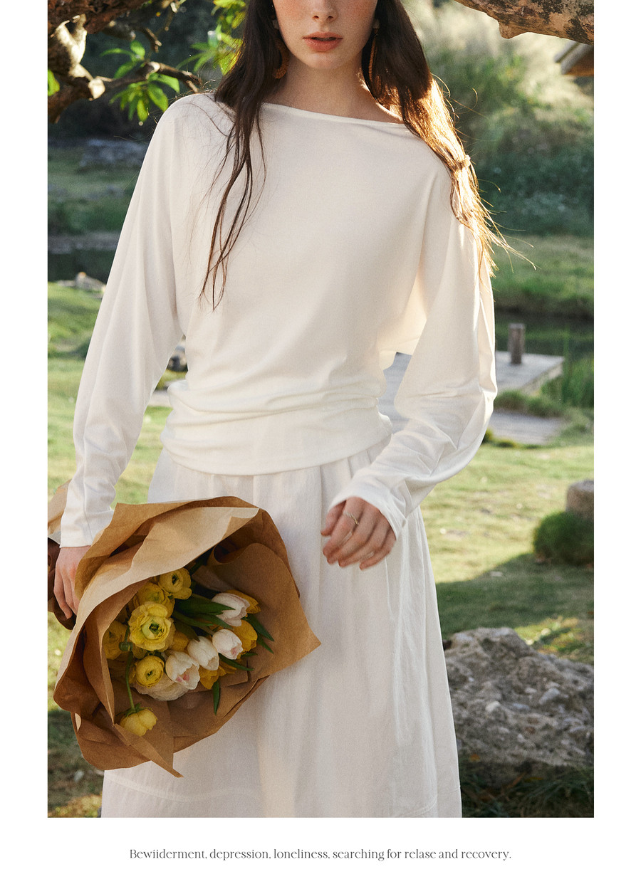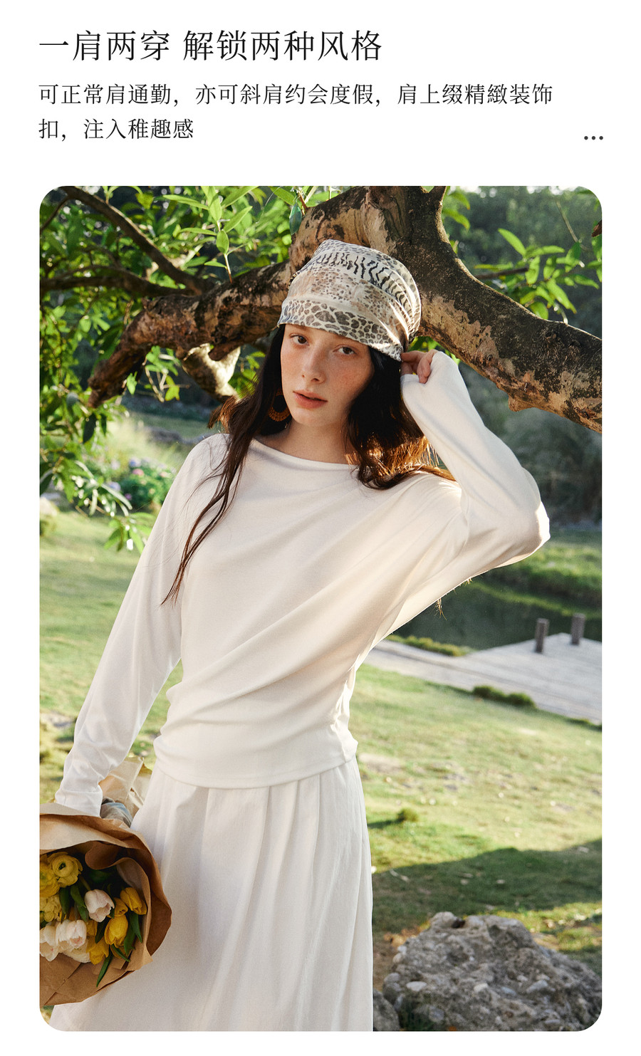 欧芮儿2026春新款天丝一字上衣领套头宽松藏肉蝙蝠袖T恤女长袖