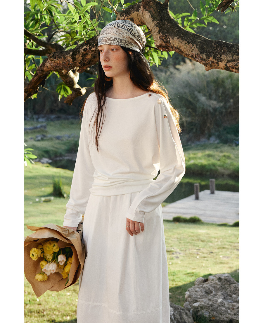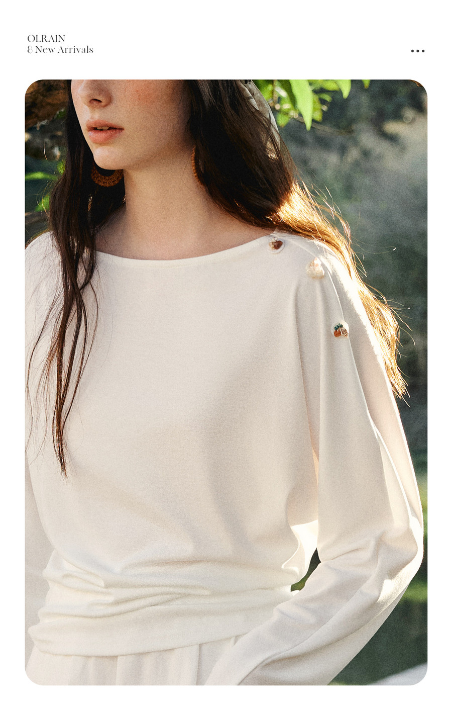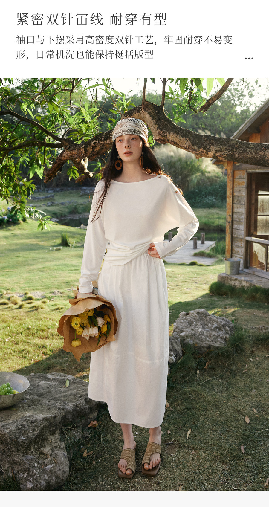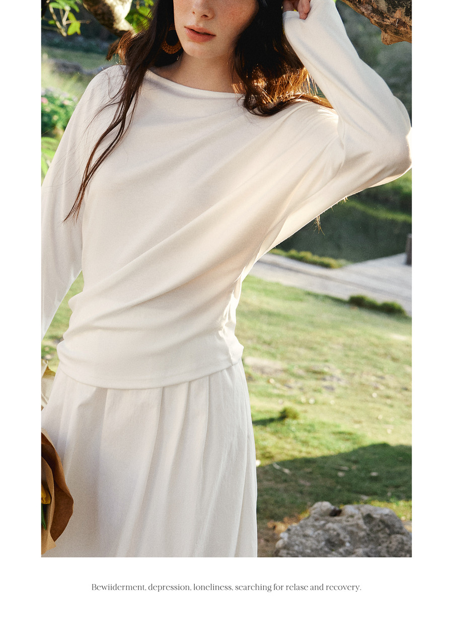 欧芮儿2026春新款天丝一字上衣领套头宽松藏肉蝙蝠袖T恤女长袖