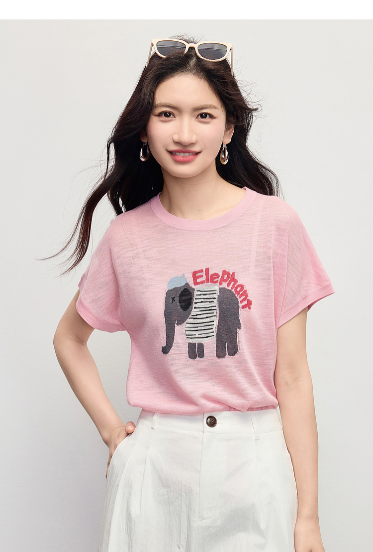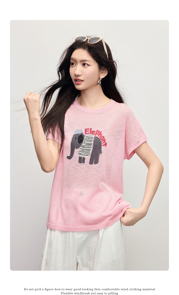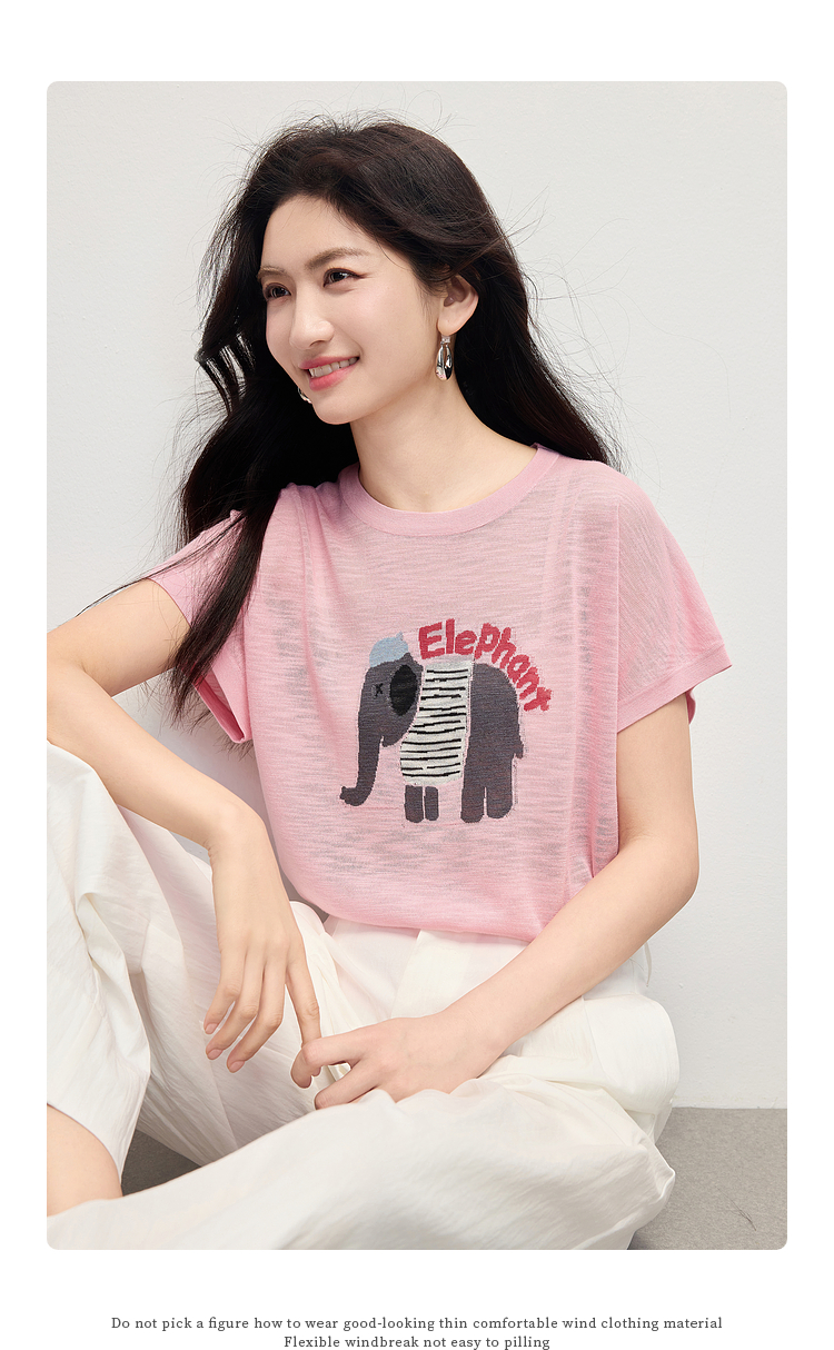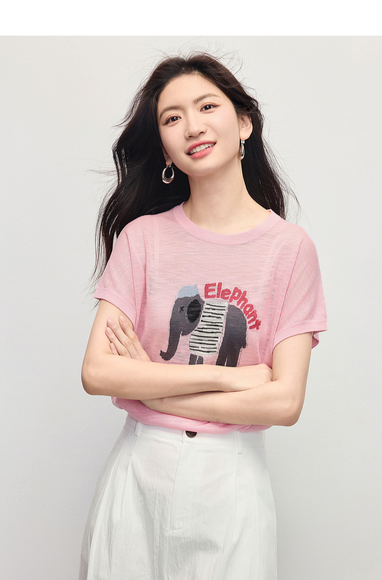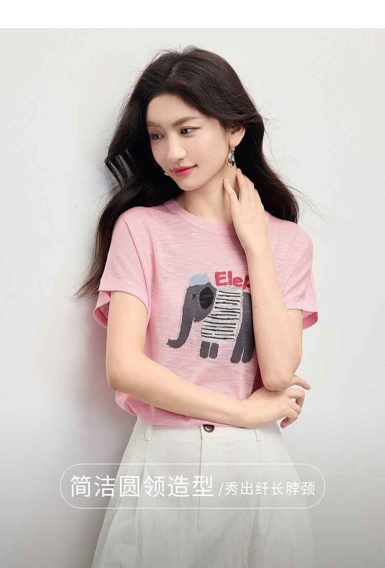 【周末秒杀】熙世界大象提花冰丝针织衫女薄款2025夏新款宽松圆领短袖T恤上衣