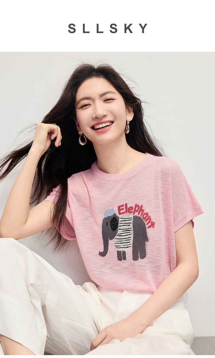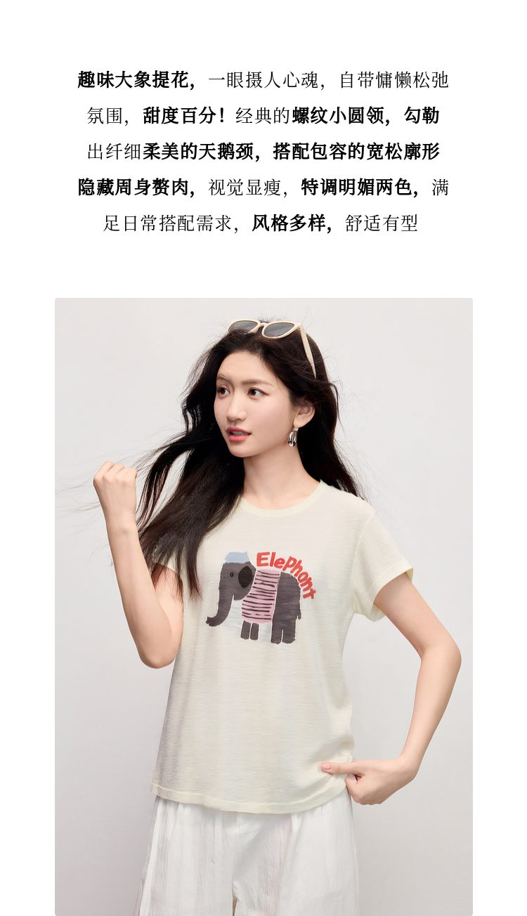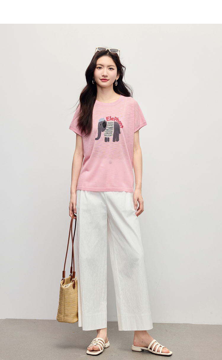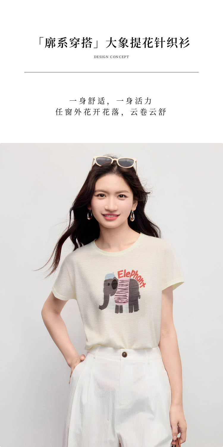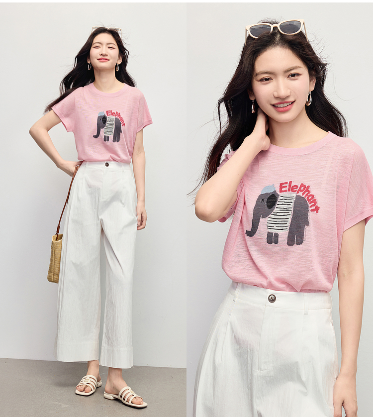 【周末秒杀】熙世界大象提花冰丝针织衫女薄款2025夏新款宽松圆领短袖T恤上衣