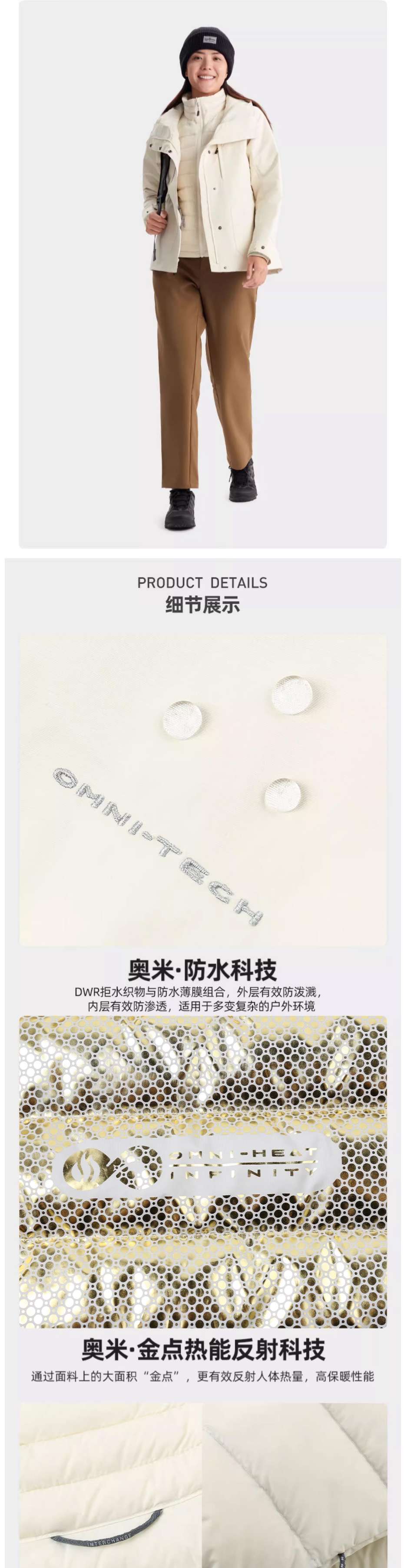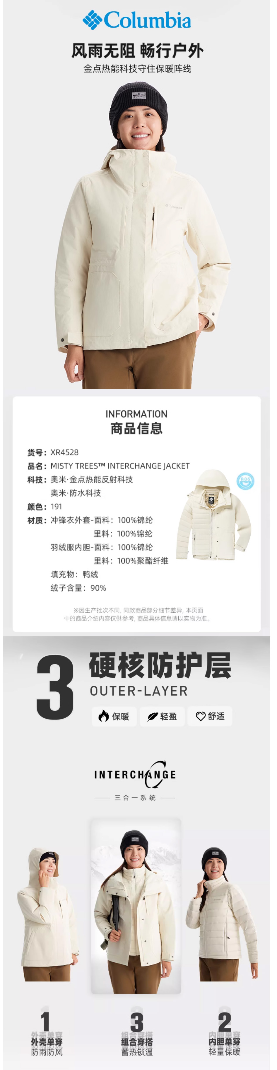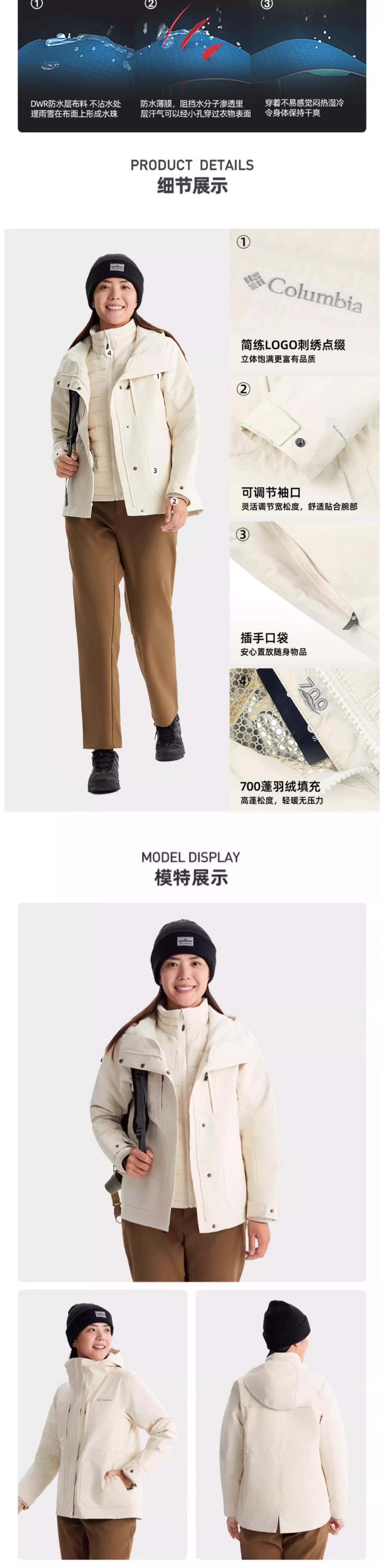 哥伦比亚户外上衣女金点三合一防水冲锋衣700蓬鸭绒羽绒服XR4528191