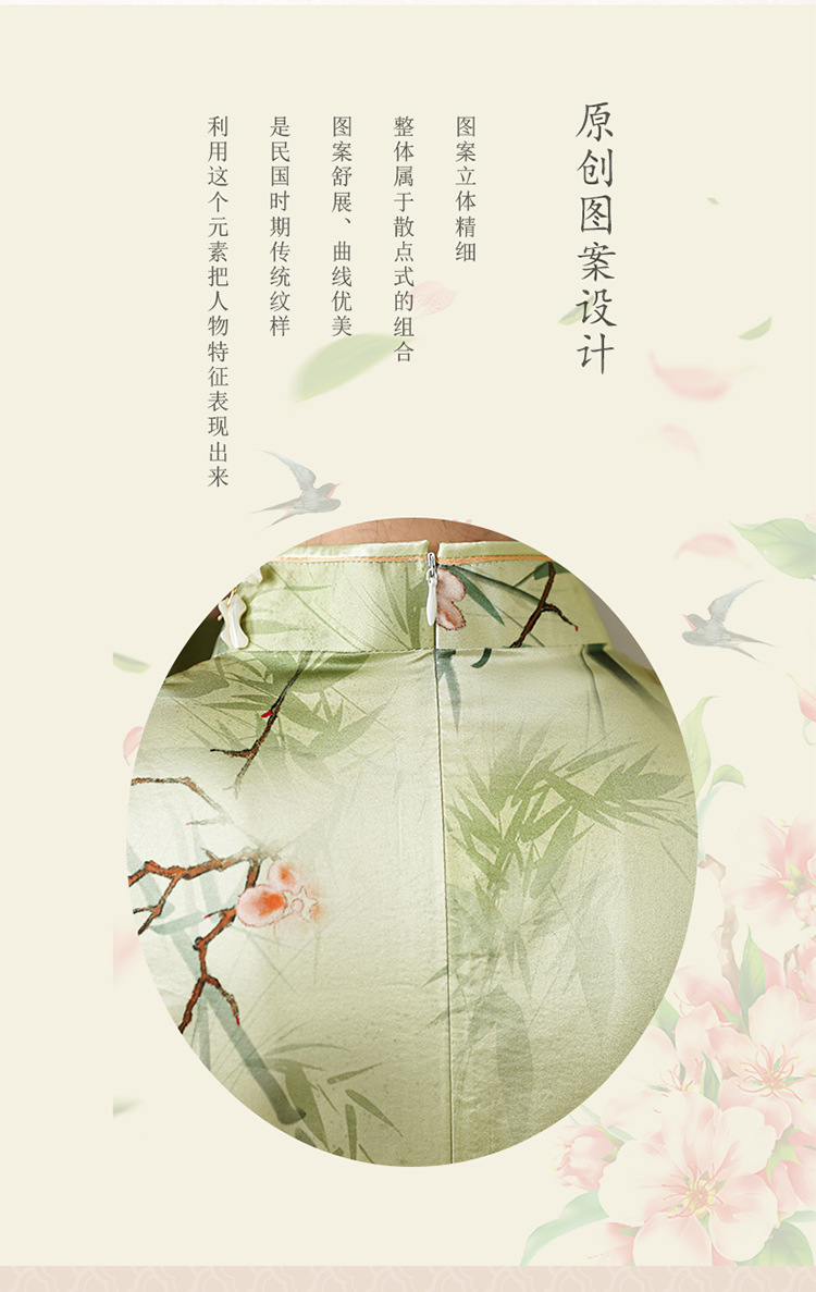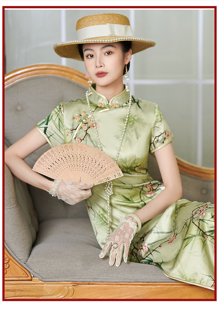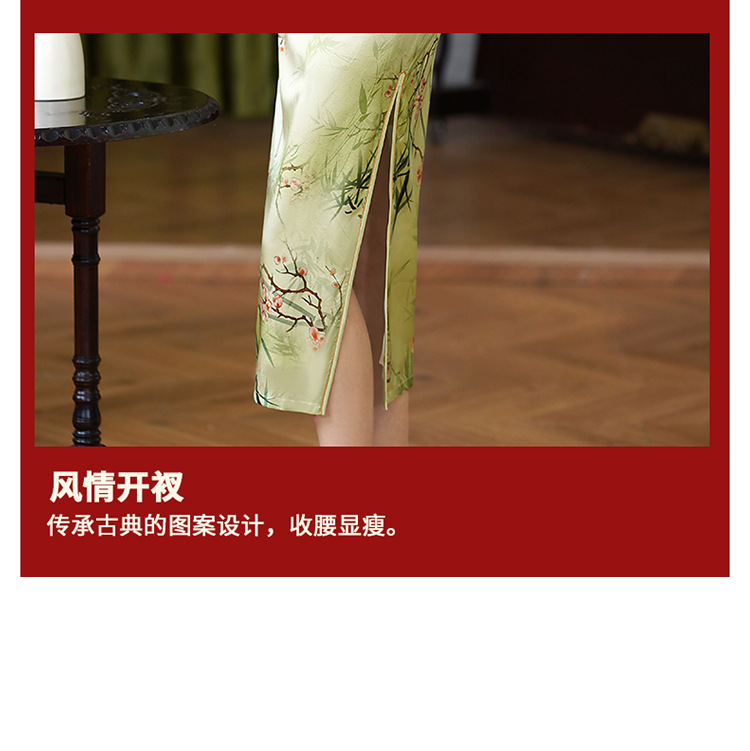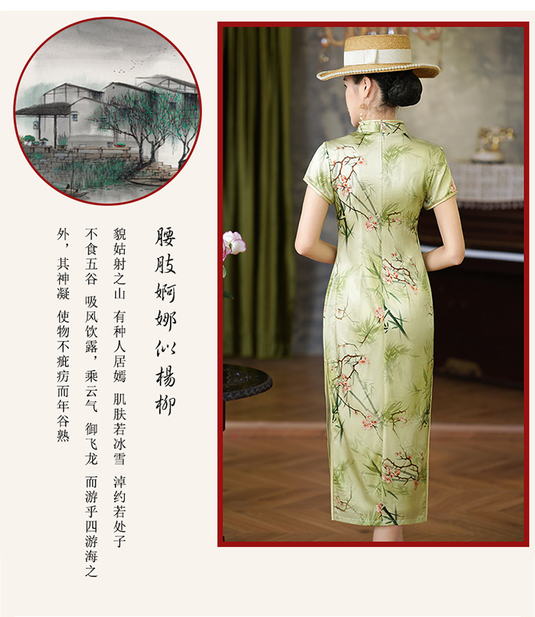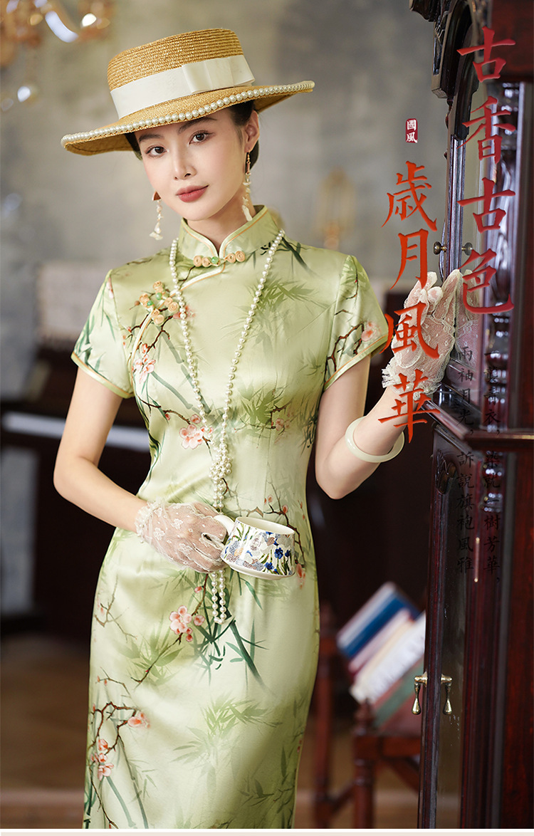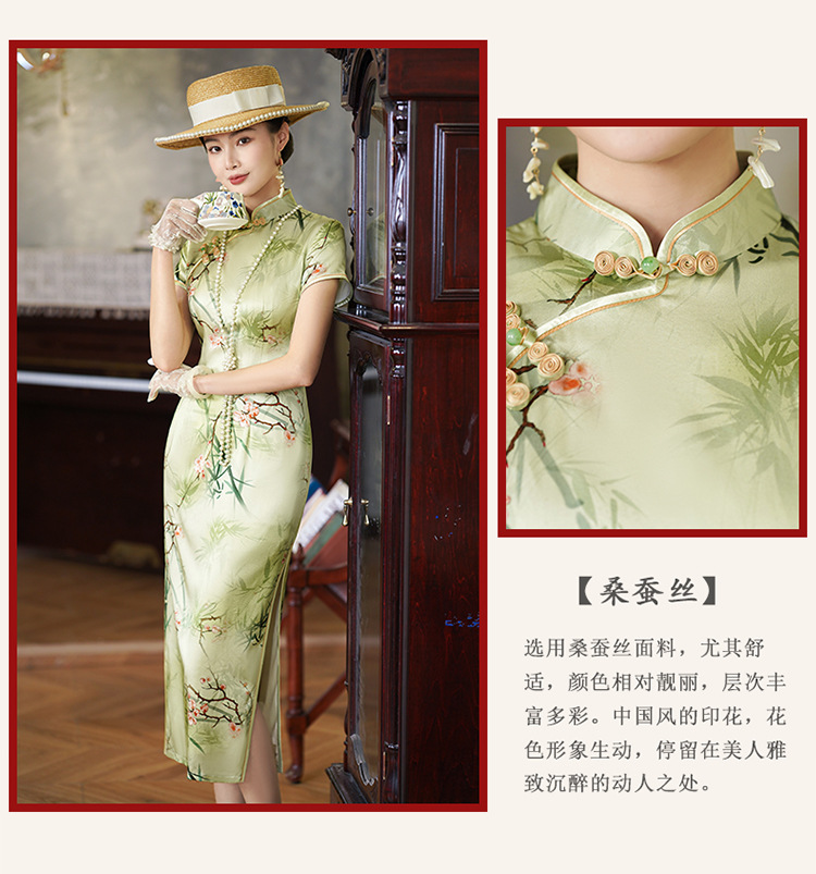 新中式绿色真丝旗袍,复古改良年轻款修身连衣裙YY- 2469