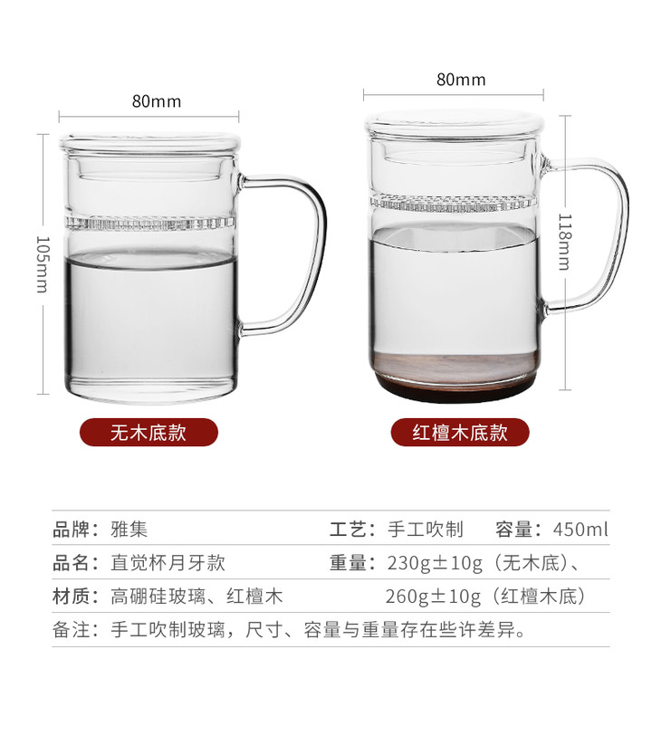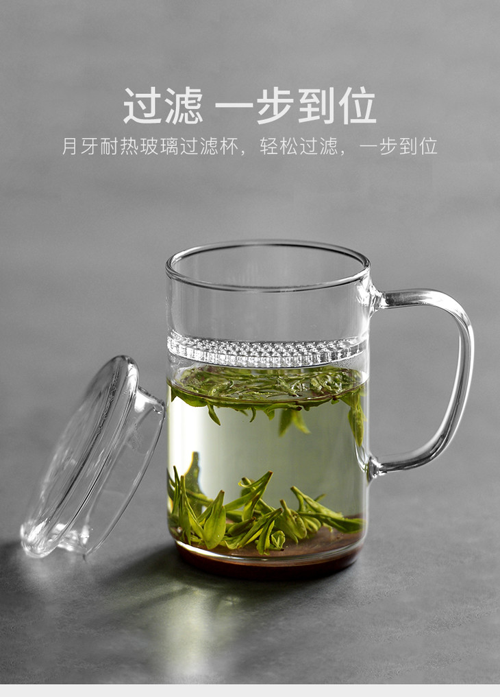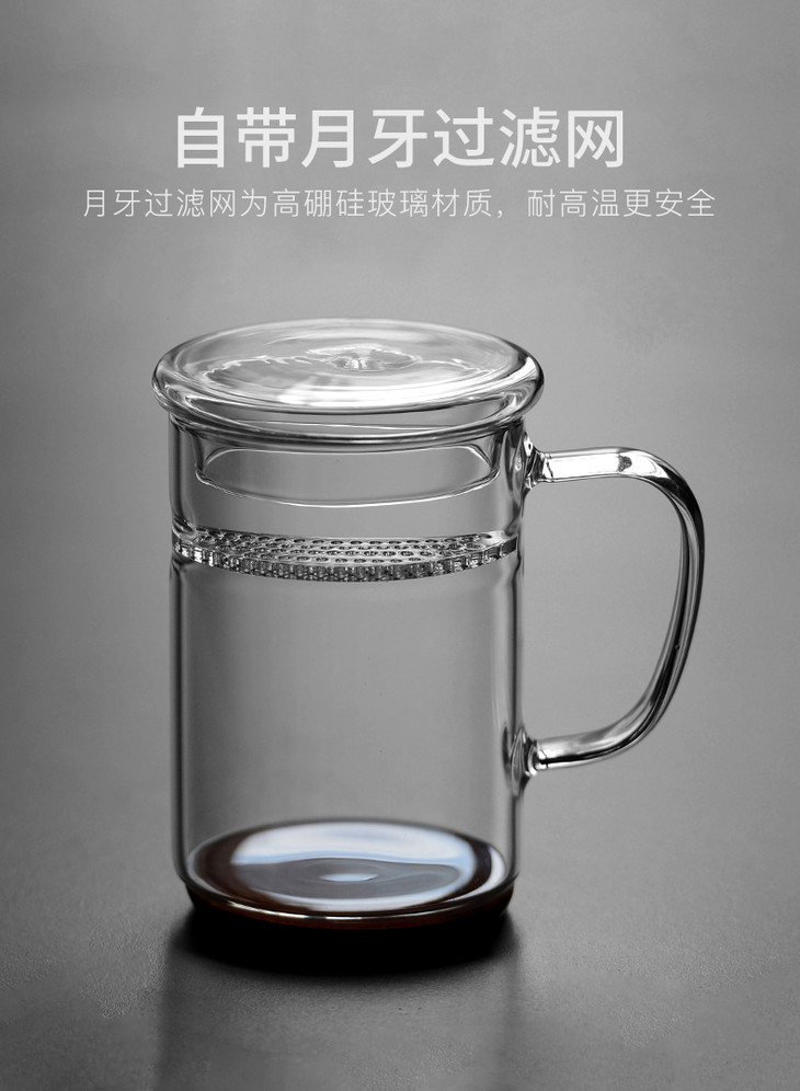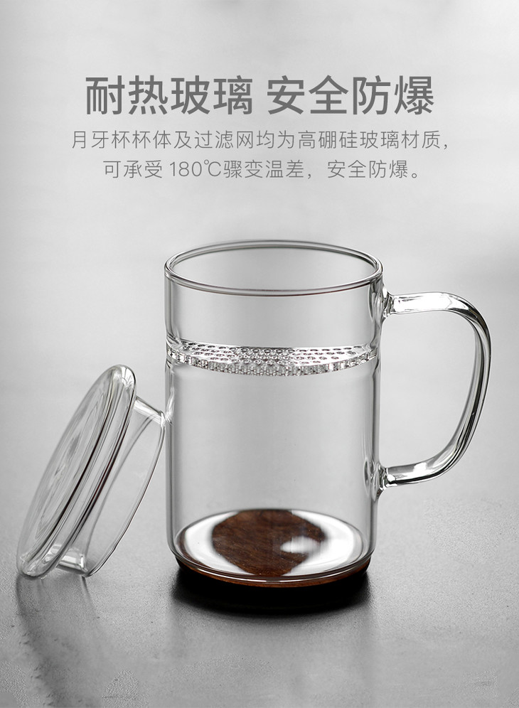 雅集月牙玻璃茶杯带茶滤耐热男女士办公泡茶杯创意带盖带把手水杯子
