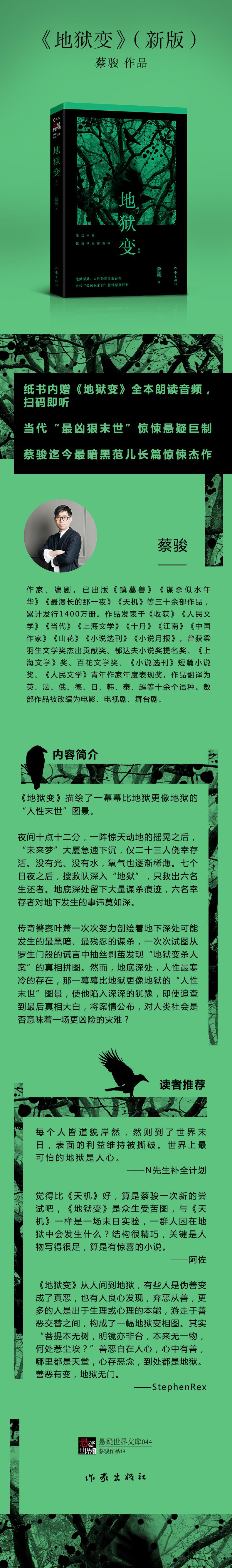 《地狱变》一幕幕比地狱更像地狱的“人性末世”图景。《地狱变》夜间十点十二分,一阵惊天动地的摇晃之后,“未来梦”大厦急速下沉,仅二十三人侥幸存活。没有光、没有水,氧气也逐渐稀薄。七个日夜之后,搜救队深入“地狱”,只救出六名生还者。地底深处留下大量谋杀痕迹,六名幸存者对地下发生的事讳莫如深。传奇警察叶萧一次次努力剖绘着地下深处可能发生的最黑暗、最残忍的谋杀,一次次试图从罗生门般的谎言中抽丝剥茧发现“地狱变杀人案”的真相拼图。然而,地底深处,人性最寒冷的存在,那一幕幕比地狱更像地狱的“人性末世”图景,使他陷入深深的犹豫,即使追查到最后真相大白,将案情公布,对人类社会是否意味着一场更凶险的灾难?《地狱变》生活本身比地狱更像地狱。