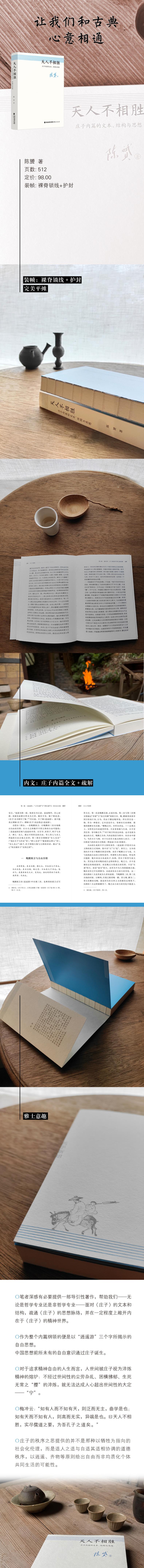 《庄子》三十三篇,借寓言见意,文章瑰丽无比,文笔纵横跌宕,肆意,要捕捉庄子之意甚难。一般以为内七篇《逍遥游》《齐物论》《养生主》《人间世》《德充符》《大宗师》《应帝王》最为纯正。 《天人不相胜——庄子内篇的文本、结构与思想》,是作者长期研读、教学《庄子》的总结之作,洵为研读《庄子》的踏实导引。 本书体例正如副标题“庄子内篇的文本、结构与思想”所示,每篇基本分为三个层次:首先是题解,总括该篇大意,提示要注意的问题;其次按《庄子》行文脉络分章,章解句释,甄别故训;尤为重要的是,作者将内七篇视为网状的意义结构,力图疏通其思想脉络,并在一定程度上敞开内在于《庄子》的精神世界。