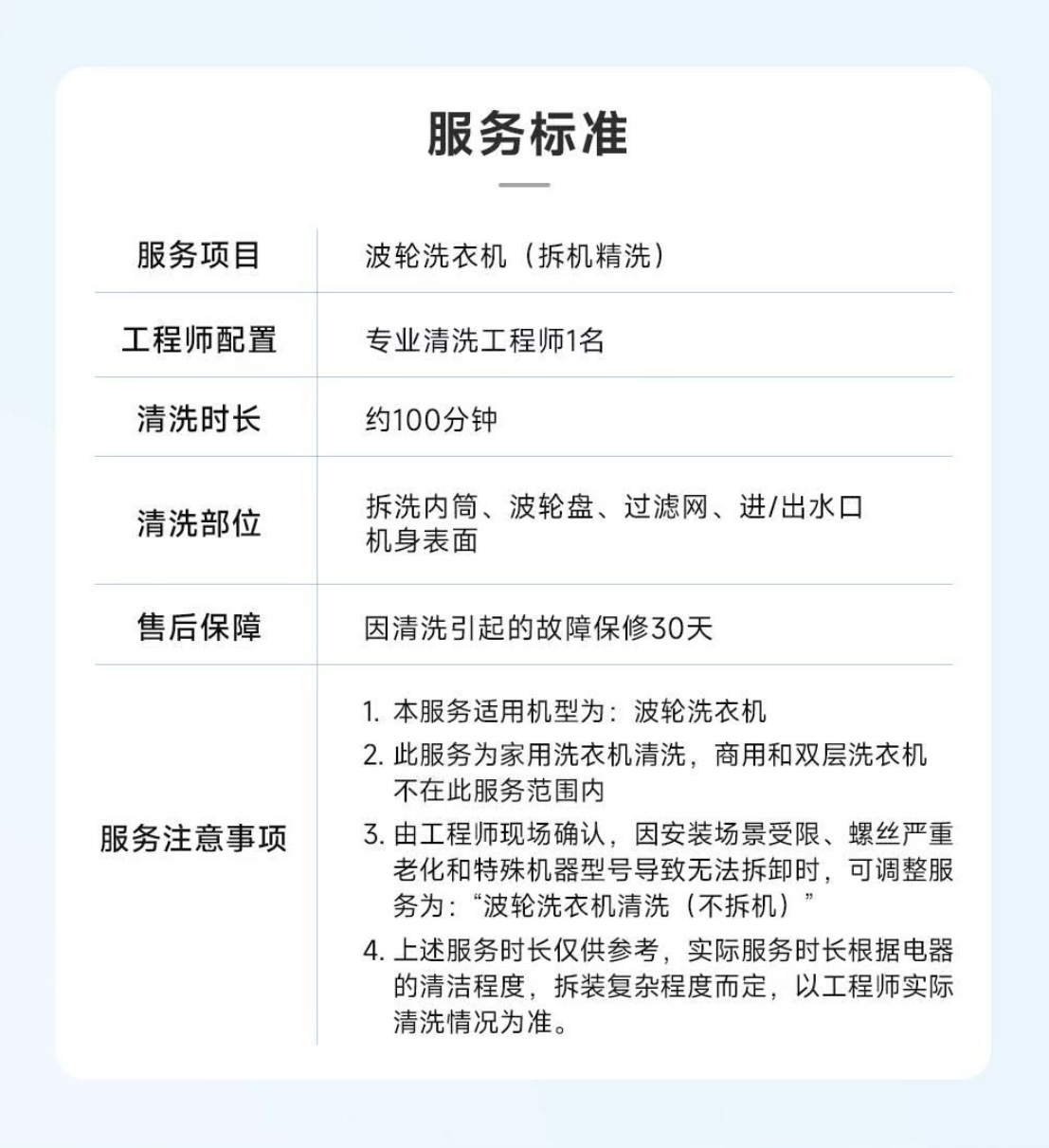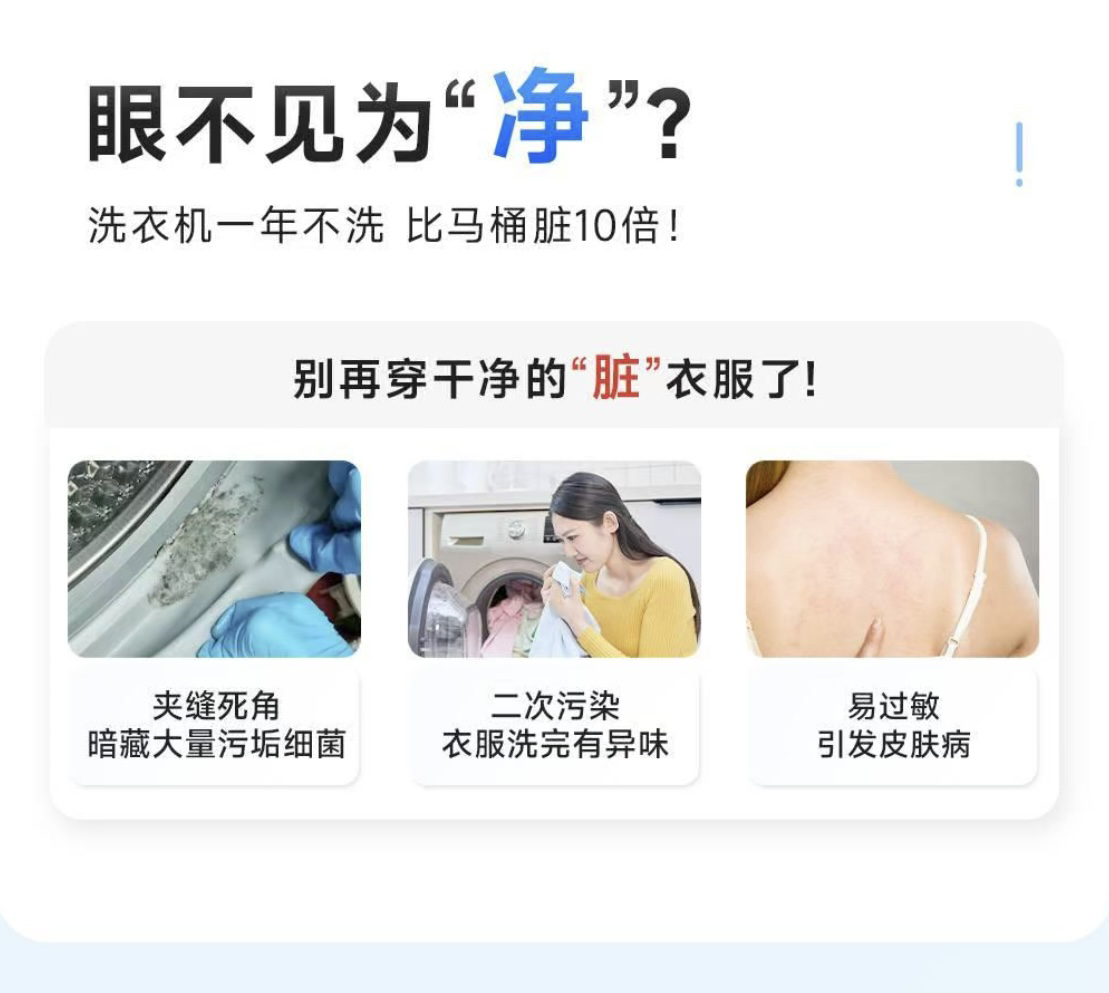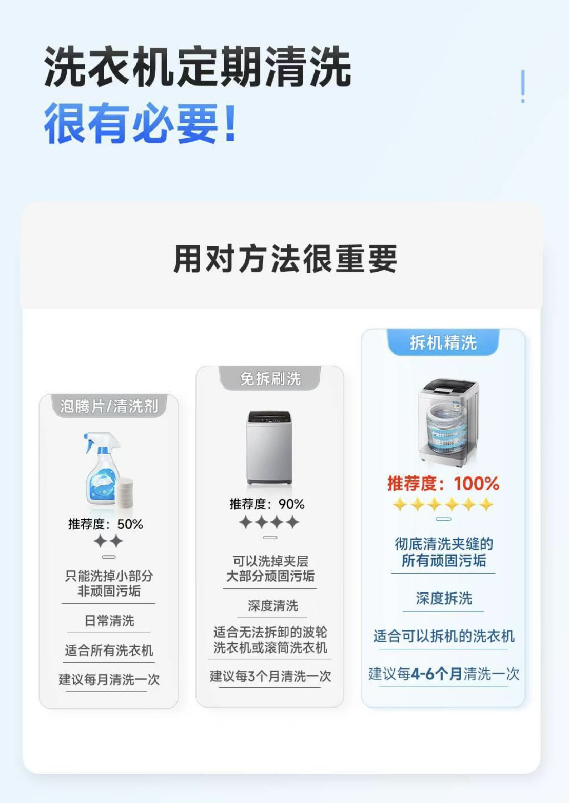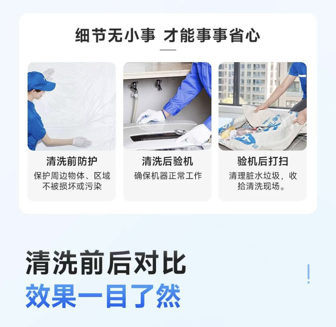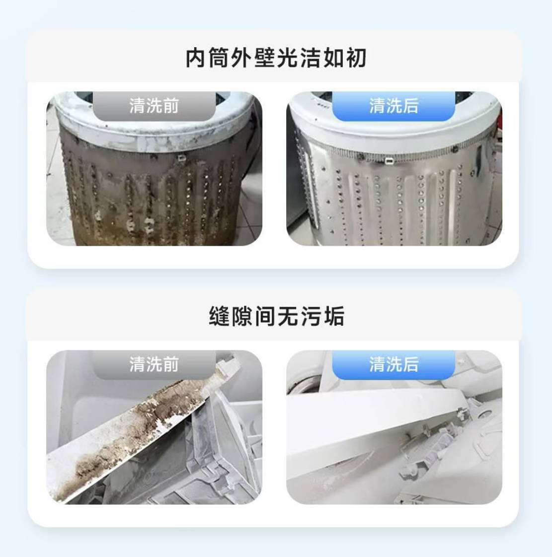 清洁内容:外表面、内筒、内筒夹层、、过滤器、密封圈、进出水管、洗涤剂盒、排污口