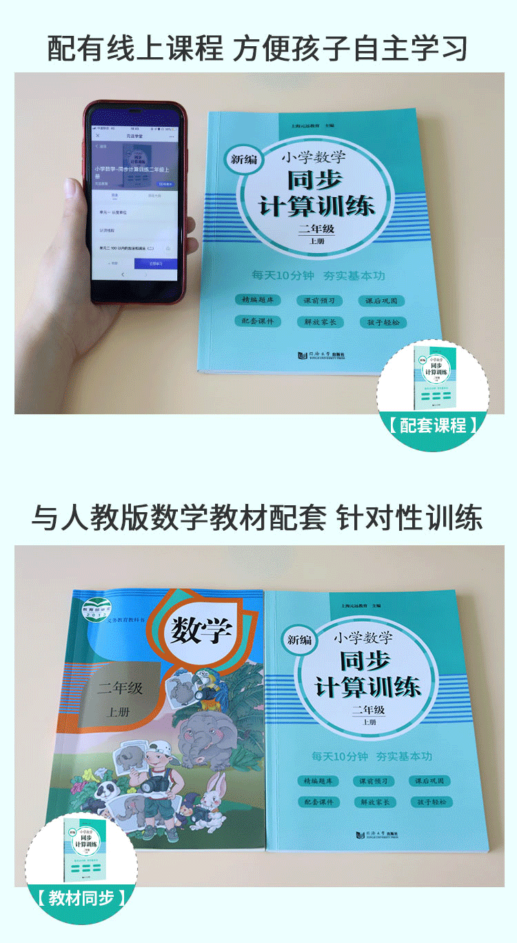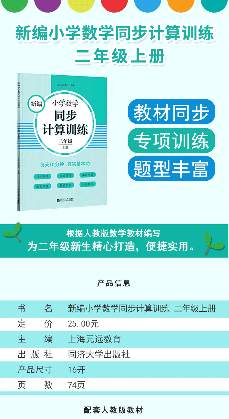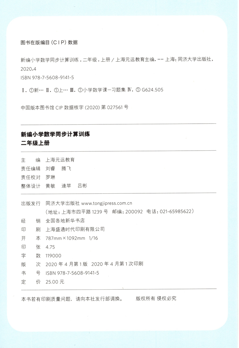 2020新版 新编小学数学同步计算训练 二年级上册/2年级第一学期 人教版数学教材配套练习 小学数学计算专项训练 同济大学出版社