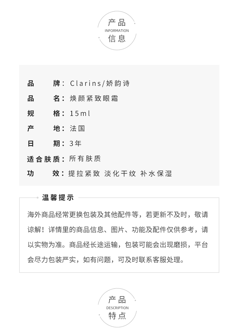 Clarins娇韵诗焕颜弹力全明星眼霜15ml淡黑眼圈细纹紧致眼周【CDF】