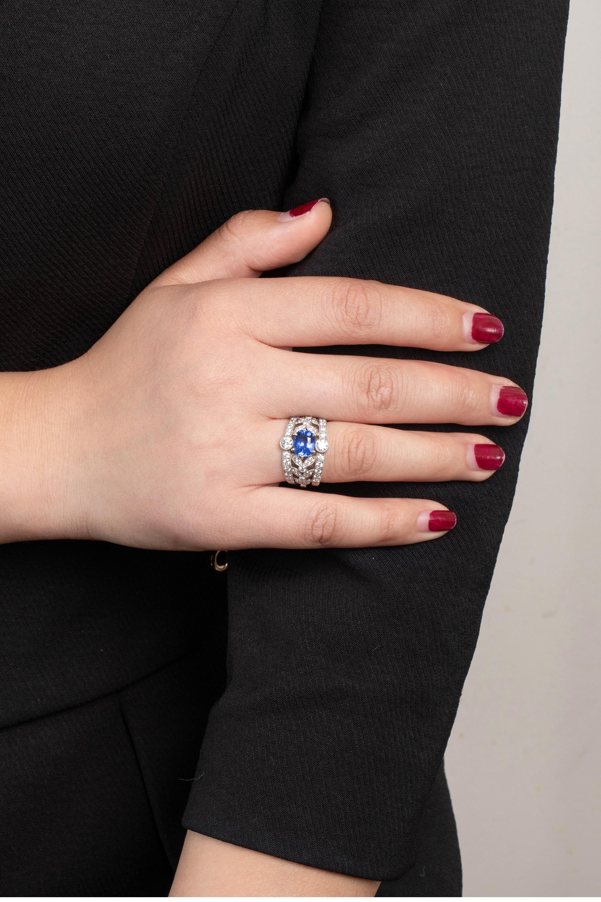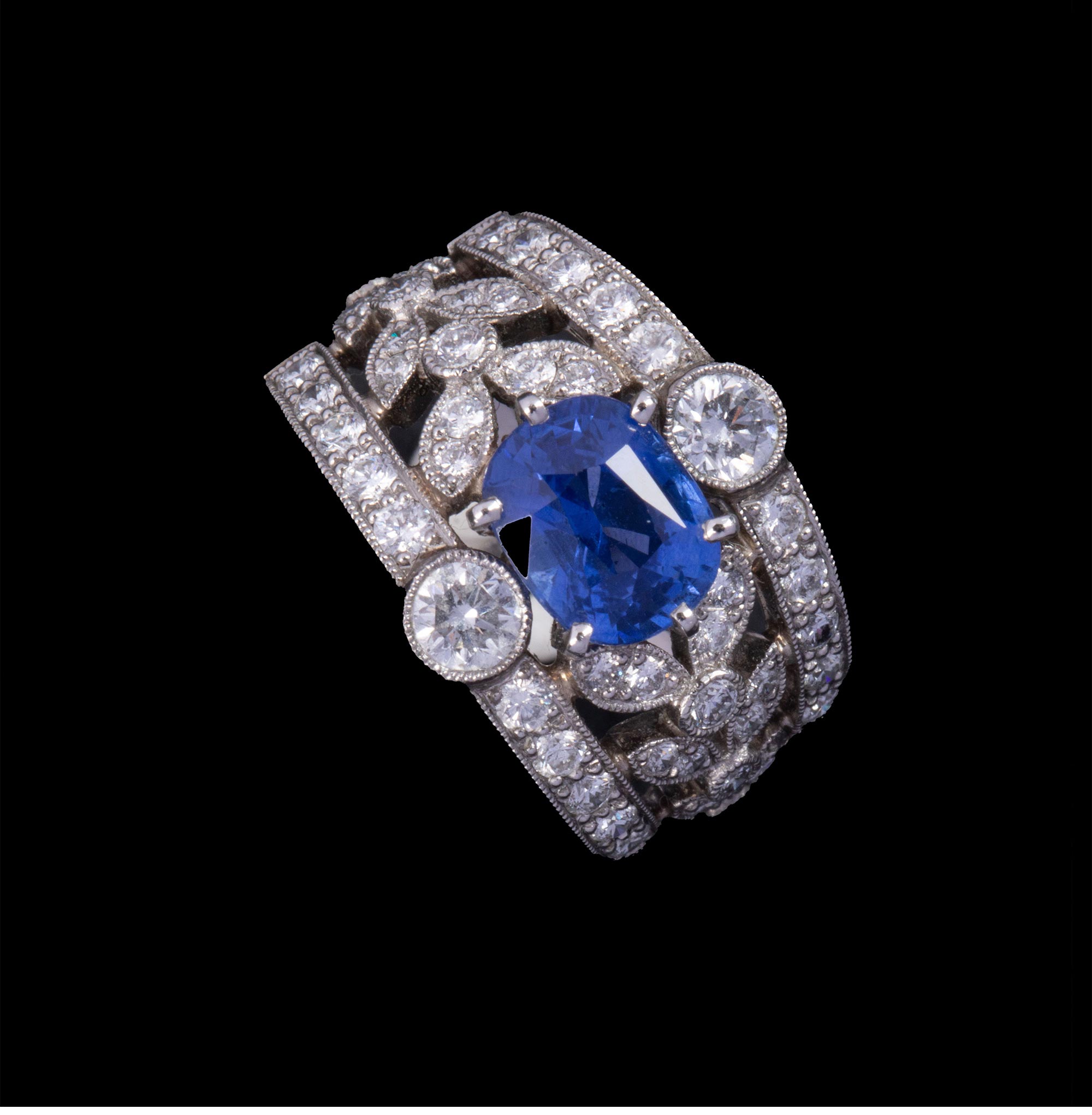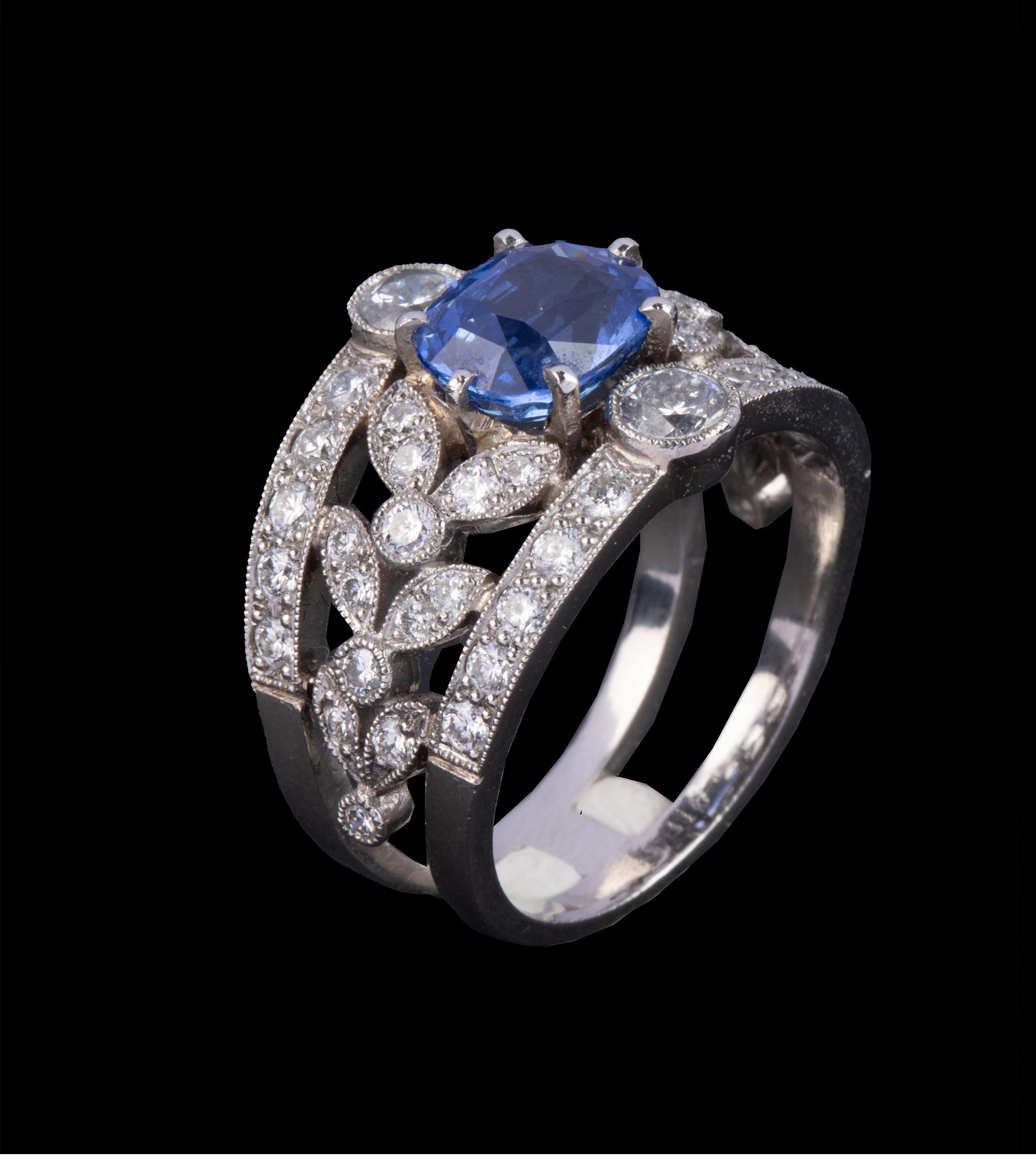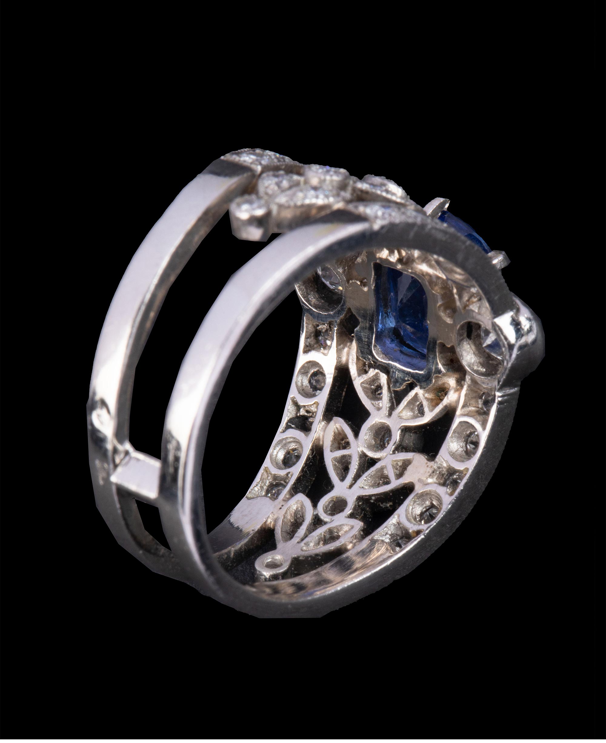 20世纪晚期法国出品自然花叶主题铂金镶嵌蓝宝石及钻石戒指