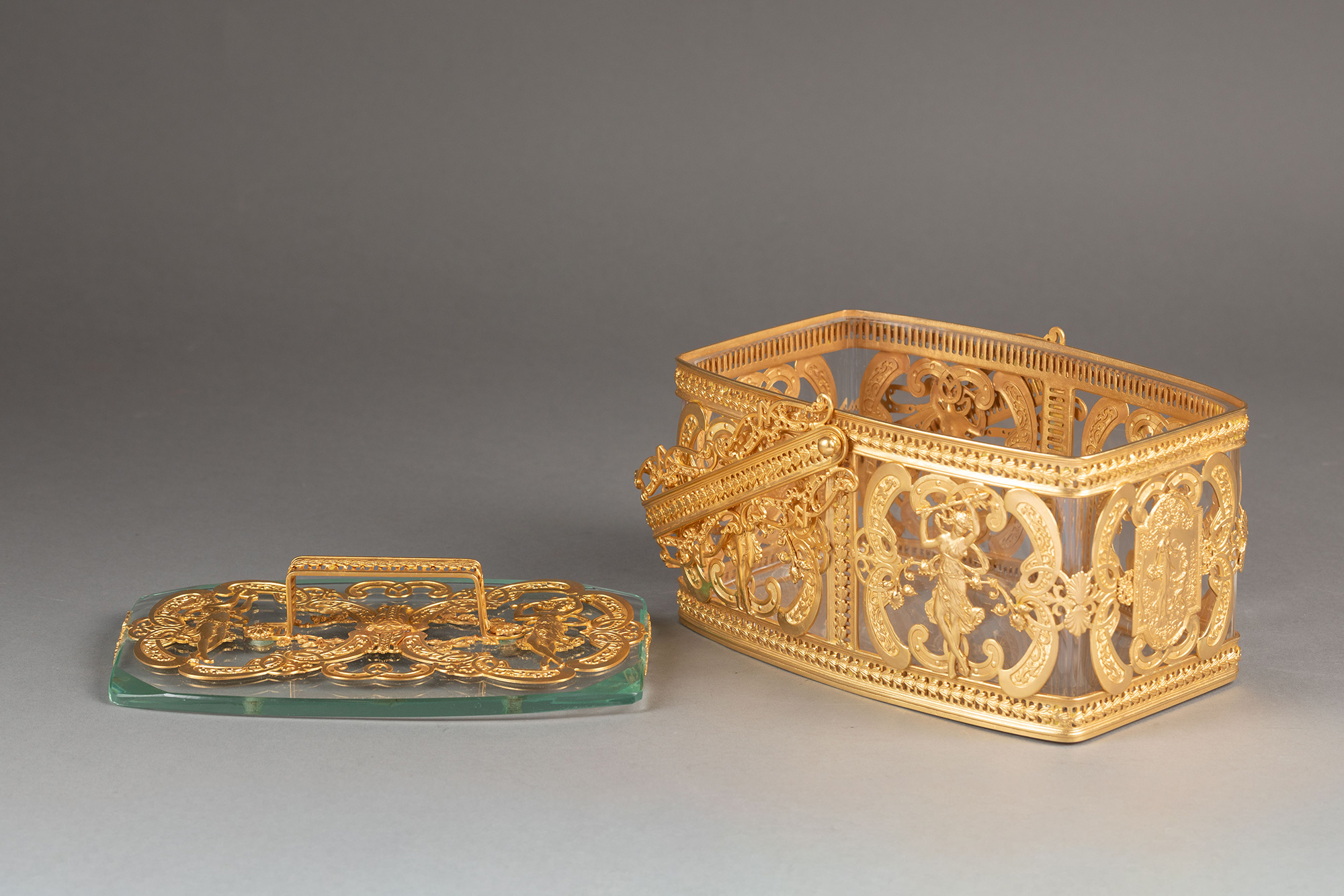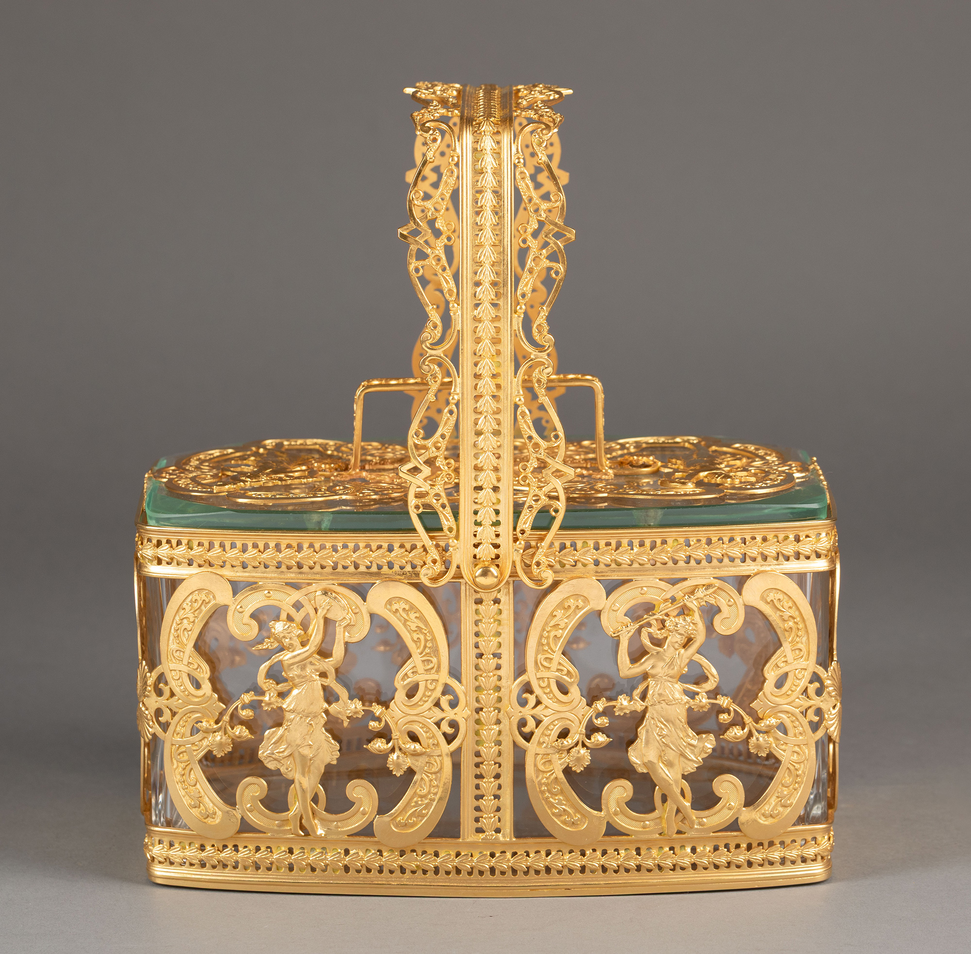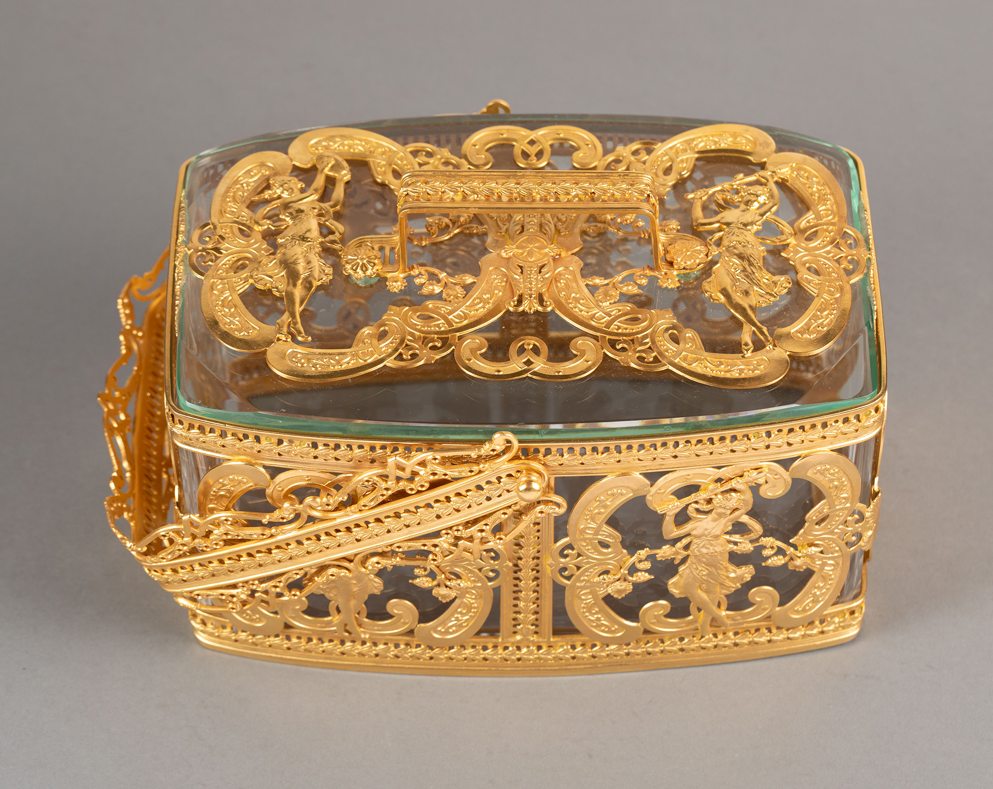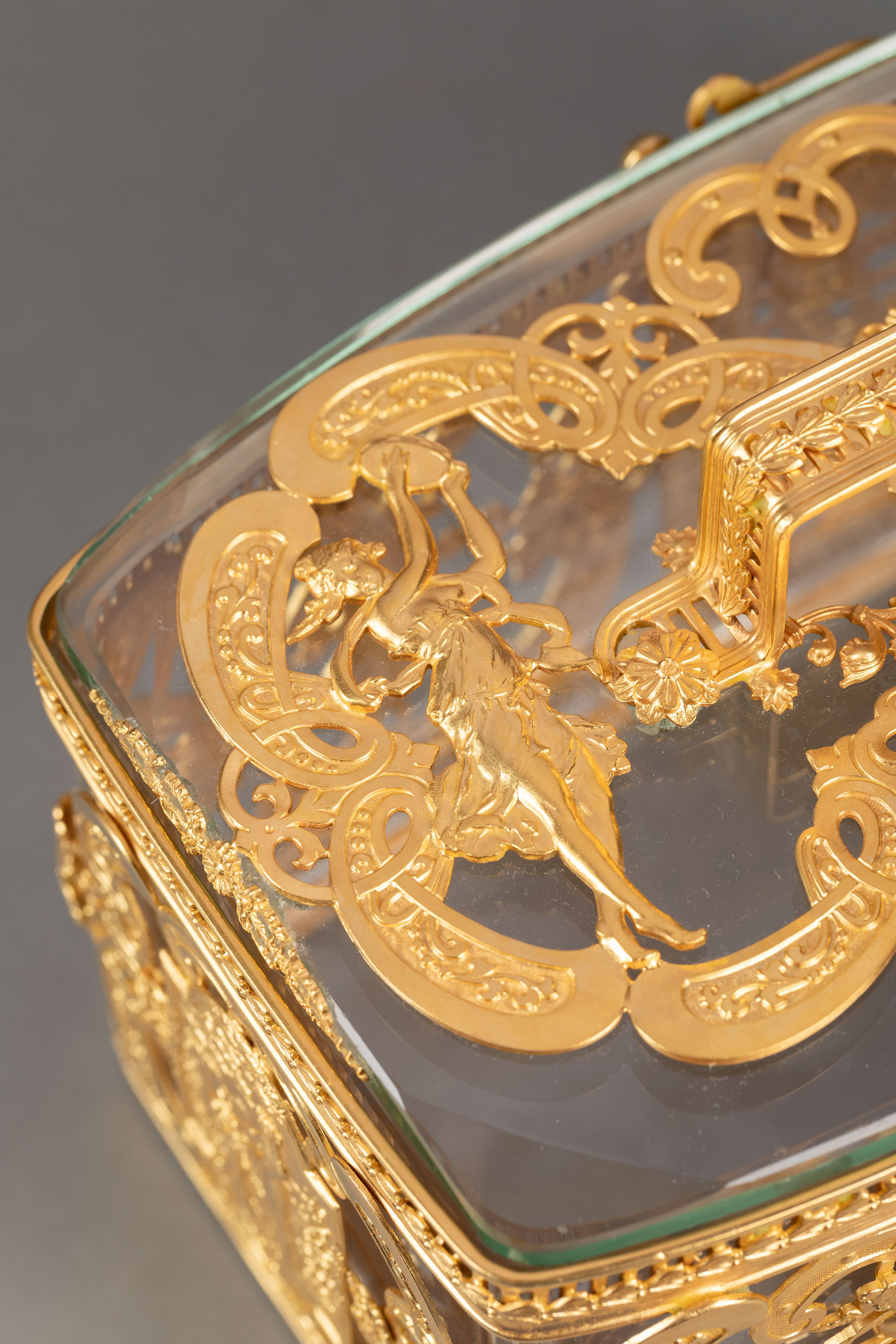 20世纪法国出品洛可可风格光影乐章主题铜鎏金精雕水晶首饰盒
