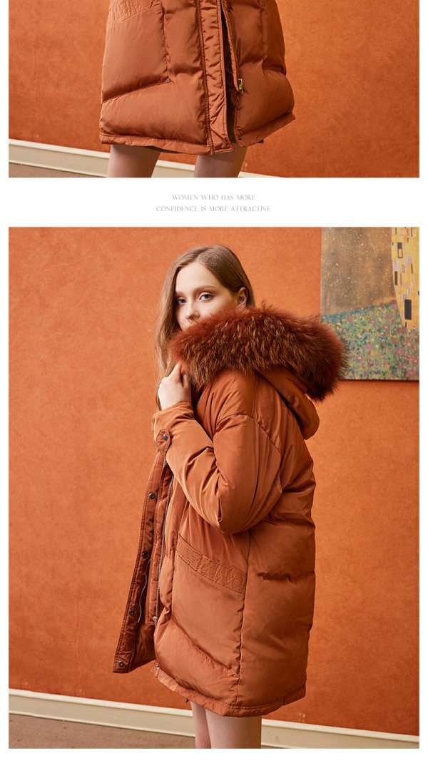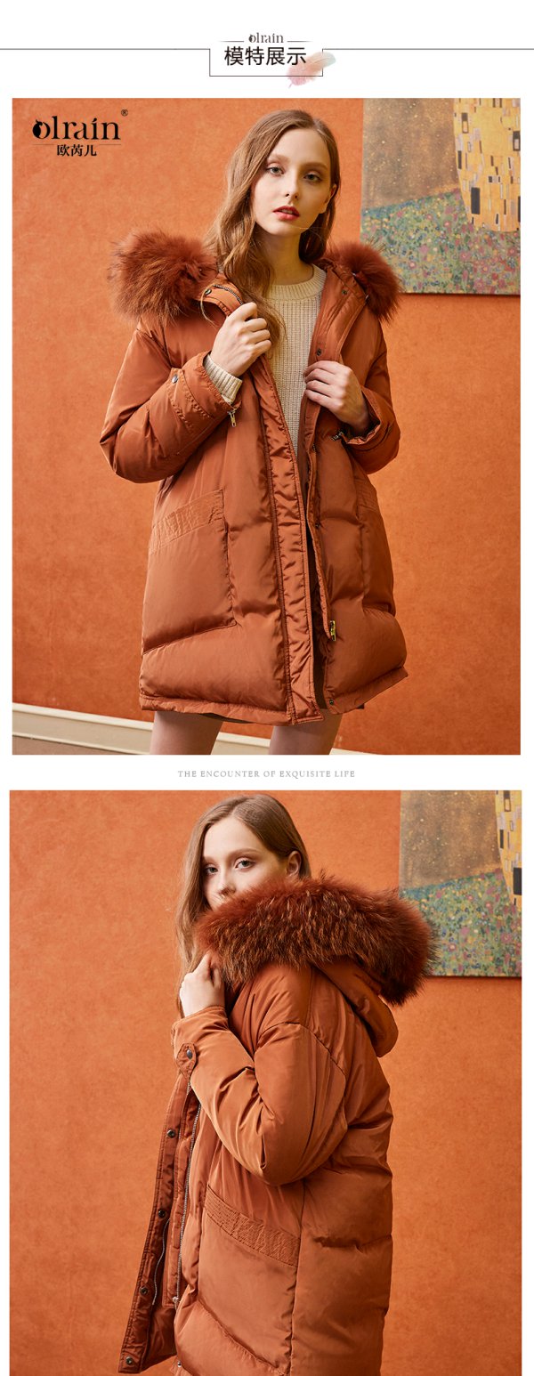 欧芮儿冬女新年红色宽松90%白鸭绒连帽羽绒服女中长款