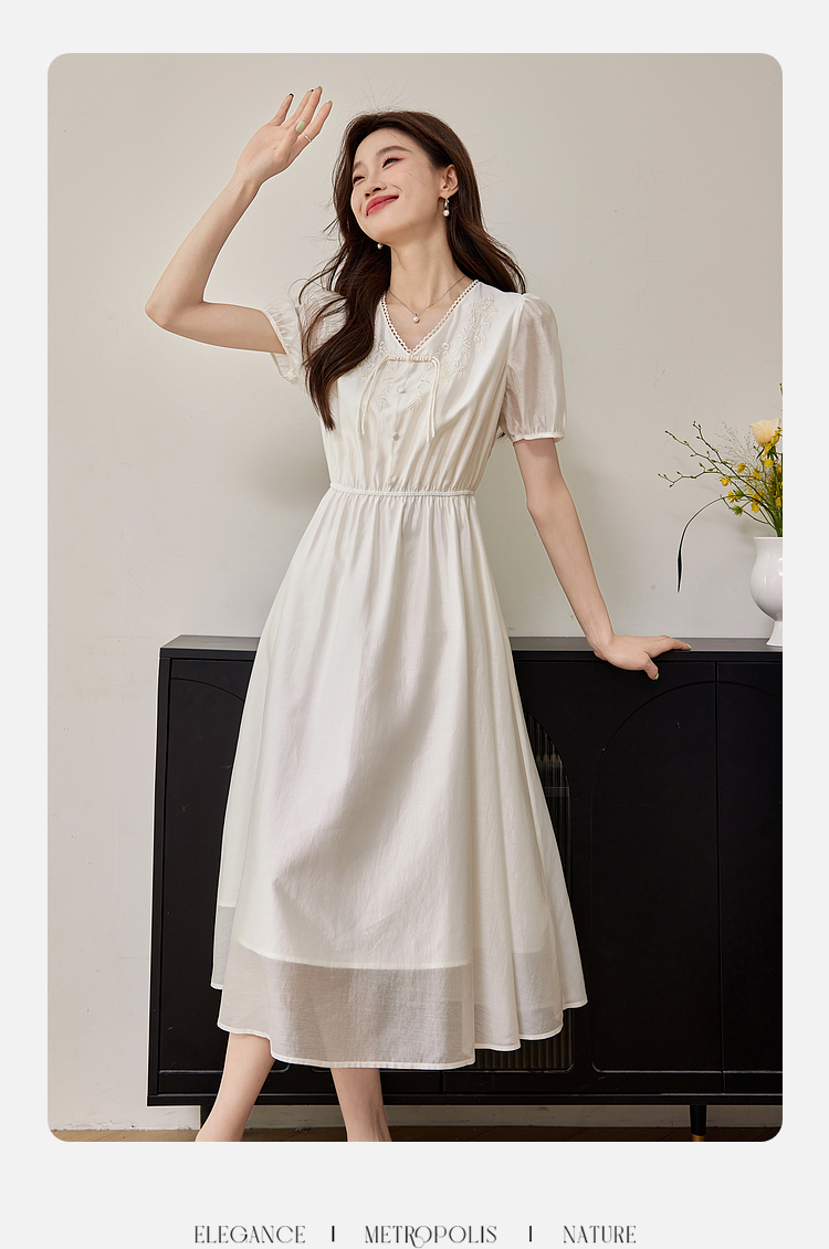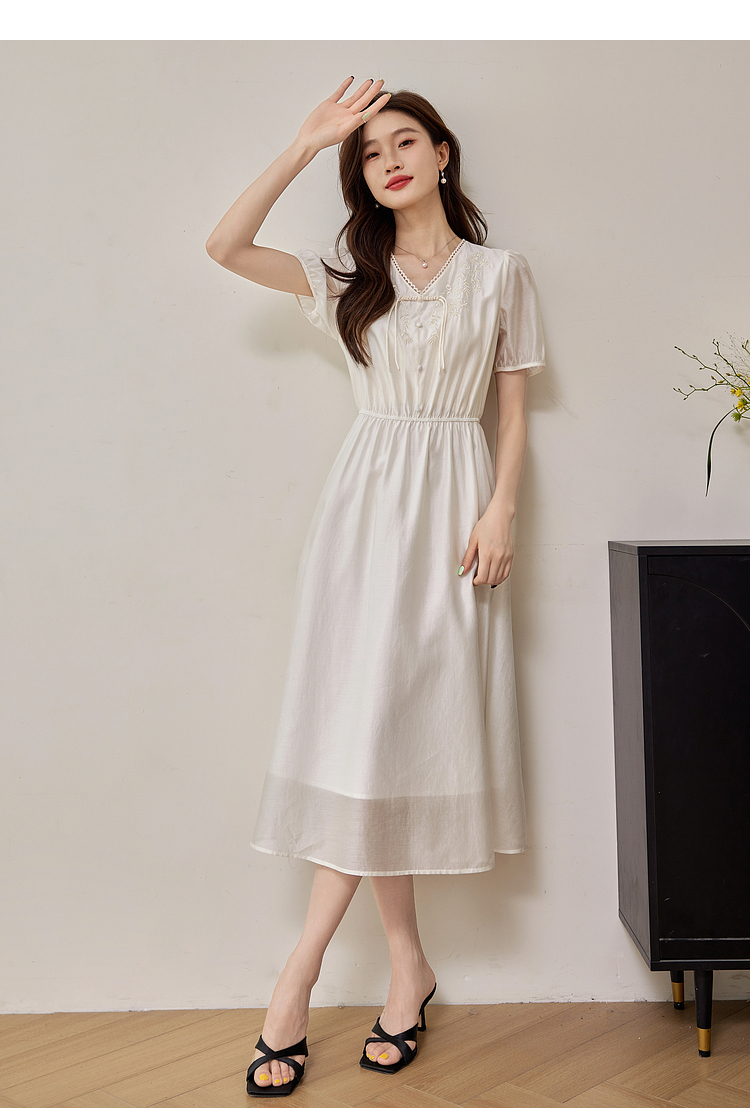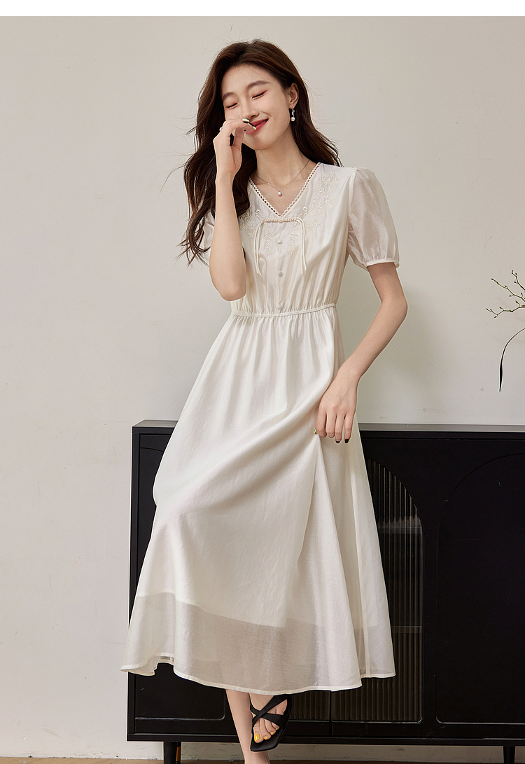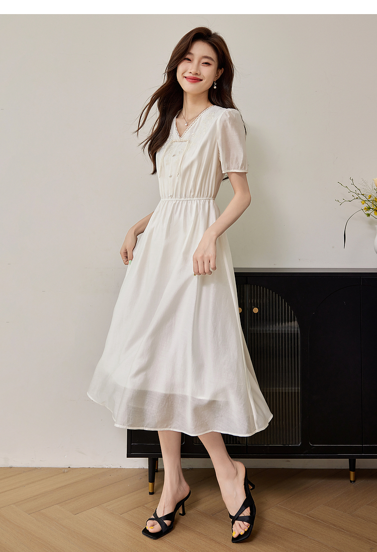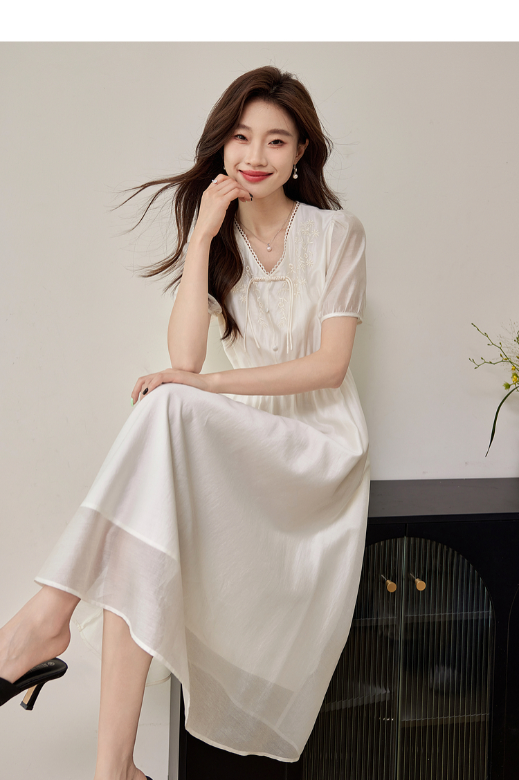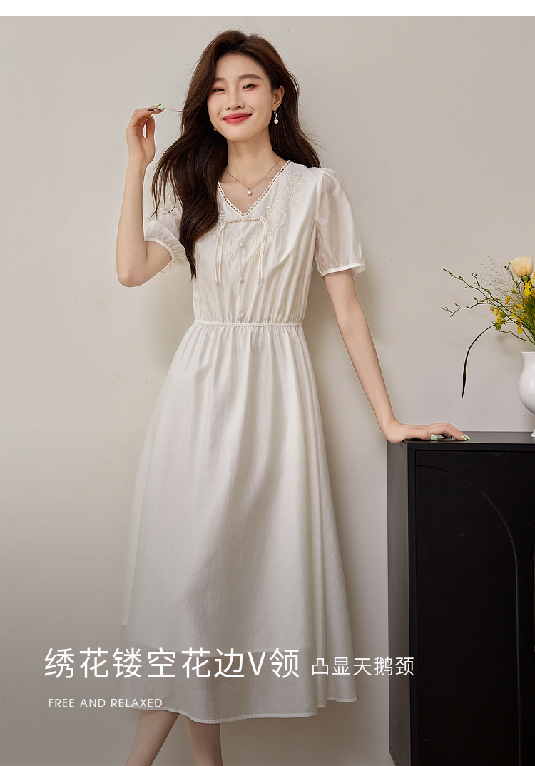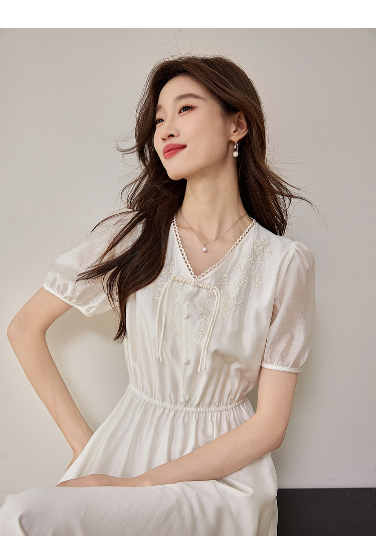 【专属特价】熙世界白色新中式天丝连衣裙2025夏季新款优雅V领国风刺绣裙子