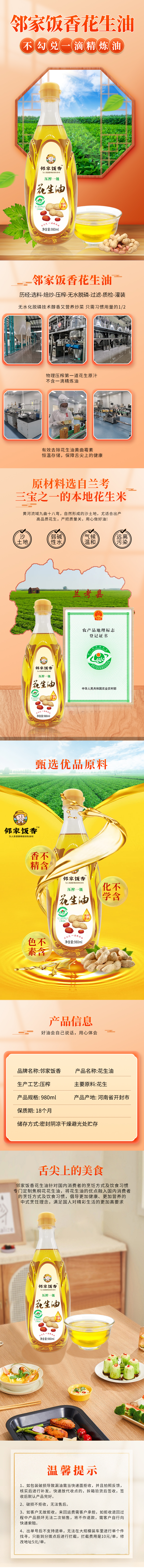 邻家饭香 压榨一级花生油 国家地理标志农产品兰考花生压榨 980ml/瓶 LJFX62