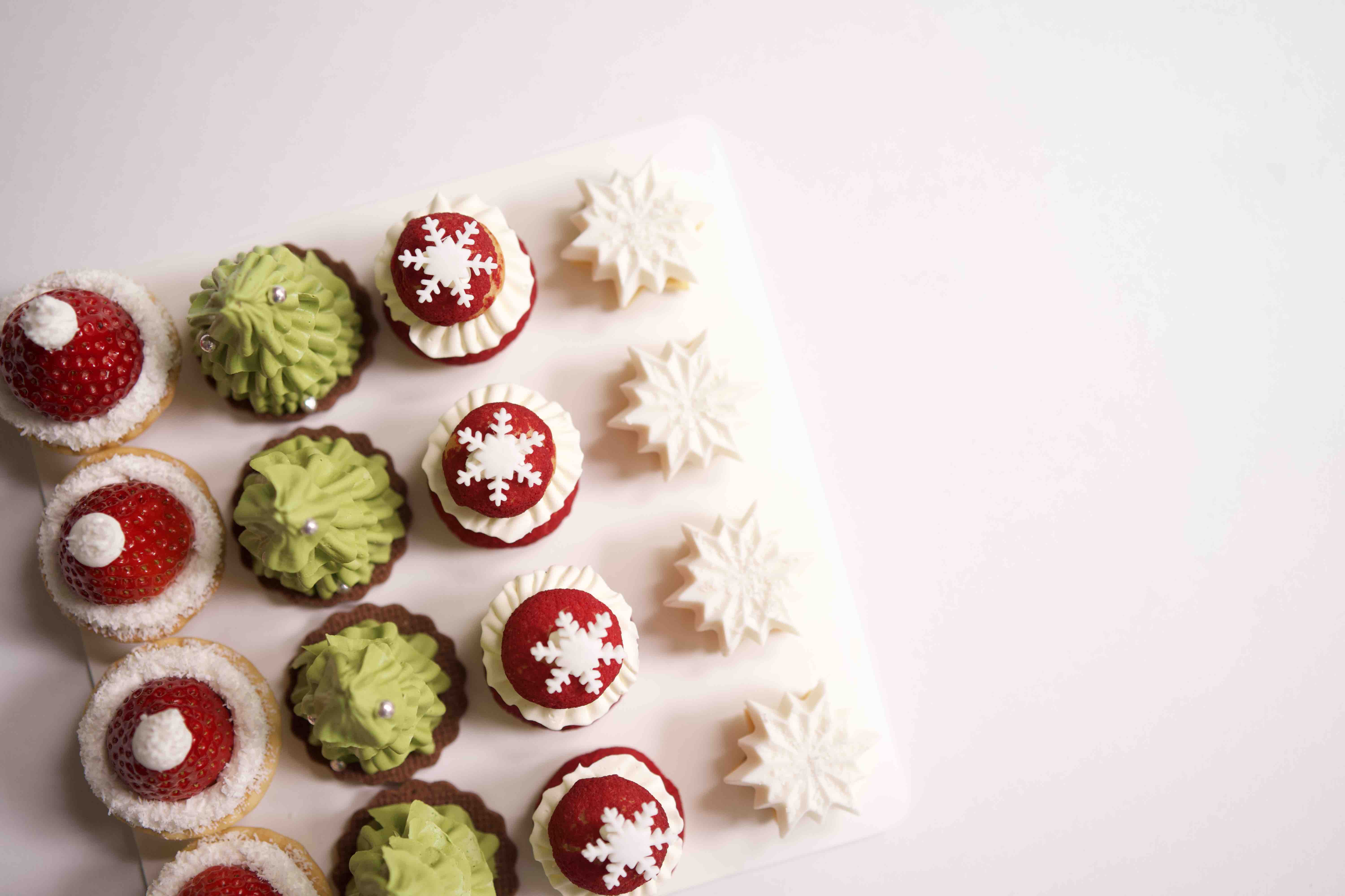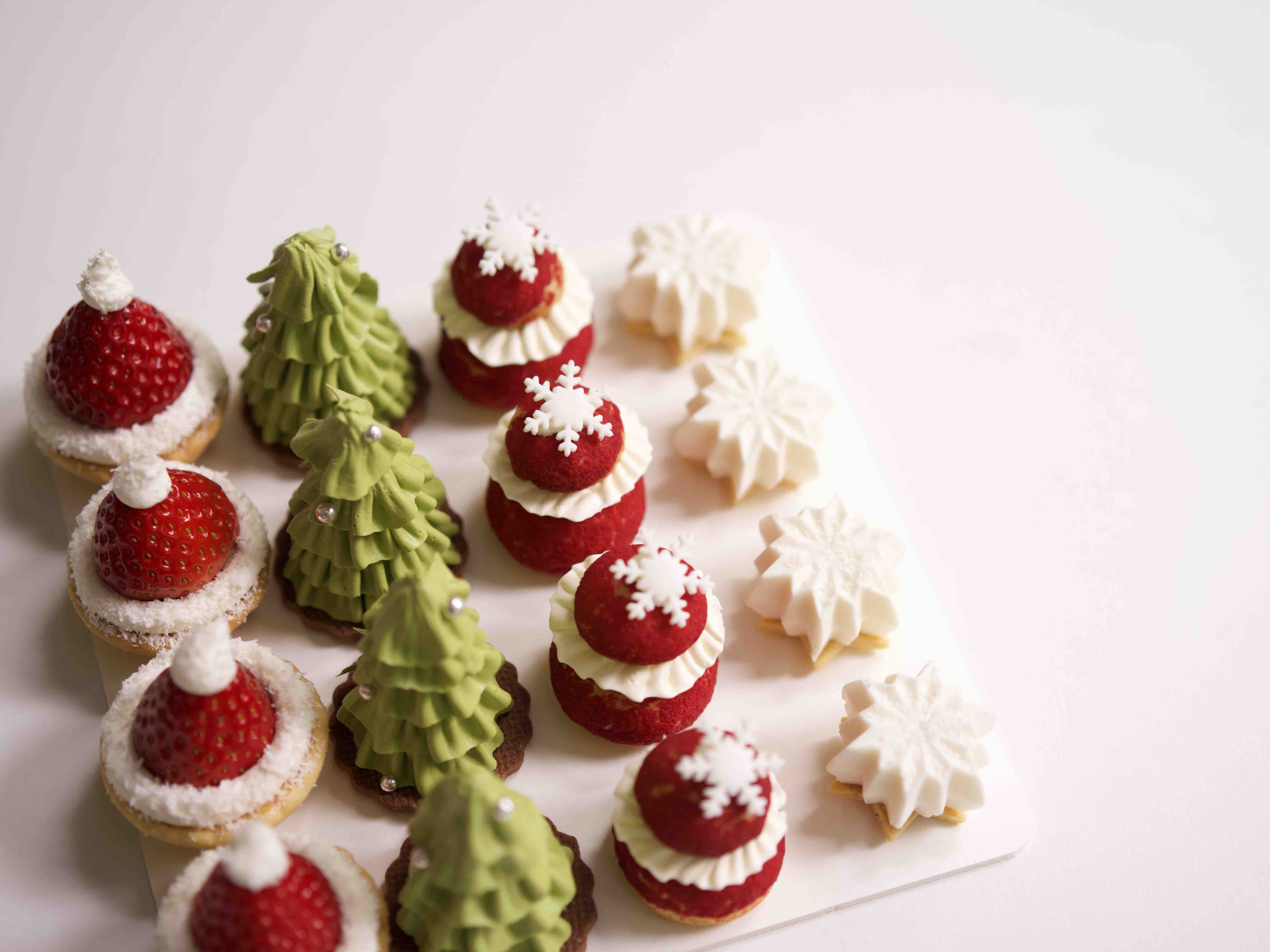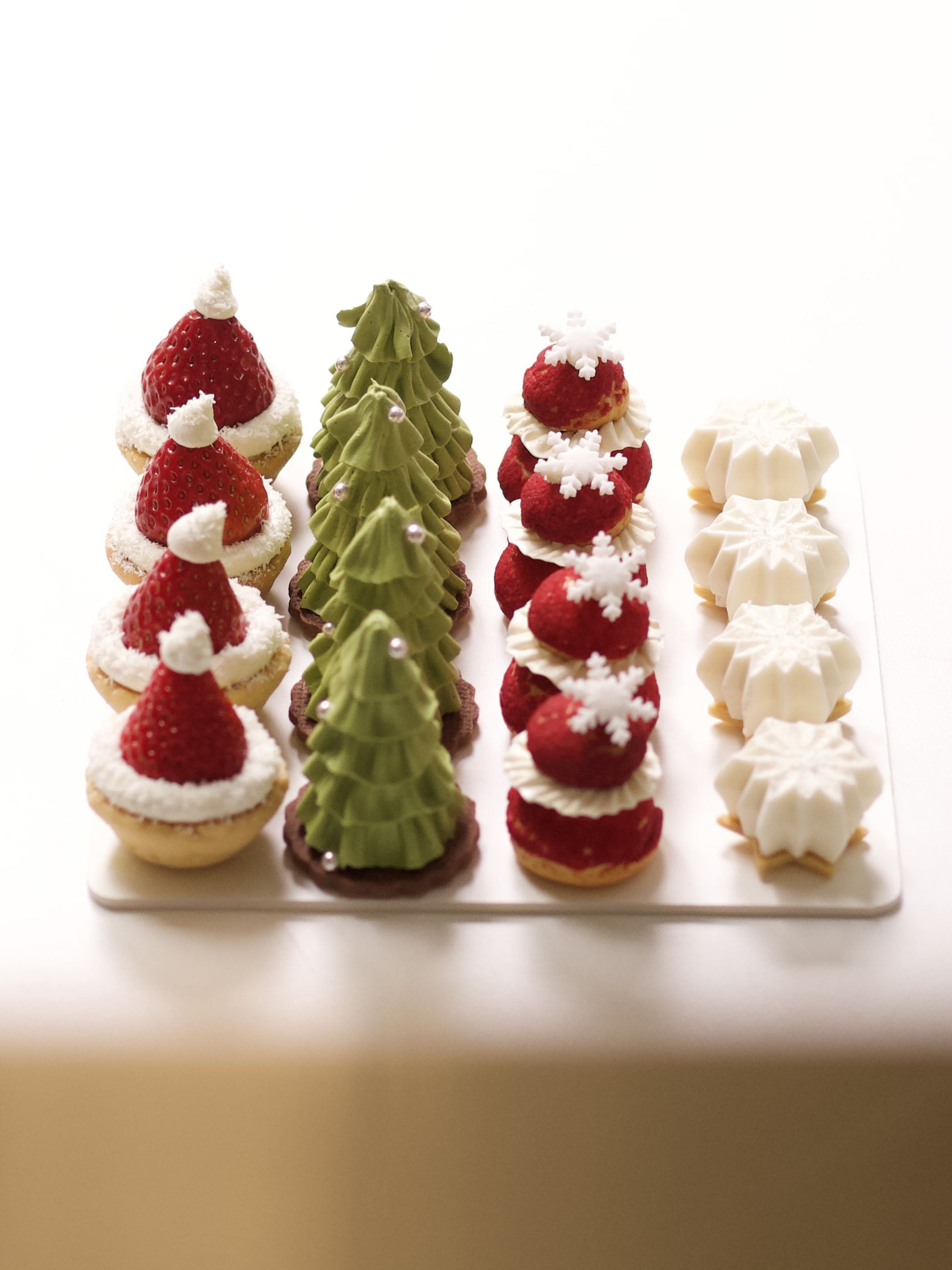依次为:草莓塔,开心果圣诞树,修女泡芙,雪花椰子慕斯