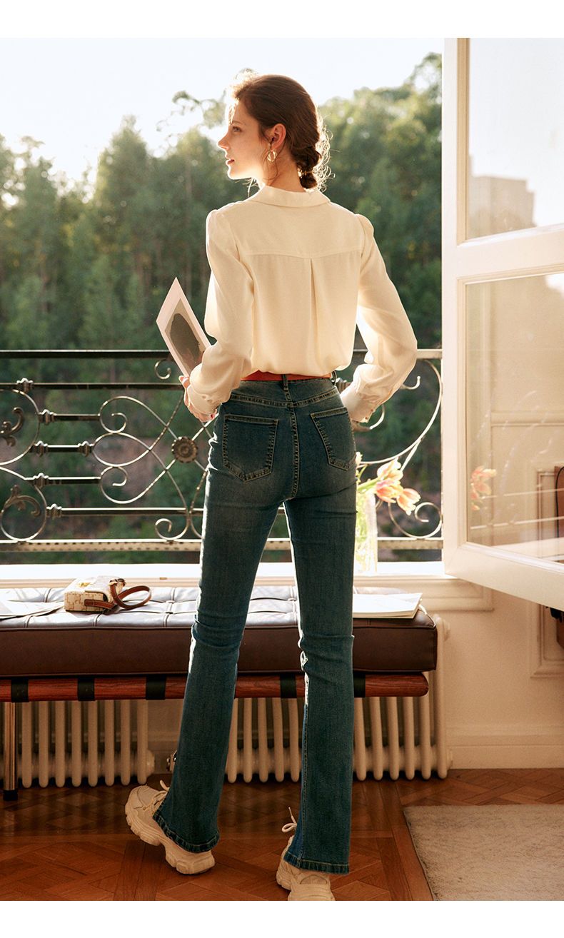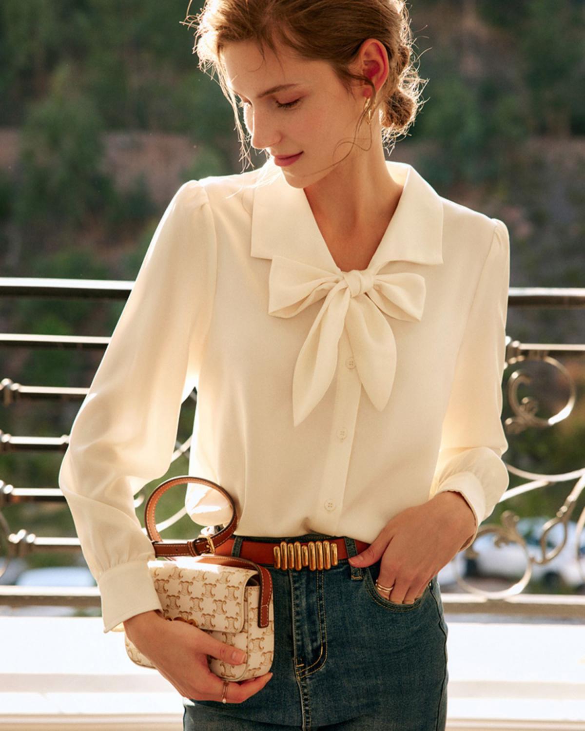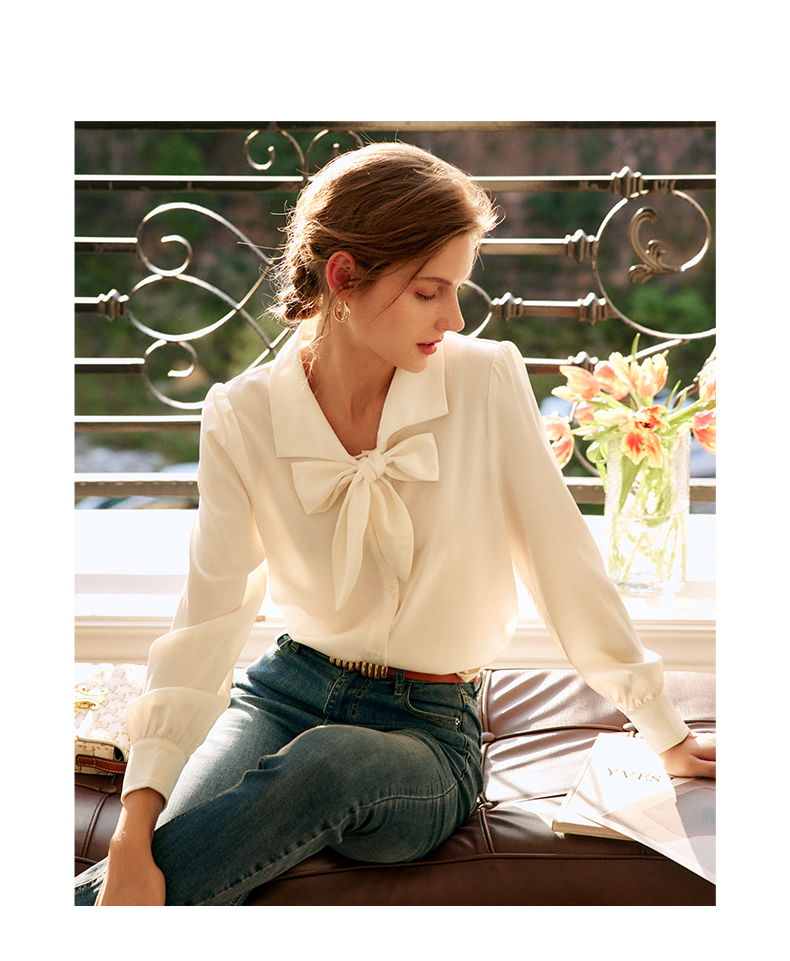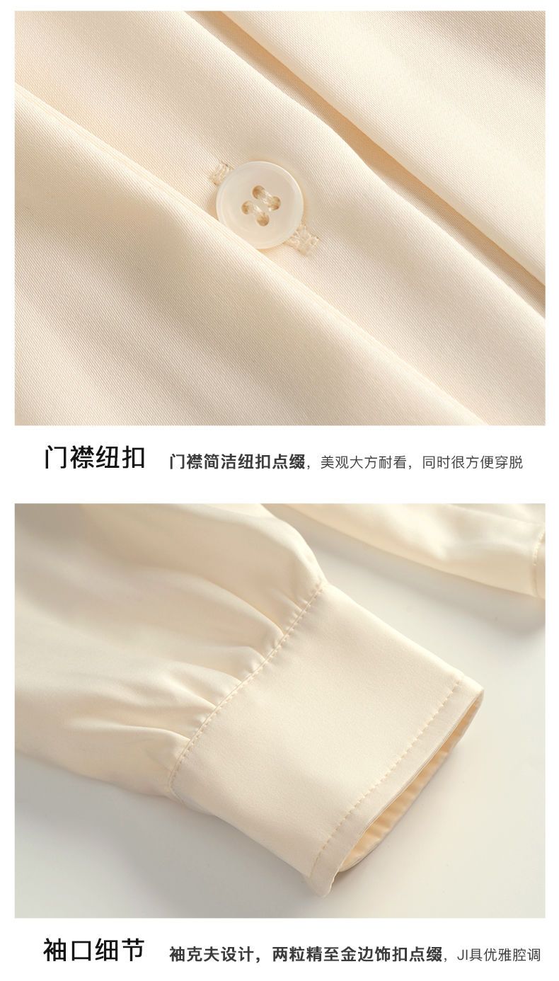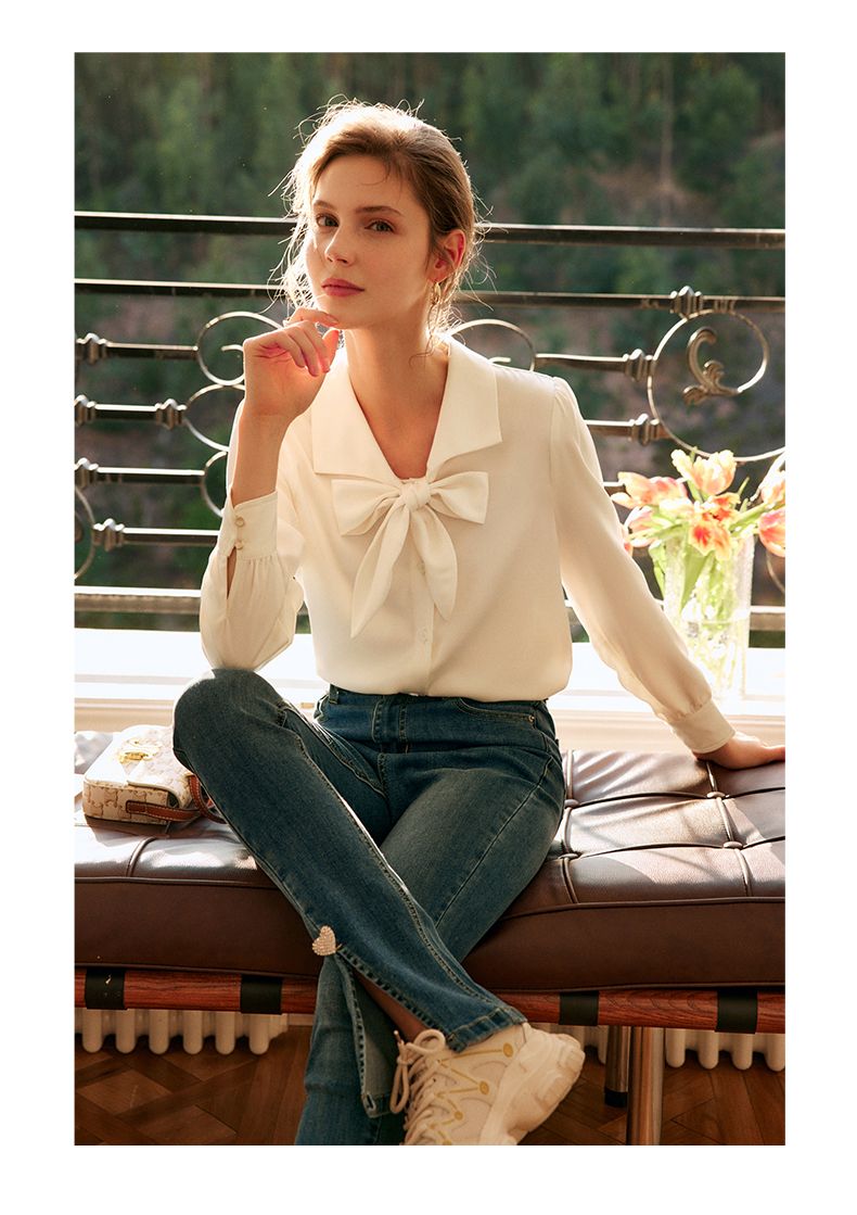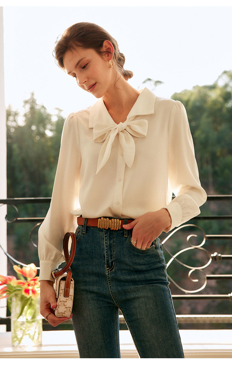 欧芮儿杏色衬衫女春季2022年新款宽松显瘦时尚法式长袖蝴蝶结衬衣