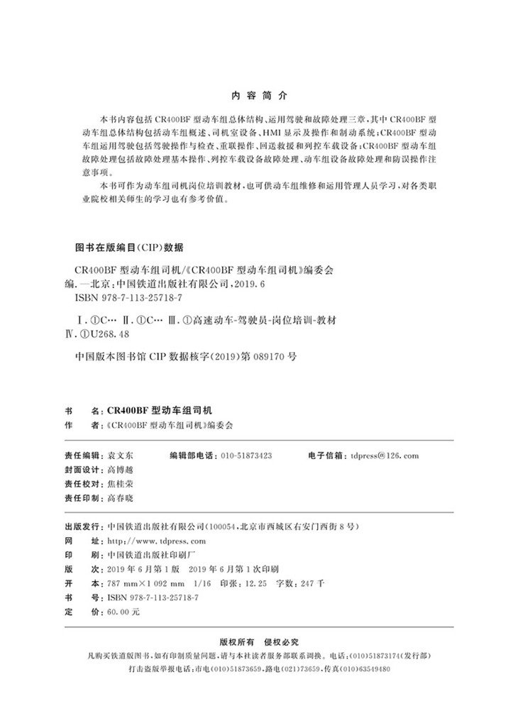 | 为帮助动车组司机及运用管理人员了解和掌握CR400BF型动车组的基本构造原理、常见故障处理,提 高作业人员精准操控、使用该型机车的能力,我们依据现行的规章制度、技术标准及设备使用说明,结合现场实际运用经验,组织编写了«CR400BF型动车组司机». 本书采用章节形式编写,分三章:第一章,CR400BF型动车组总体;第二章,CR400BF型动车组运用驾驶;第 三章,CR400BF 型动车组常见故障处理. 该书重点突出,阐述简明扼要、通俗易懂,是动车组司机及运用管理人员技术培训用教材,亦可作为干部、职工的自学用书. |