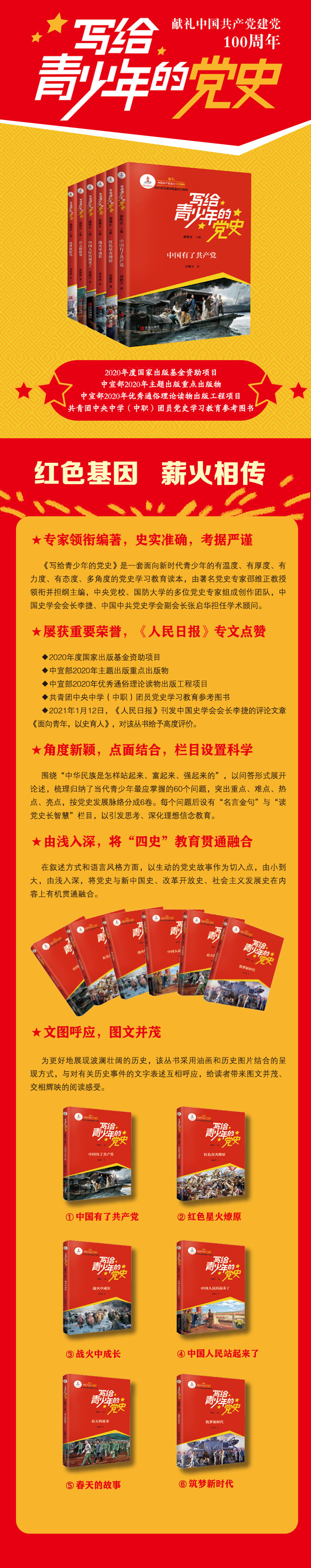 在叙述方式和语言风格方面,丛书努力贴近少年儿童的阅读习惯和接受程度,力求以生动形象的党史故事作为切入点,由小到大,由浅入深,讲清来龙去脉,剖析前因后果,引发思考共鸣,达到以情感人、以理服人。在版式上,坚持图文并茂,强化视觉冲击,增强可读性、趣味性。