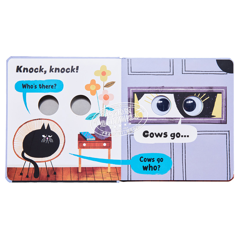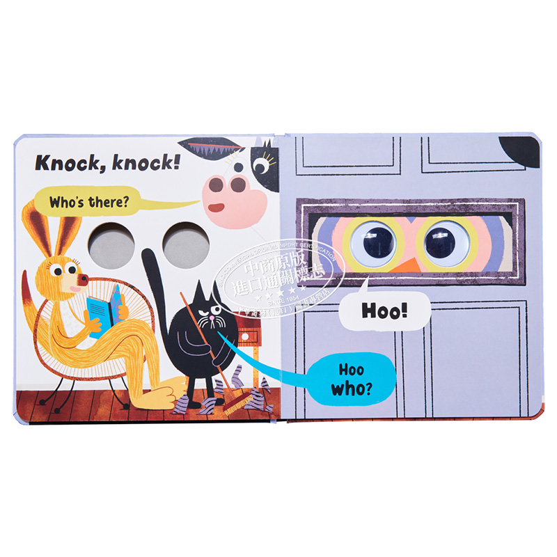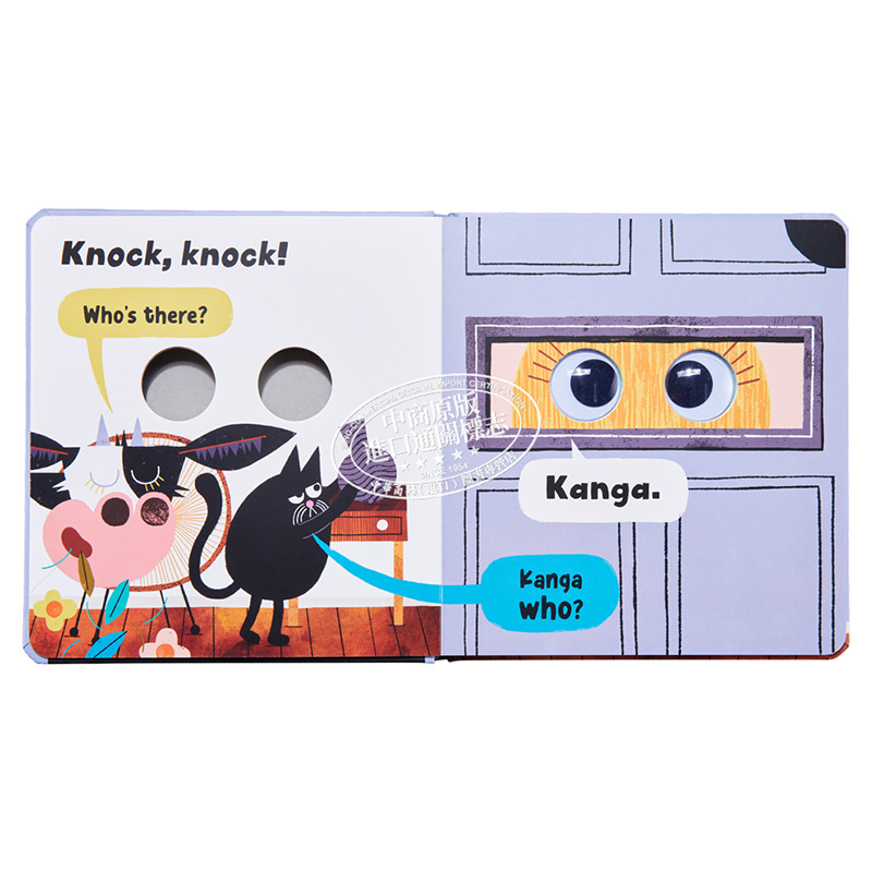 敲门,等待被问到“谁在那里?” 在翻过这一页发现另一只瞪大眼睛的动物之前,在背面有一句妙语。这种简单易懂的形式是对小丑喜剧世界的可爱介绍,您一定会和他们一起开怀大笑!