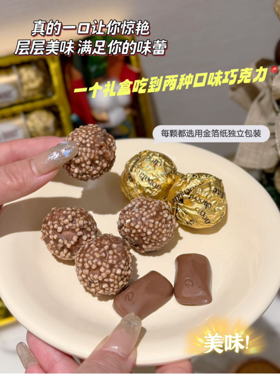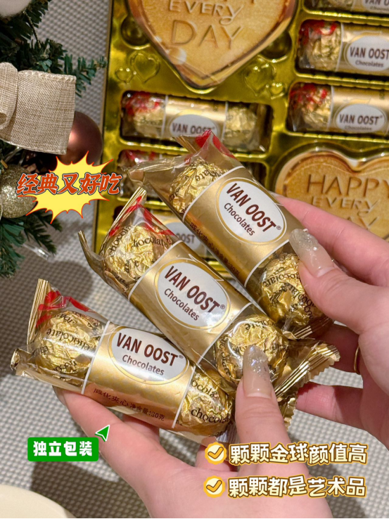 每一颗金球都包裹着浓郁的牛奶巧克力,仿佛是在为你的味蕾带来一场极致的甜蜜礼赞。