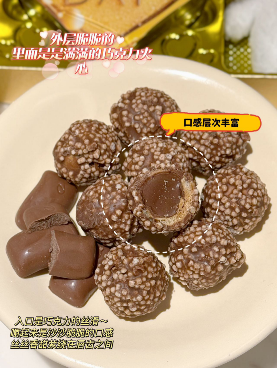 德芙牛奶巧克力的香甜与丝滑交织在一起, 威化金球巧克力的酥脆香浓 每一口都是对味蕾的极致诱惑。
