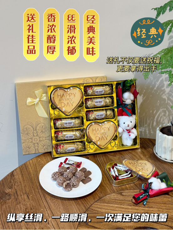 奢华金球,甜蜜礼赞 德芙牛奶巧克力vanoost金球礼盒,以其璀璨夺目的金色外观,象征着奢华与高贵。