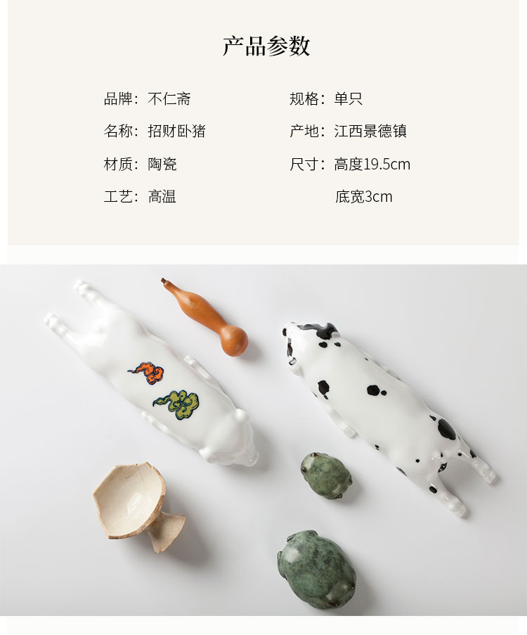 趴猪为手工翻模注浆,釉下五彩手绘加高白釉1300度烧制,可做台面窗台化妆台摆件,也可做文房墨床。1、陶瓷猪增强人际关系 猪的个性不争不抢,非常好相处,所以如果把猪的风水摆件摆放在家中或者办公室中合理的位置,潜移默化间,对于主人的人际关系改善也很有帮助。 但是在摆放的时候需要注意,记得摆放在吉位上,这样功效才能发挥到化。 改善主人急躁的脾气 猪的形象不但是圆滚滚,福气的象征,而且也是忠厚老实的象征。所以如果家中有人脾气比较急躁,遇到事情容易冲动,建议在家中合适位置摆放猪的风水摆件。 2、陶瓷猪求财 一般的祭拜中都有猪的出现,就是取其增进财源的意思,我们可以选择家中或工作场所放置风水猪来旺动财源摆设位置相当重要,基本上除了厕所浴室的位置不宜外,其他皆可,不过还是摆设在财位上。如果为了求财,风水猪的制材以黄金,这样才能完全发挥旺财旺动的能力,假如用陶瓷猪的存钱罐,日日投零钱,如此也能让灵动能力更加旺动,不过切忌不可移动。 3、陶瓷猪转运 陶瓷猪摆件除了吸纳财富这一个本领之外,还能够镇守家宅,催旺福气,保佑家人安康,这是因为猪的体质强,通常少生病,故而被成为安康之兽。镇守家宅是因为猪体积大、属重量级,有镇宅辟邪的功效。催旺福气则是因为猪能吃能睡,心宽体胖。陶瓷猪的寓意: 1、陶瓷猪的寓意 猪,在中国传统文化历史上势财富、吉祥的象征。“家”字的宝盖象征房屋,下部”“亥”就是猪。房屋加上“亥”字(财富)等于家。所以有家的地方就应该有庇佑猪。猪的外表胖胖圆圆的,是传统所认为的财富、福气的象征,所以人们在打造风水,选用助运饰品的时候就对陶瓷猪特别的青睐。 2、小孩挑食用陶瓷猪 如果家里小孩有挑食的习惯,或者甚至还有营养不良的,这个问题着实让大人感到头痛。不妨试试可以在餐厅里对着小孩的地方摆放风水猪摆件,因为我们都知道,猪的食欲是非常好的,对于食物也从不挑剔,有什么吃什么,如果这样摆放的话,小孩挑食不长个的情况也能得到缓解。1、陶瓷猪增强人际关系 猪的个性不争不抢,非常好相处,所以如果把猪的风水摆件摆放在家中或者办公室中合理的位置,潜移默化间,对于主人的人际关系改善也很有帮助。 但是在摆放的时候需要注意,记得摆放在吉位上,这样功效才能发挥到化。 改善主人急躁的脾气 猪的形象不但是圆滚滚,福气的象征,而且也是忠厚老实的象征。所以如果家中有人脾气比较急躁,遇到事情容易冲动,建议在家中合适位置摆放猪的风水摆件。2、陶瓷猪求财 一般的祭拜中都有猪的出现,就是取其增进财源的意思,我们可以选择家中或工作场所放置风水猪来旺动财源摆设位置相当重要,基本上除了厕所浴室的位置不宜外,其他皆可,不过还是摆设在财位上。如果为了求财,风水猪的制材以黄金,这样才能完全发挥旺财旺动的能力,假如用陶瓷猪的存钱罐,日日投零钱,如此也能让灵动能力更加旺动,不过切忌不可移动。3、陶瓷猪转运 陶瓷猪摆件除了吸纳财富这一个本领之外,还能够镇守家宅,催旺福气,保佑家人安康,这是因为猪的体质强,通常少生病,故而被成为安康之兽。镇守家宅是因为猪体积大、属重量级,有镇宅辟邪的功效。催旺福气则是因为猪能吃能睡,心宽体胖。陶瓷猪的寓意: 1、陶瓷猪的寓意 猪,在中国传统文化历史上势财富、吉祥的象征。“家”字的宝盖象征房屋,下部”“亥”就是猪。房屋加上“亥”字(财富)等于家。所以有家的地方就应该有庇佑猪。猪的外表胖胖圆圆的,是传统所认为的财富、福气的象征,所以人们在打造风水,选用助运饰品的时候就对陶瓷猪特别的青睐。 2、小孩挑食用陶瓷猪 如果家里小孩有挑食的习惯,或者甚至还有营养不良的,这个问题着实让大人感到头痛。不妨试试可以在餐厅里对着小孩的地方摆放风水猪摆件,因为我们都知道,猪的食欲是非常好的,对于食物也从不挑剔,有什么吃什么,如果这样摆放的话,小孩挑食不长个的情况也能得到缓解。