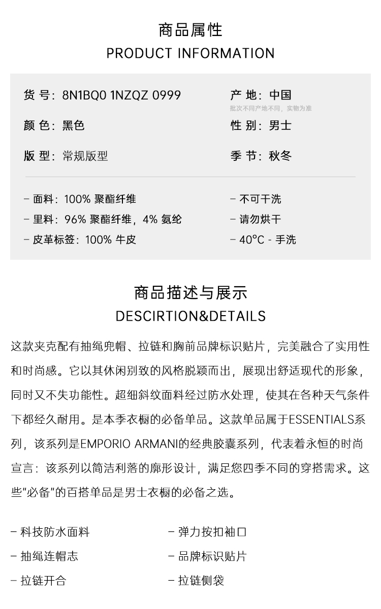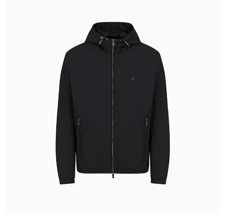 【五】EMPORIO ARMANI 阿玛尼 男士带兜帽和徽标贴片的防水尼龙外套 黑色 8N1BQ0 1NZQZ 0999