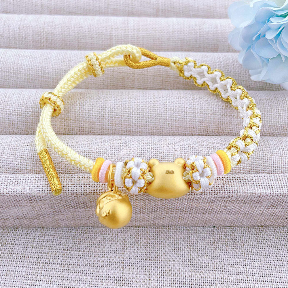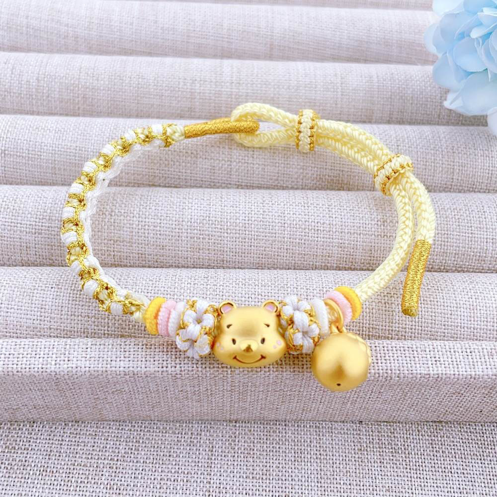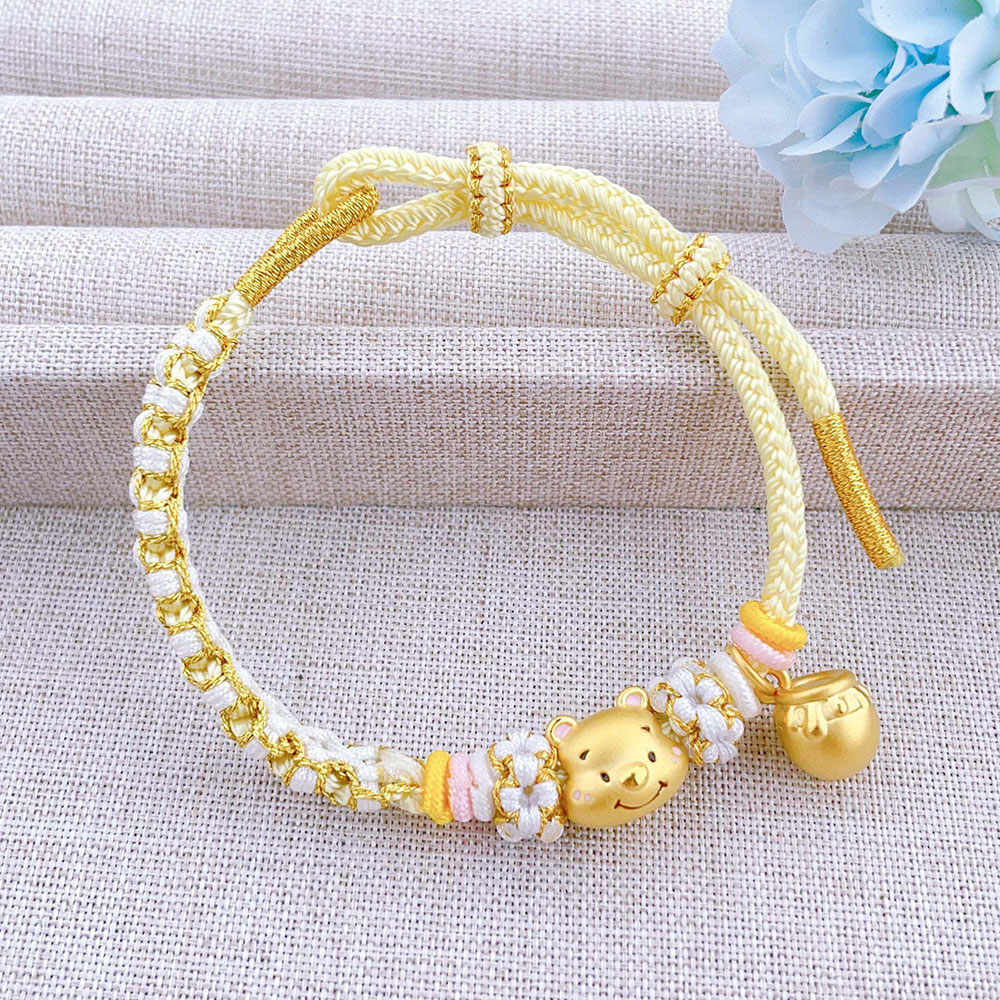 【限时7.5折】【定价黄金】足金 #卡通 3D硬金烤漆小熊维尼蜂蜜罐吊饰米黄色绳卡通编绳调节手链成品手串(AJ3DSC00237)(预售产品下单后不退款不退货不换货不补差价)