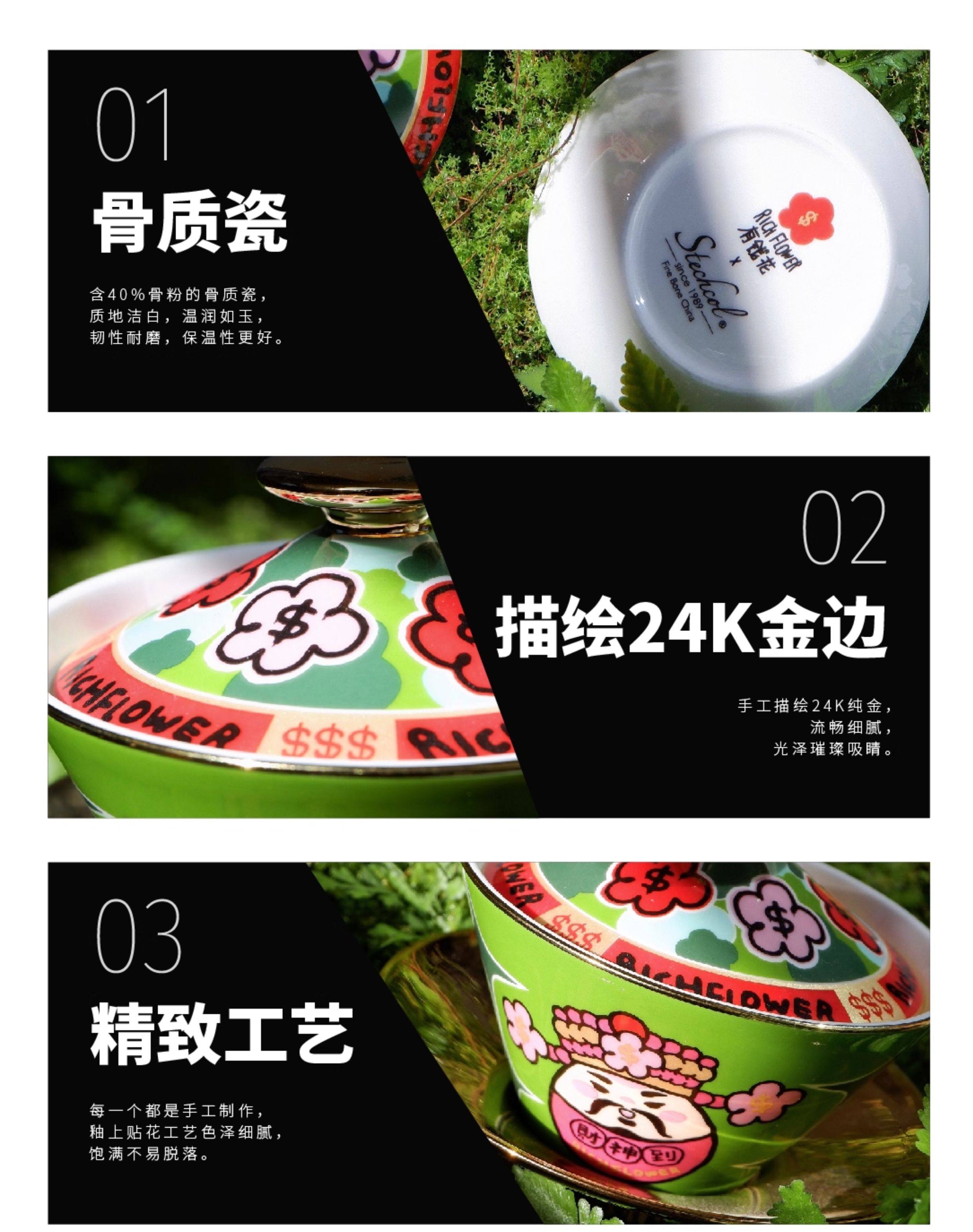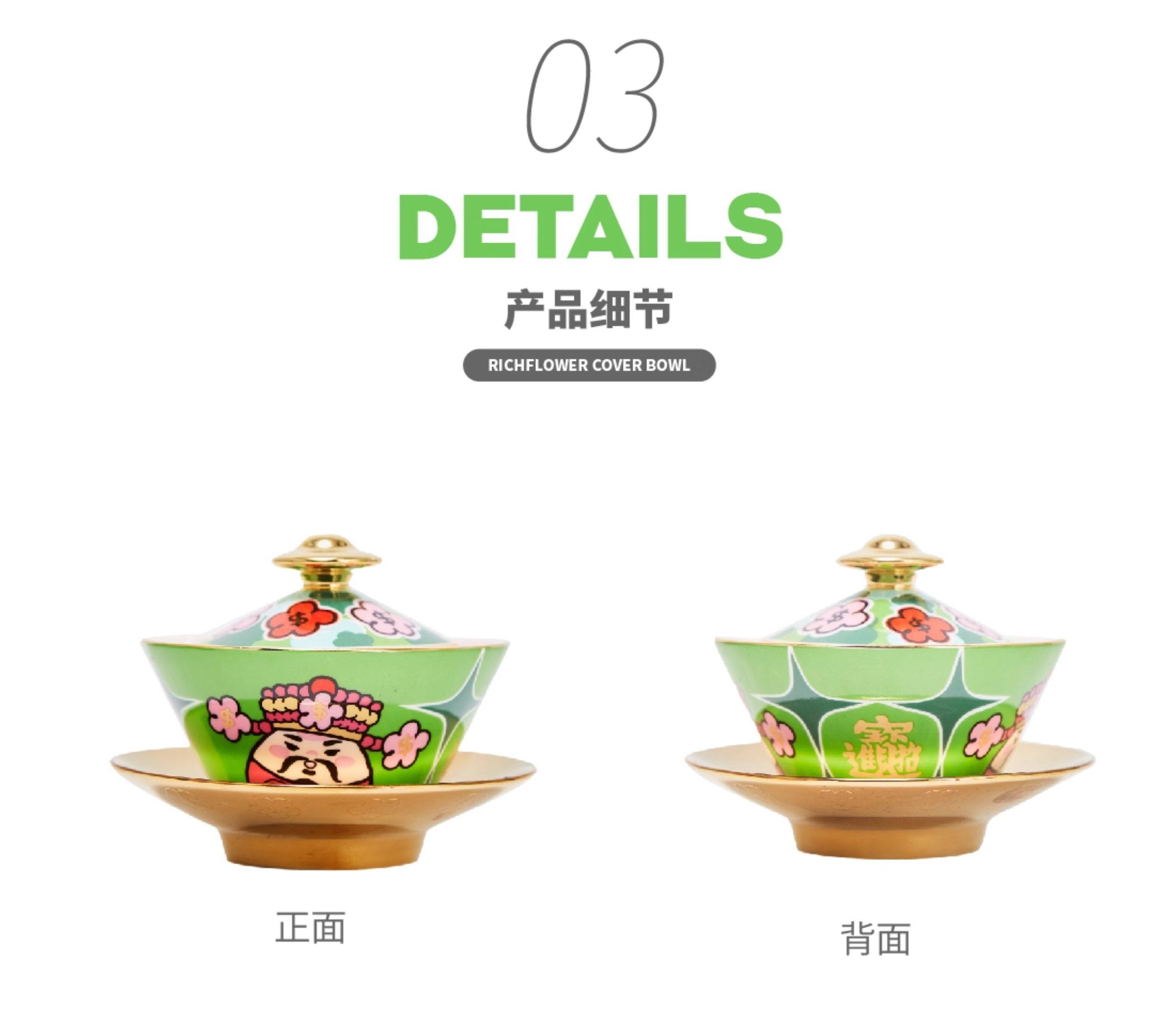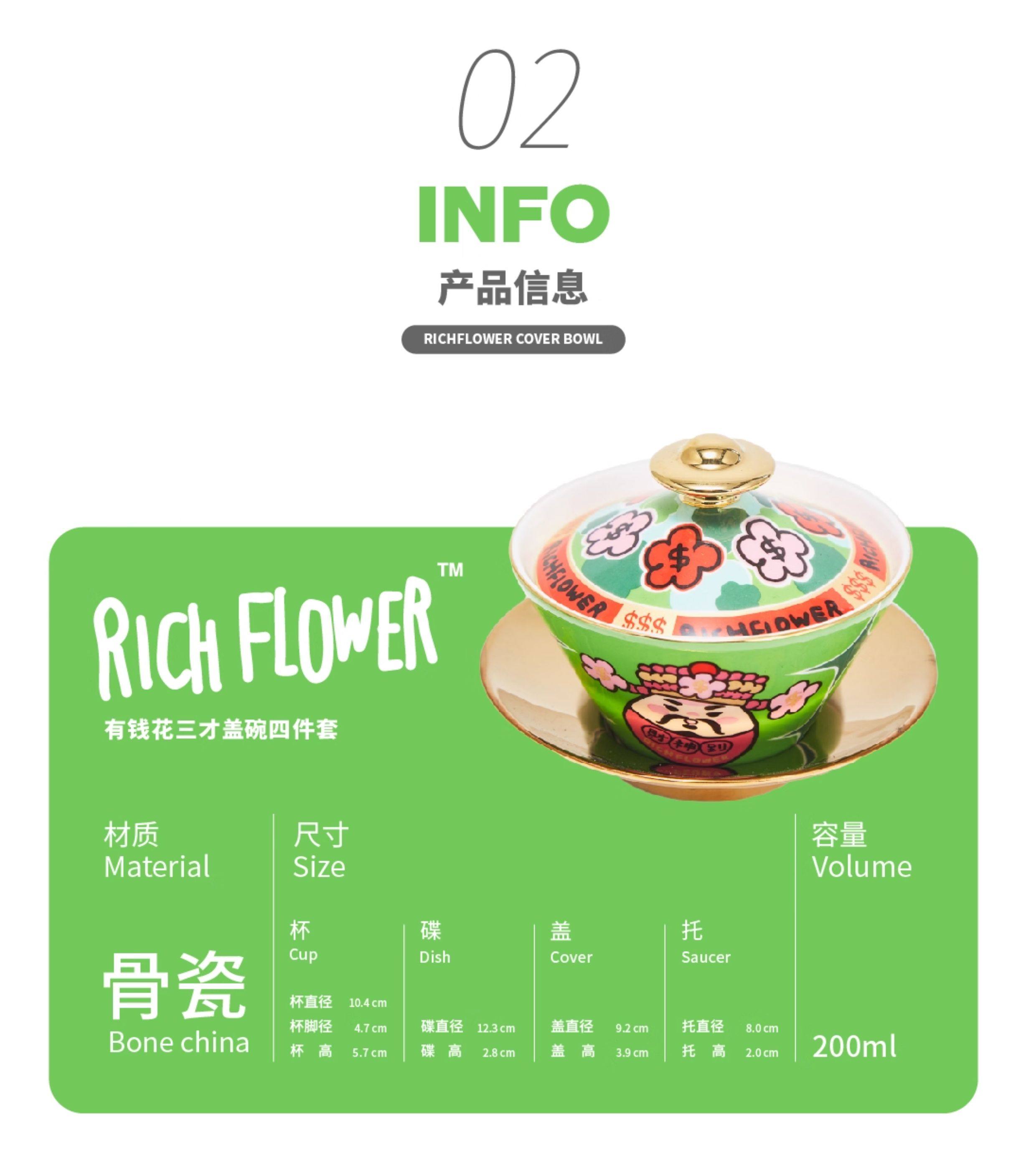 RICH FLOWER 有钱花 三才盖碗 创意防烫功夫泡茶碗礼品四件套
