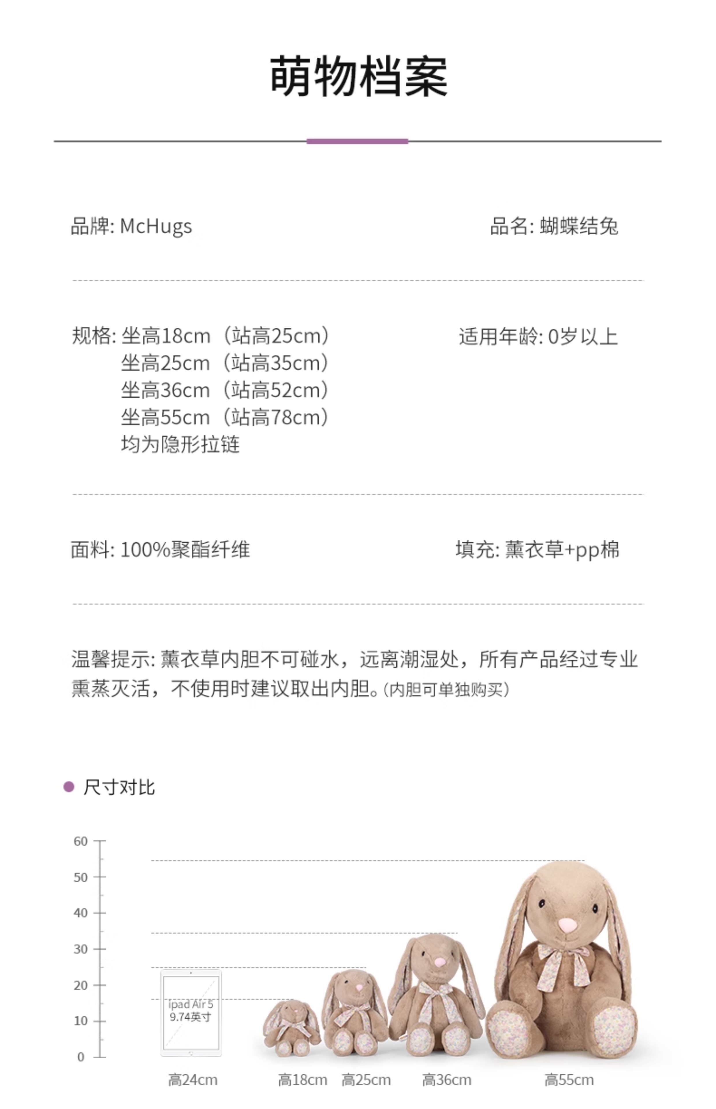 McHugs 蝴蝶结兔(中号) 毕业礼物玩偶睡觉抱香薰毛绒玩具娃娃生日礼物 25cm