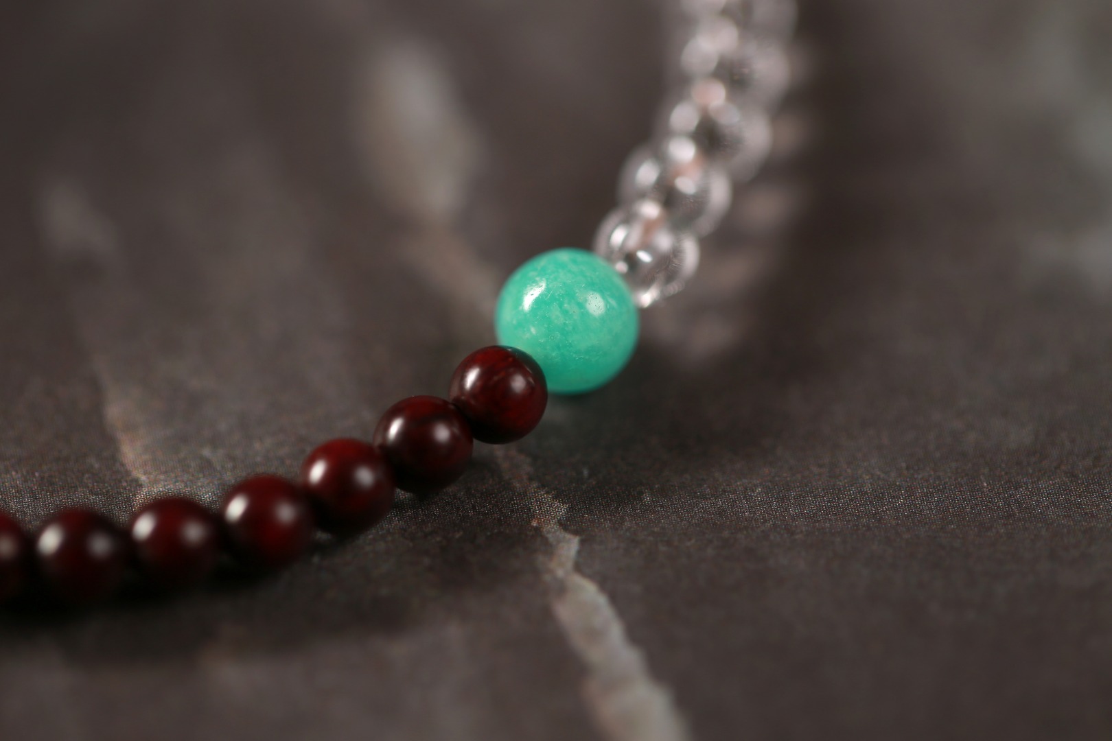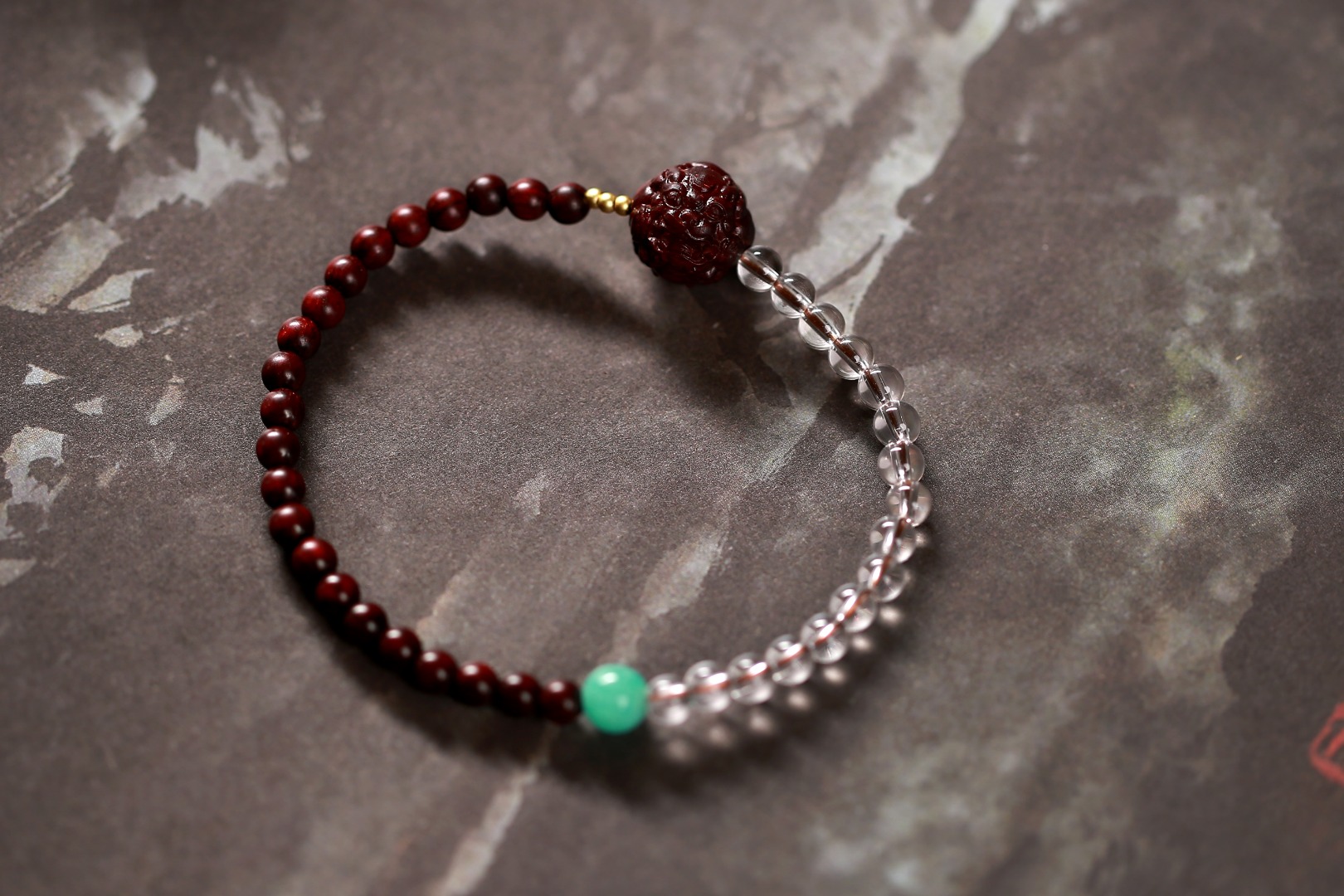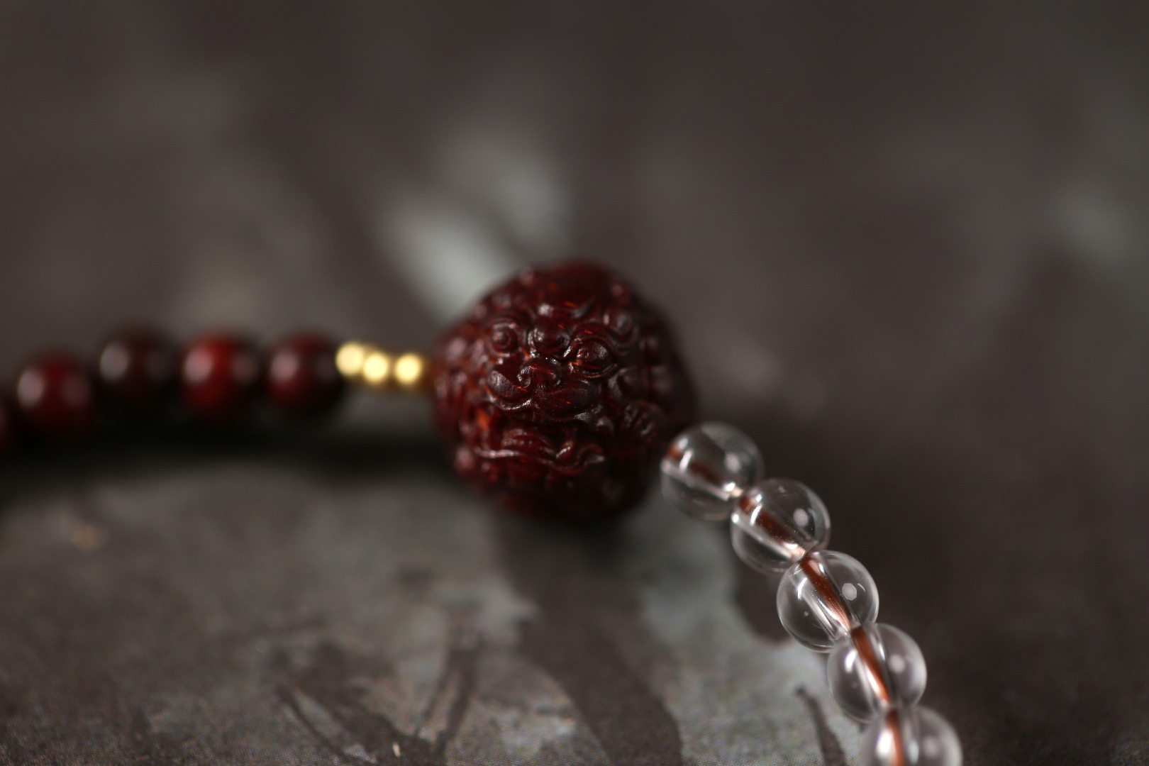 以珠串为载体,将紫檀与白水晶进行结合,通过工艺和文化体现,将器物内化于日常,貔貅圆鼓饱满,精工考究,象征助运招财。