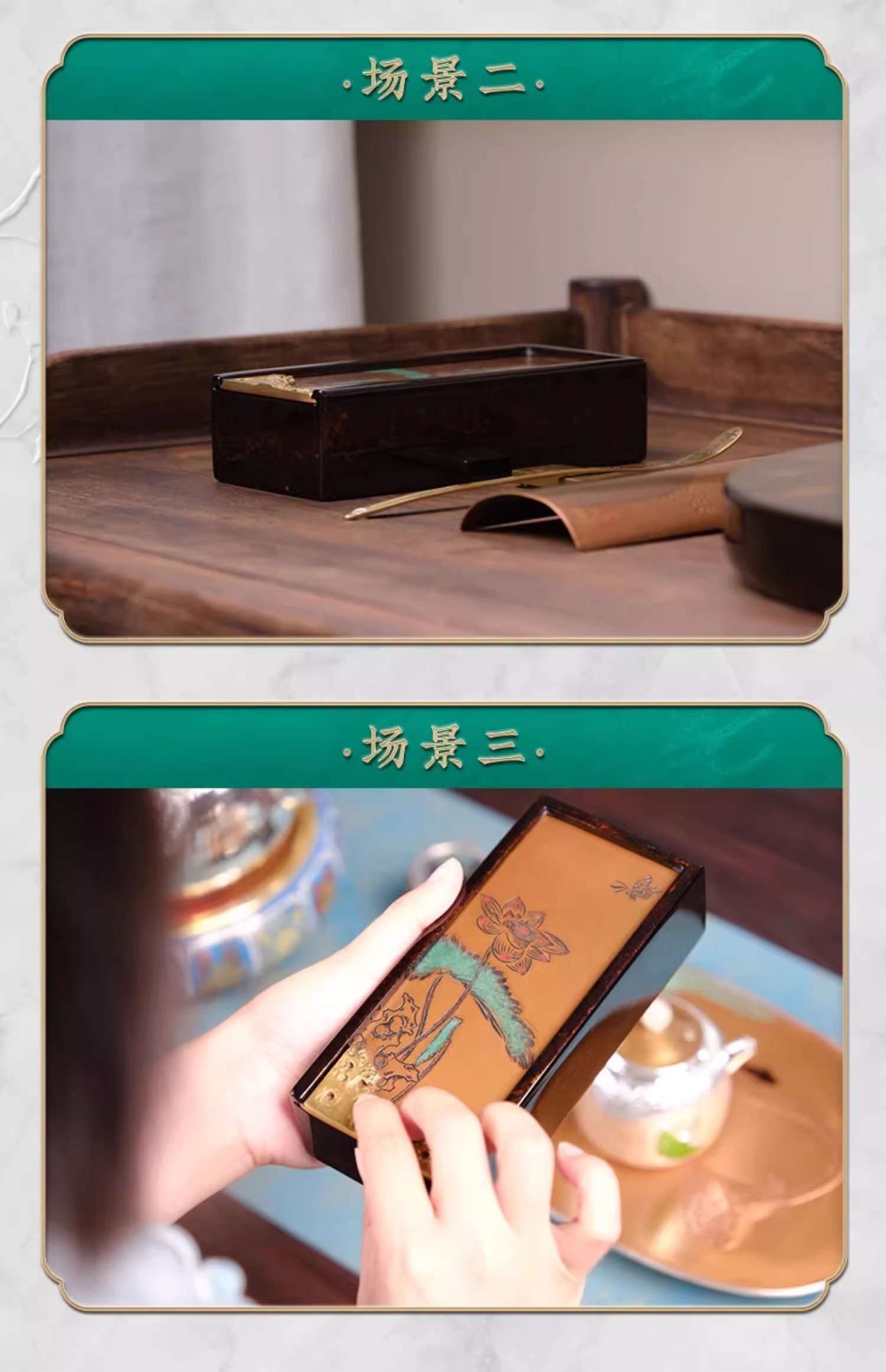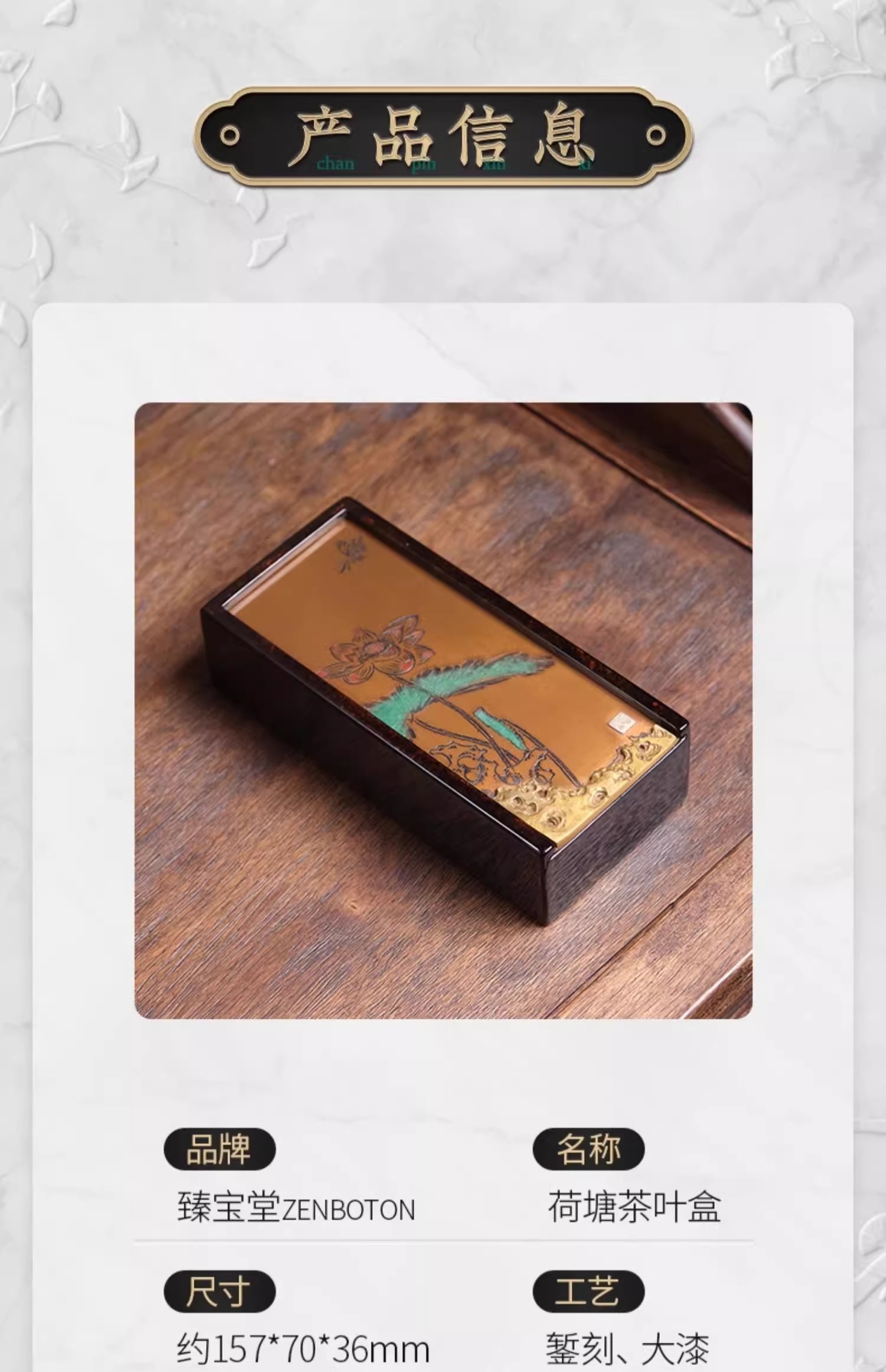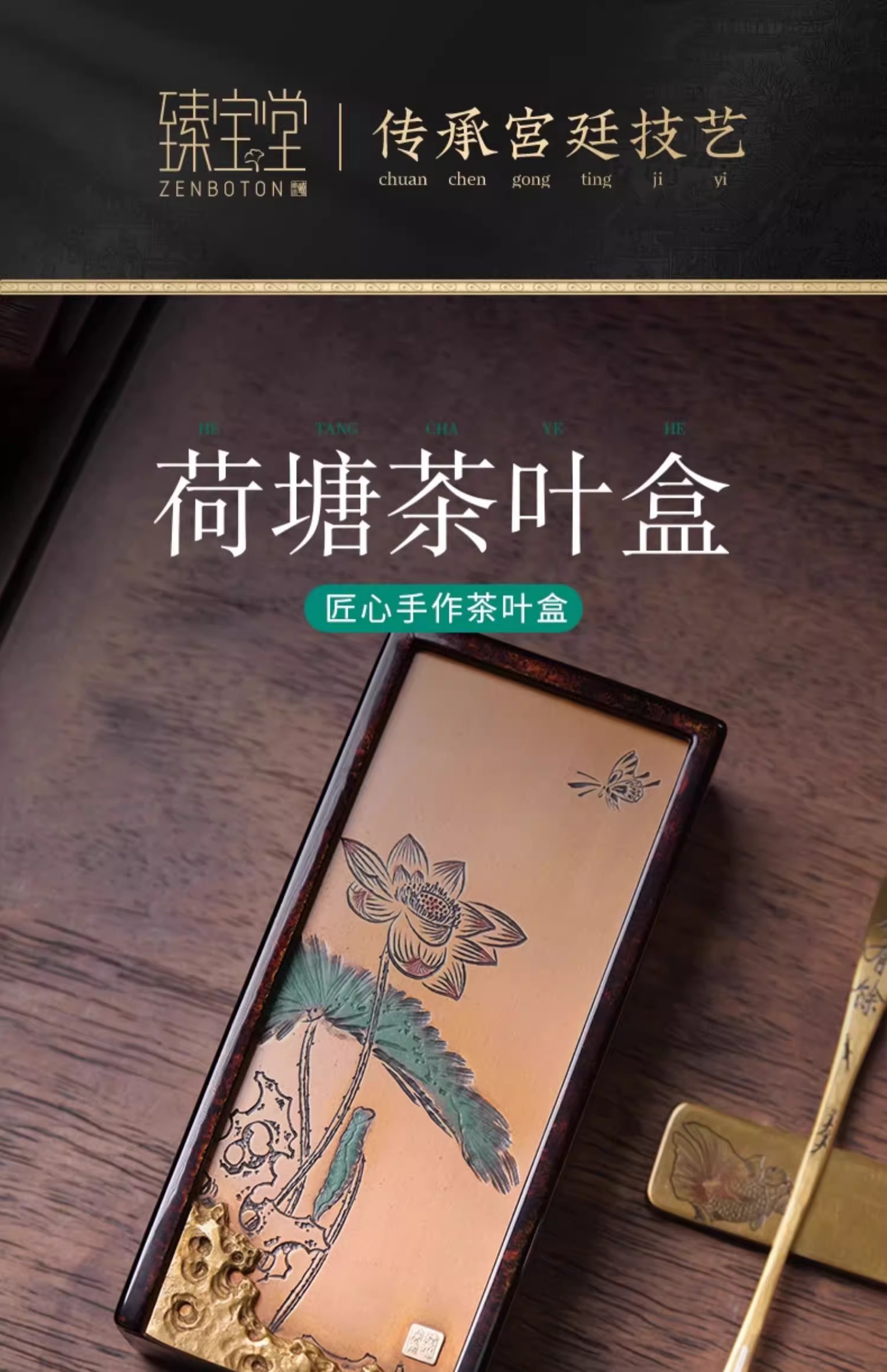 臻宝堂大漆茶叶盒纯手工雕刻荷塘抽拉式方形便携泡装高档茶具空盒荷塘茶叶盒