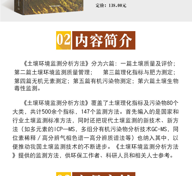 《土壤环境监测分析方法》分为六篇:一篇土壤质量及评价;第二篇土壤环境监测质量管理;第三篇理化指标与肥力测定;第四篇无机元素测定;第五篇有机污染物测定;第六篇土壤生物毒性监测。《土壤环境监测分析方法》覆盖了土壤理化指标及污染物80个大类,共计500余个指标,147个监测方法。首先编入的是国家和行业土壤监测标准方法,同时还把现代土壤监测的新技术、新方法(如多元素的ICP—MS,多组分有机污染物分析技术GC-MS,同位素稀释/高分辨气相色谱一高分辨质谱法等)也纳入其中,以便推动我国土壤监测技术的不断进步。《土壤环境监测分析方法》提供的监测方法,供环保工作者、科研人员和相关人士参考。
