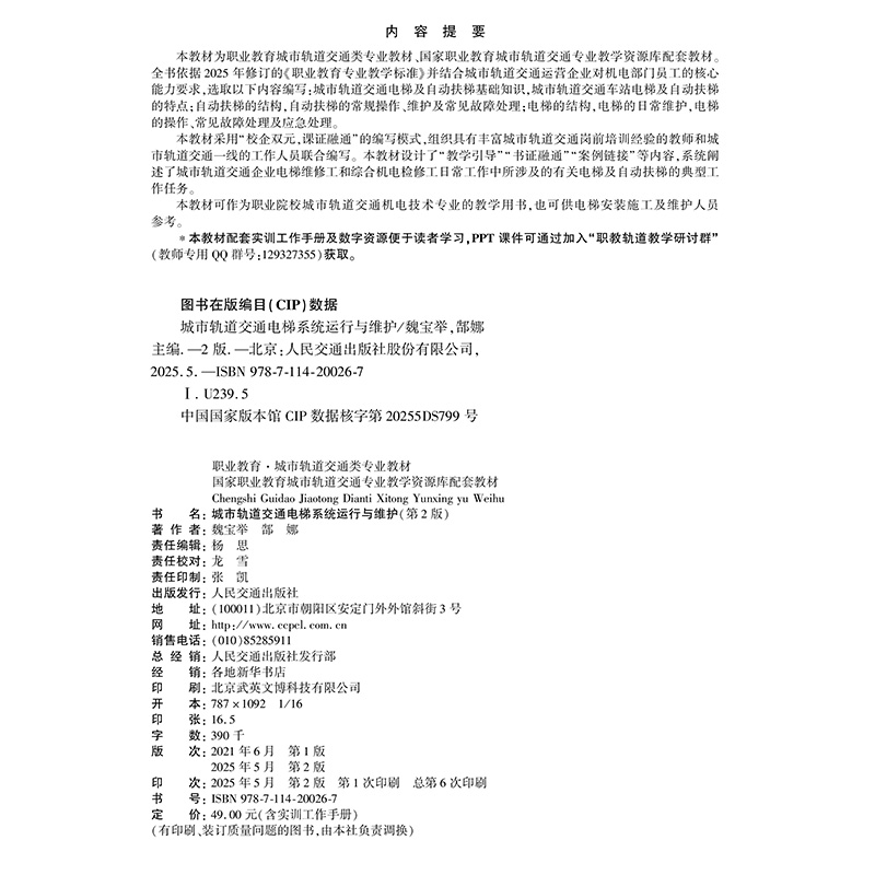 书名:城市轨道交通电梯系统运行与维护(第2版)