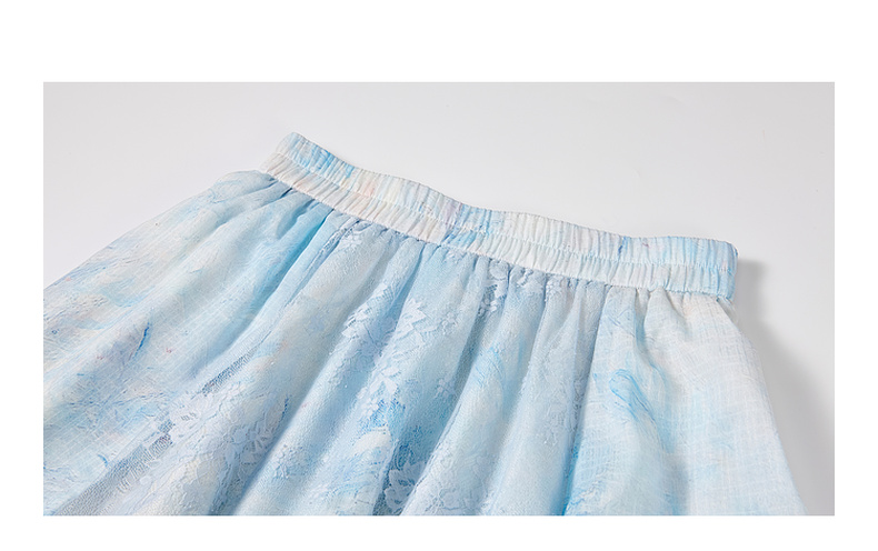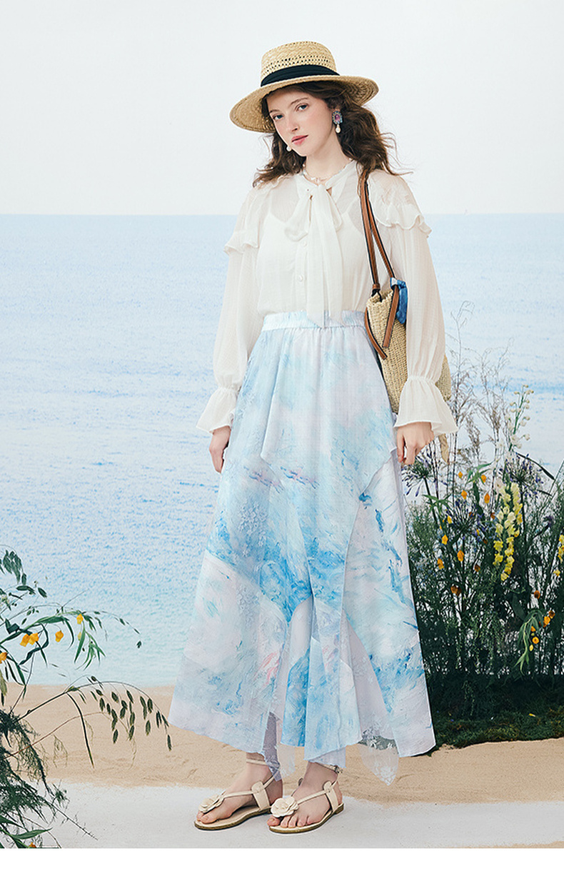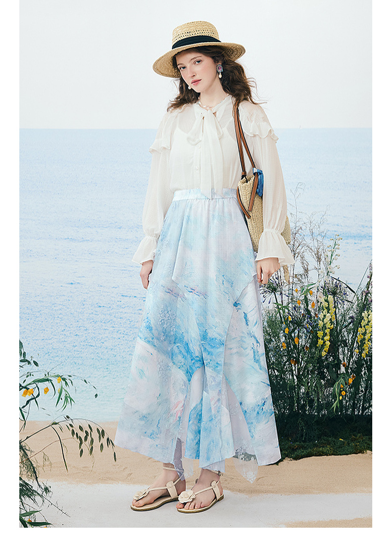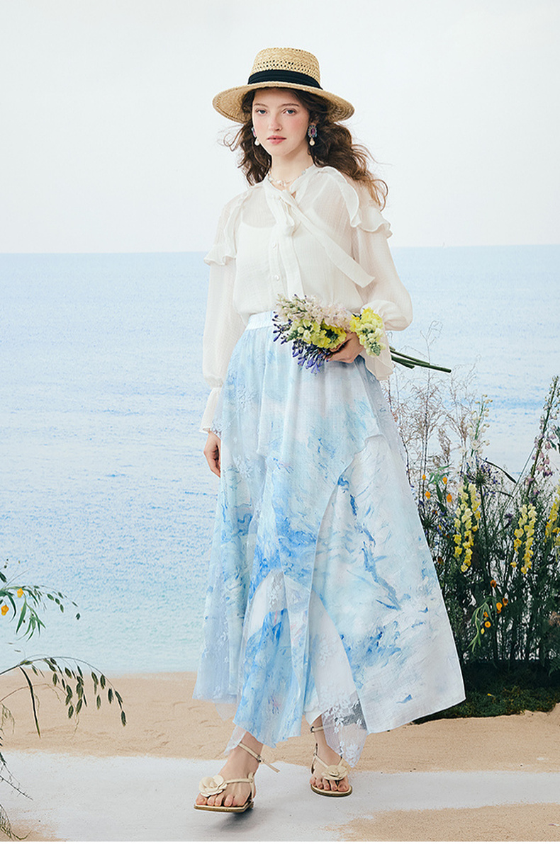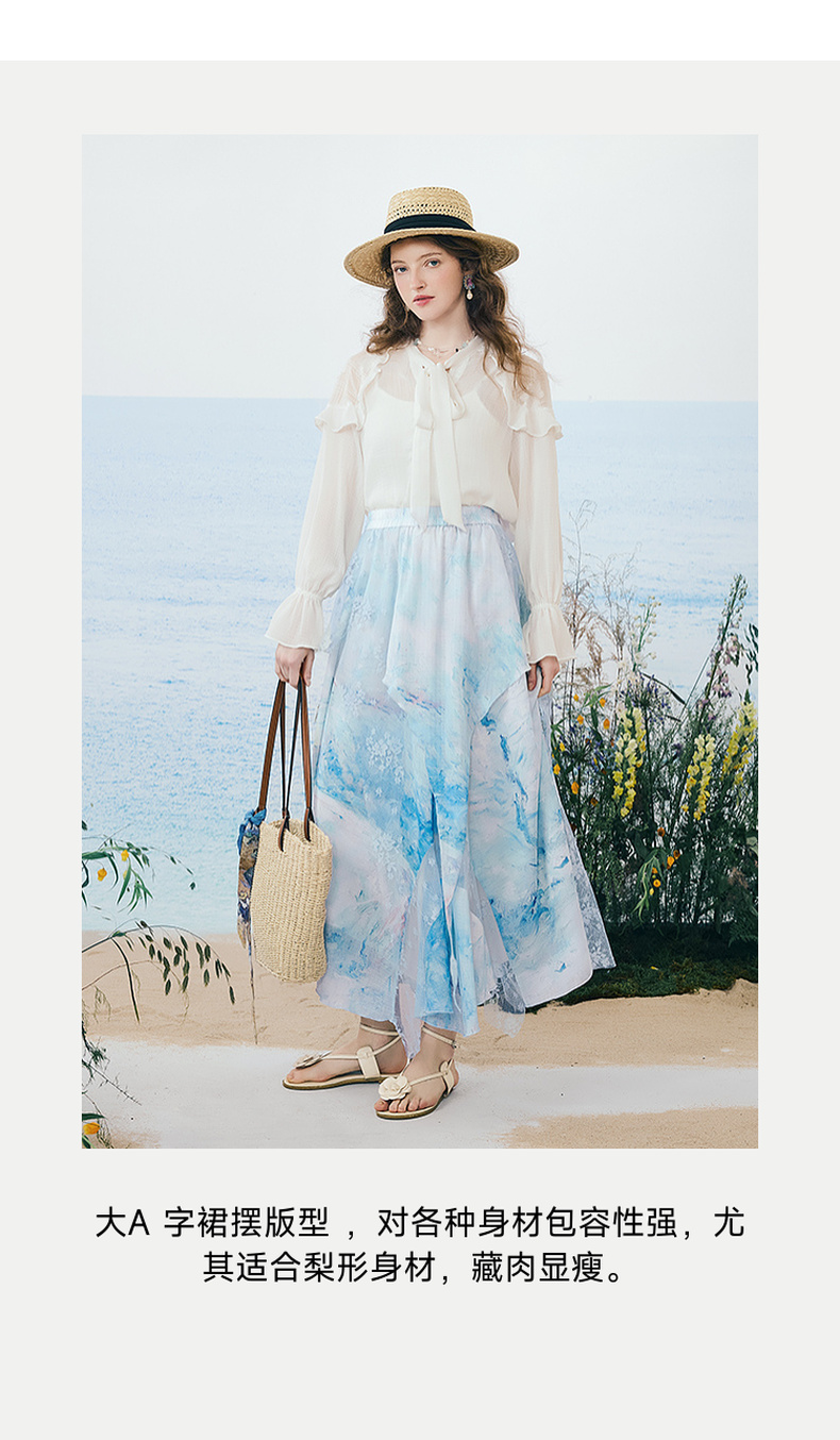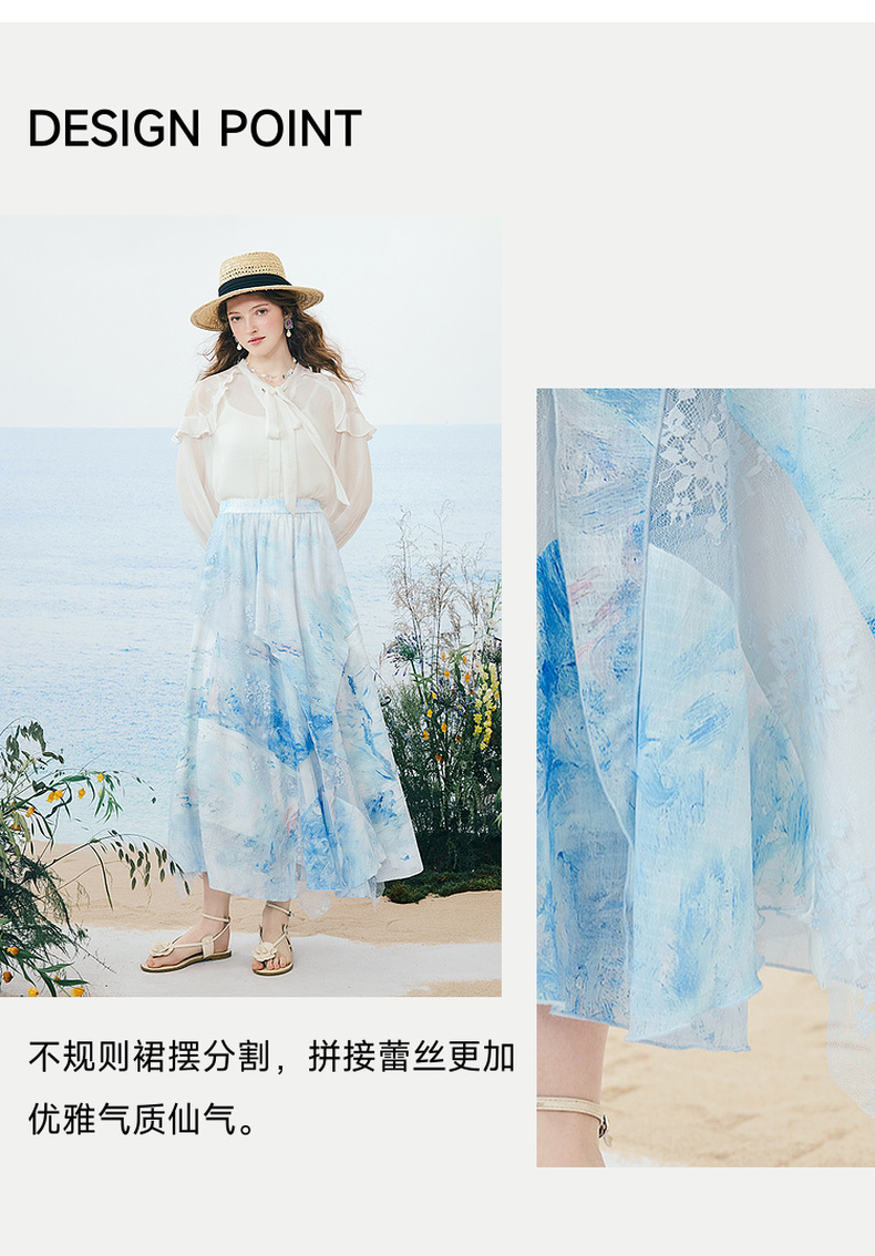 两三事沁凉海滩2025夏新款温柔风蕾丝拼接印花高腰半身裙飘逸长裙